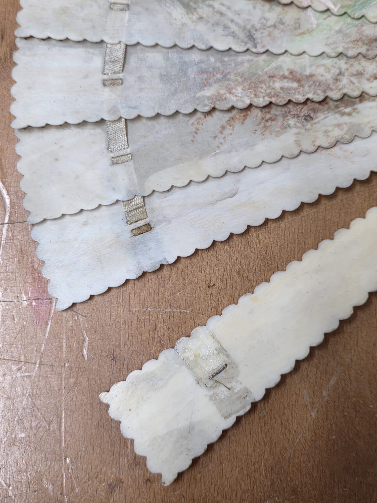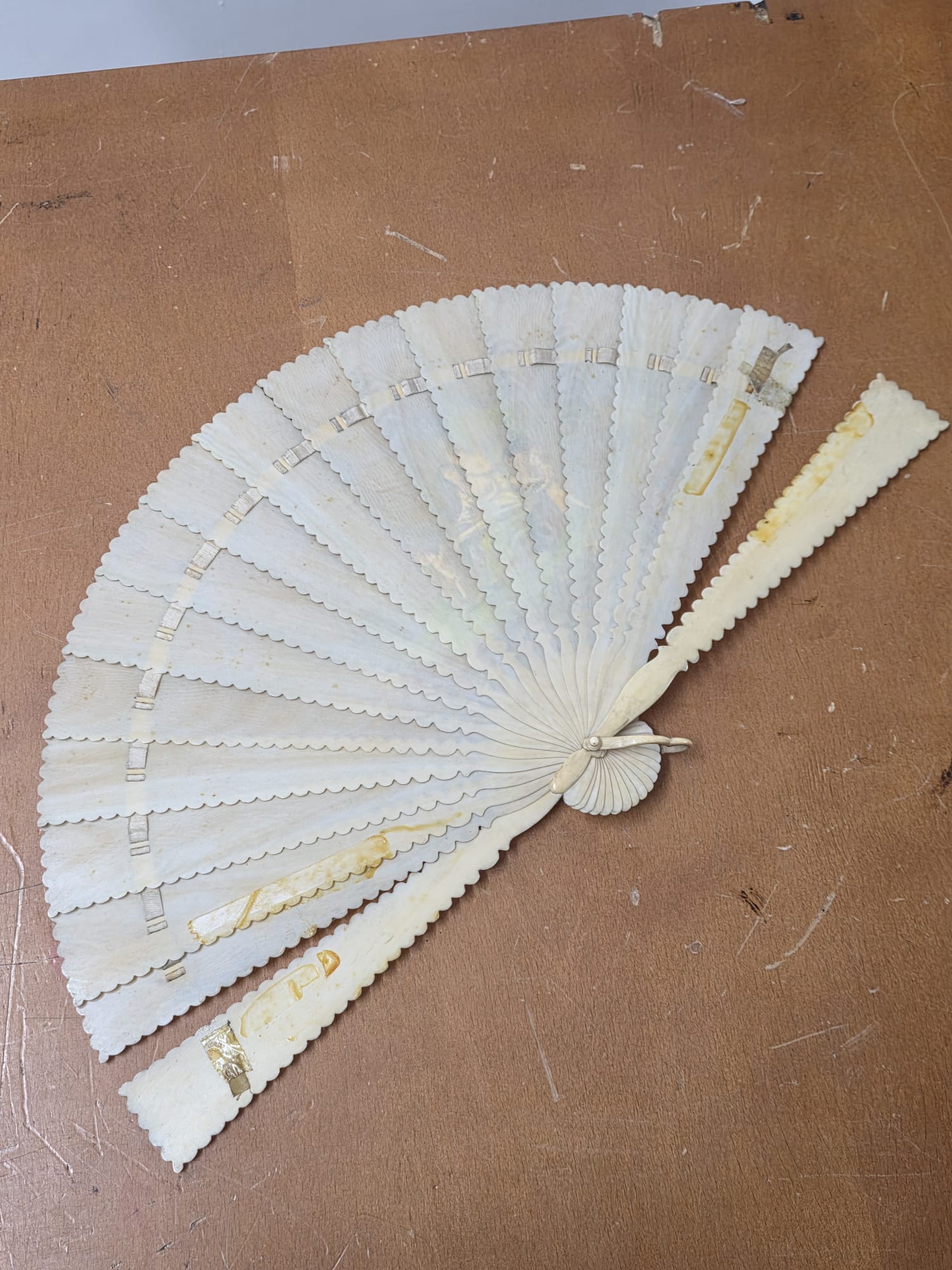 El nácar muestra su iridiscencia natural, con variaciones de tono propias del material y del paso del tiempo. El varillaje conserva el elegante borde ondulado característico y el clavillo original. Se aprecia la estructura tradicional con pasadores textiles antiguos que unen el país al varillaje.