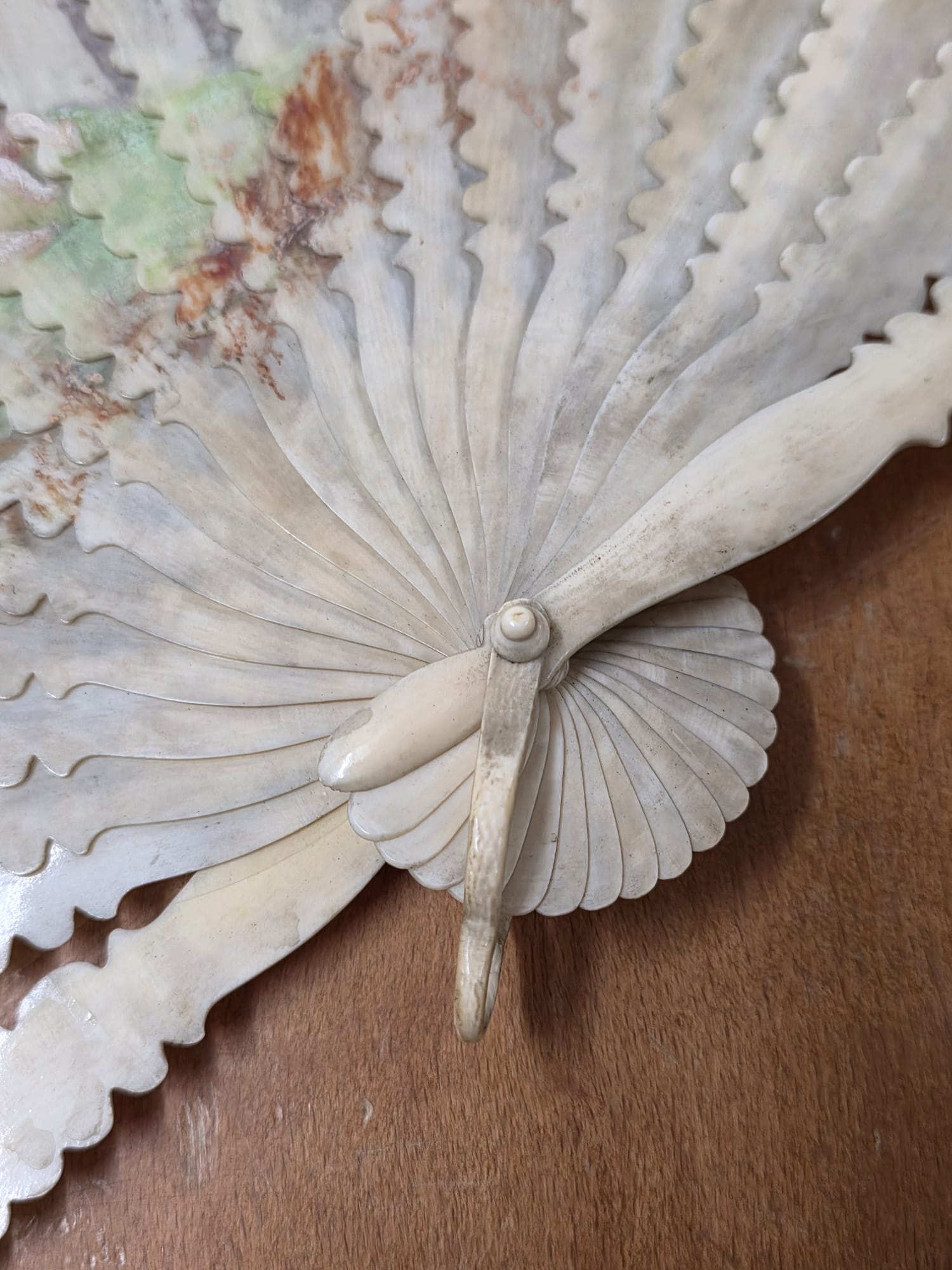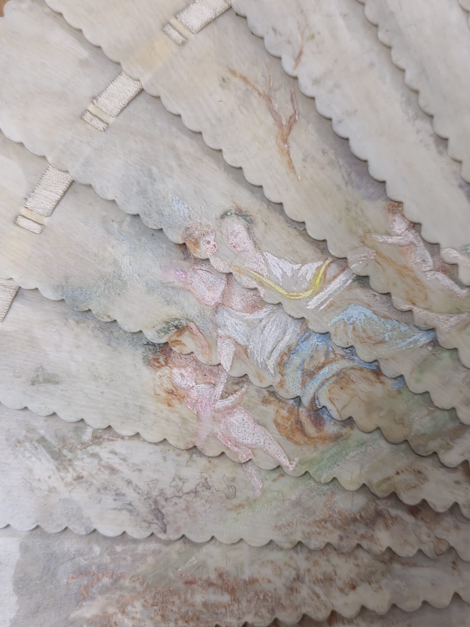 REF: 12131 – Abanico antiguo realizado en nácar natural, con varillaje finamente recortado y país decorado a mano con una delicada escena de querubines alados, de inspiración clásica y romántica. La pintura presenta suaves tonos pastel —rosados, azules y verdes— aplicados con trazo artesanal, lo que confiere a la pieza un carácter único y poético.