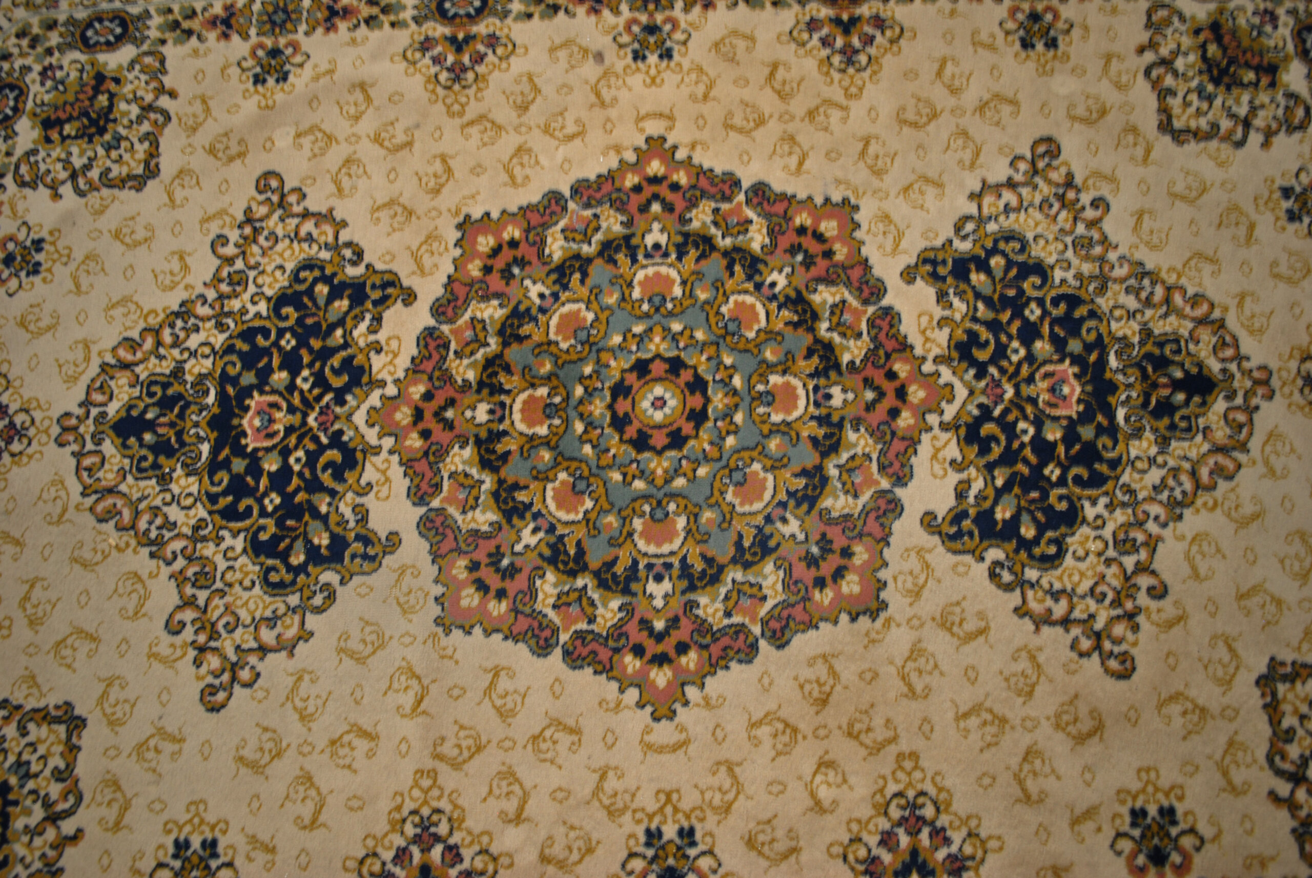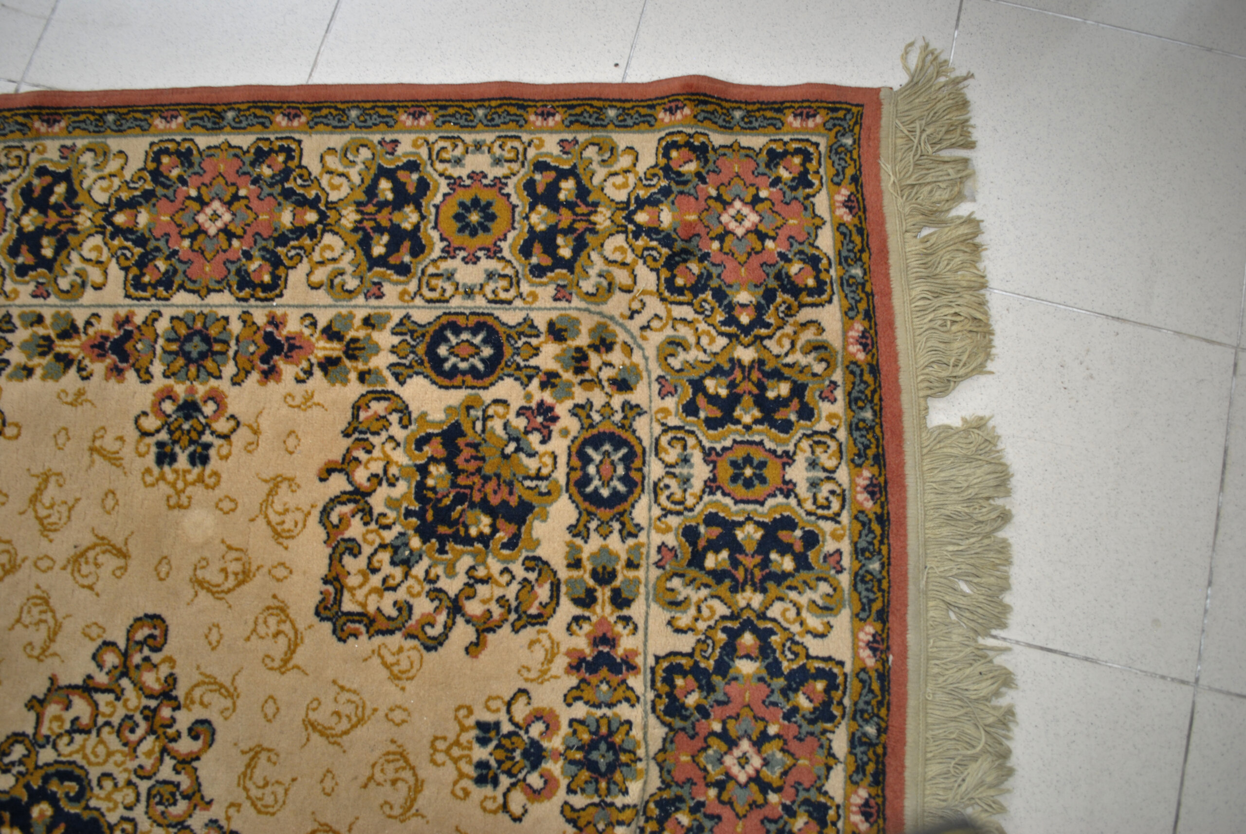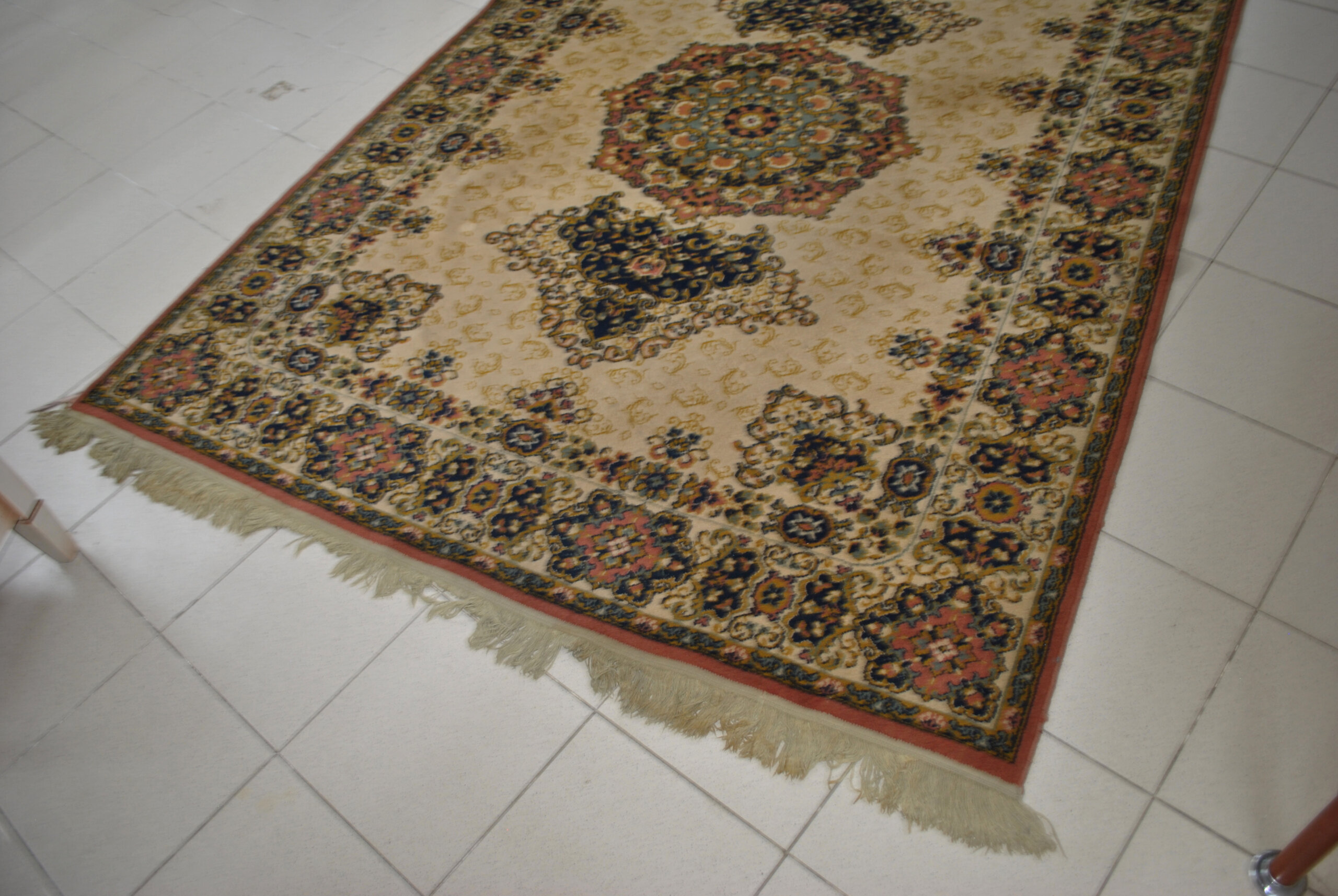 REF: 11916 – Elegante alfombra de estilo oriental con un refinado diseño de inspiración persa, elaborada con motivos geométricos y florales en una composición simétrica centrada por un medallón octogonal. Los colores predominantes son beige, verde, azul marino, terracota y tonos dorados, creando una armoniosa combinación que aporta calidez y distinción a cualquier ambiente. El borde presenta una cenefa ornamentada con patrones florales repetidos y detalles enmarcados por franjas decorativas, característica del estilo tradicional persa. Los flecos en los extremos añaden un acabado clásico y artesanal. Su textura suave y su confección resistente la hacen ideal tanto para espacios residenciales como para oficinas o salones.