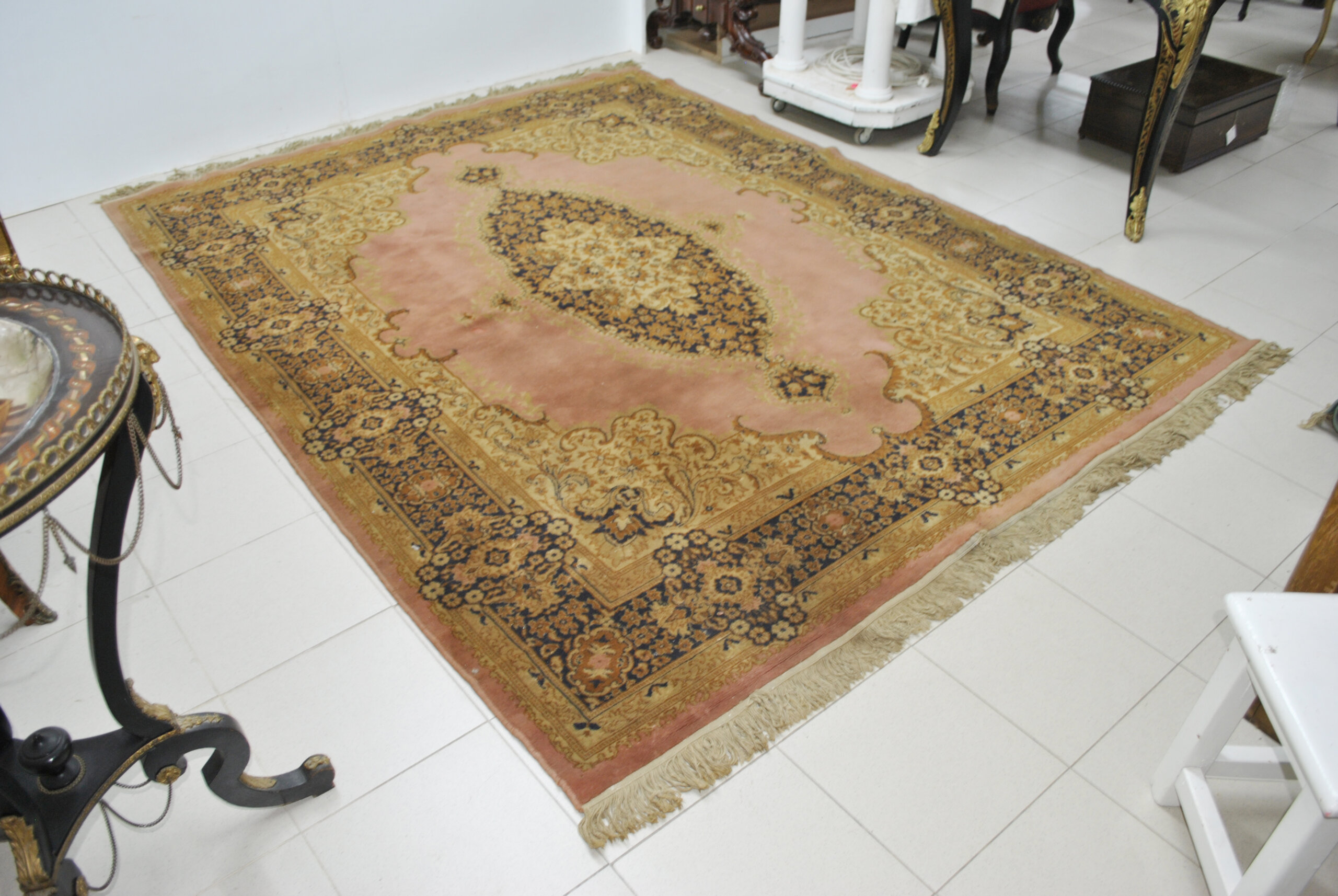 REF: 11975 – Preciosa alfombra oriental de diseño clásico, confeccionada artesanalmente con lana de alta calidad y tonalidades cálidas que aportan elegancia y confort a cualquier espacio. Presenta un diseño tradicional con medallón central en tonos azul oscuro y dorado sobre un fondo rosado suave, enmarcado por una cenefa ornamentada con motivos florales y geométricos que combinan beige, negro y ocre, creando un contraste equilibrado y sofisticado.