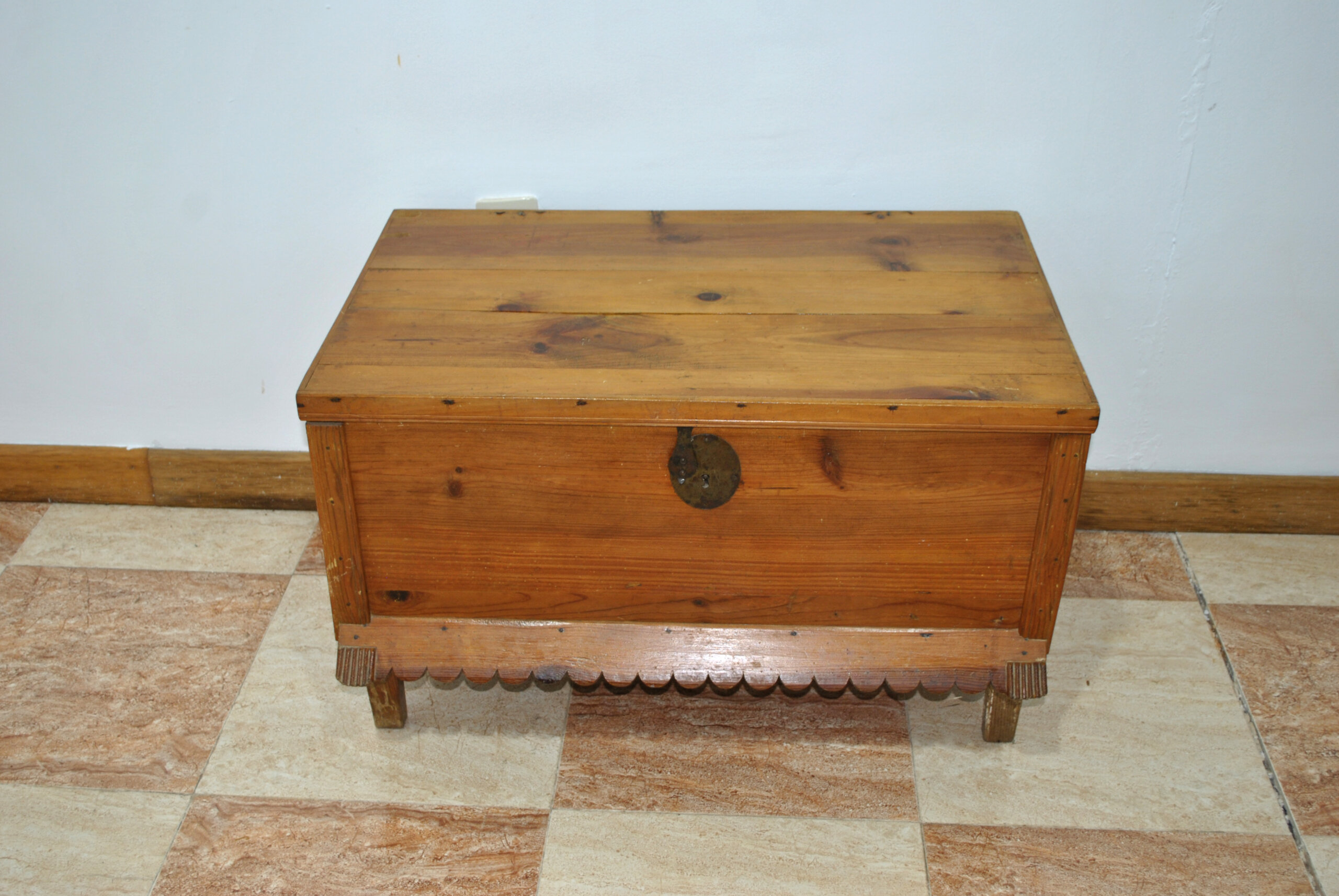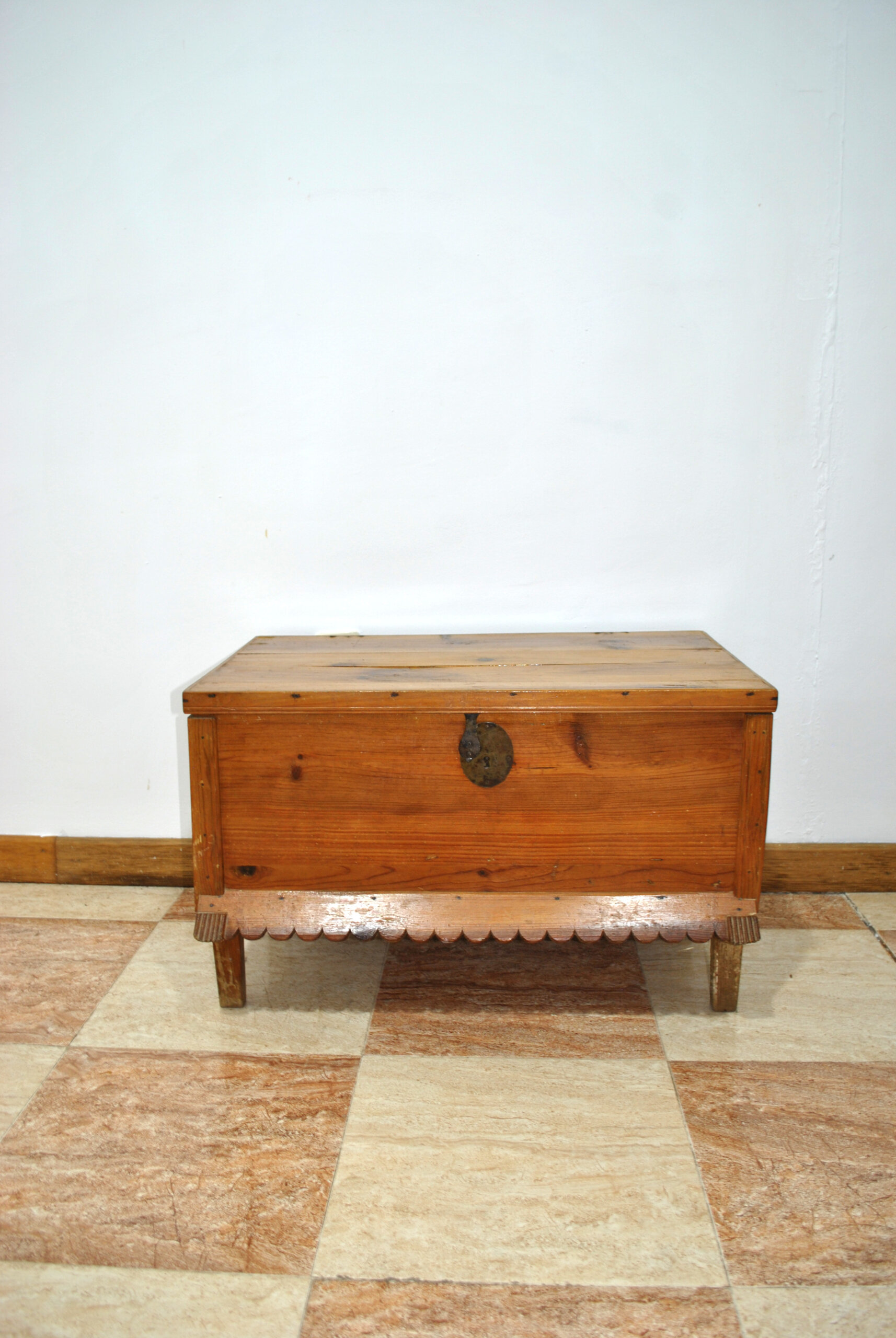 Dispone de tapa abatible superior y cerradura metálica antigua en el frontal, conservando su aspecto original. La parte inferior está decorada con un recorte ondulado tallado, detalle que aporta un toque decorativo al conjunto.