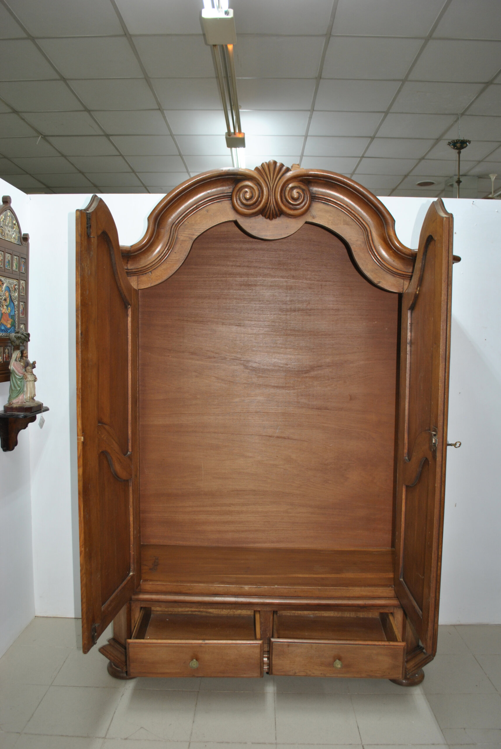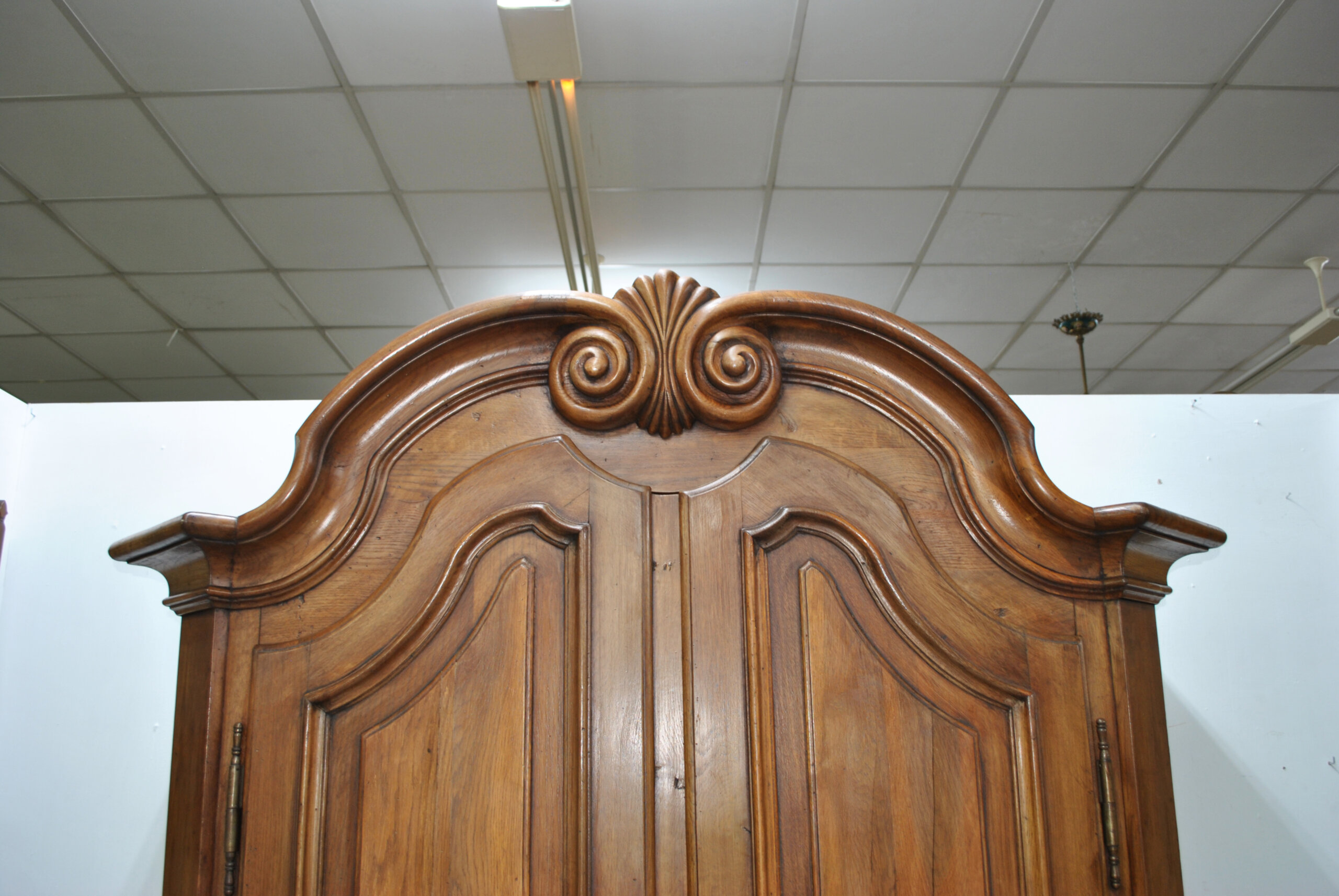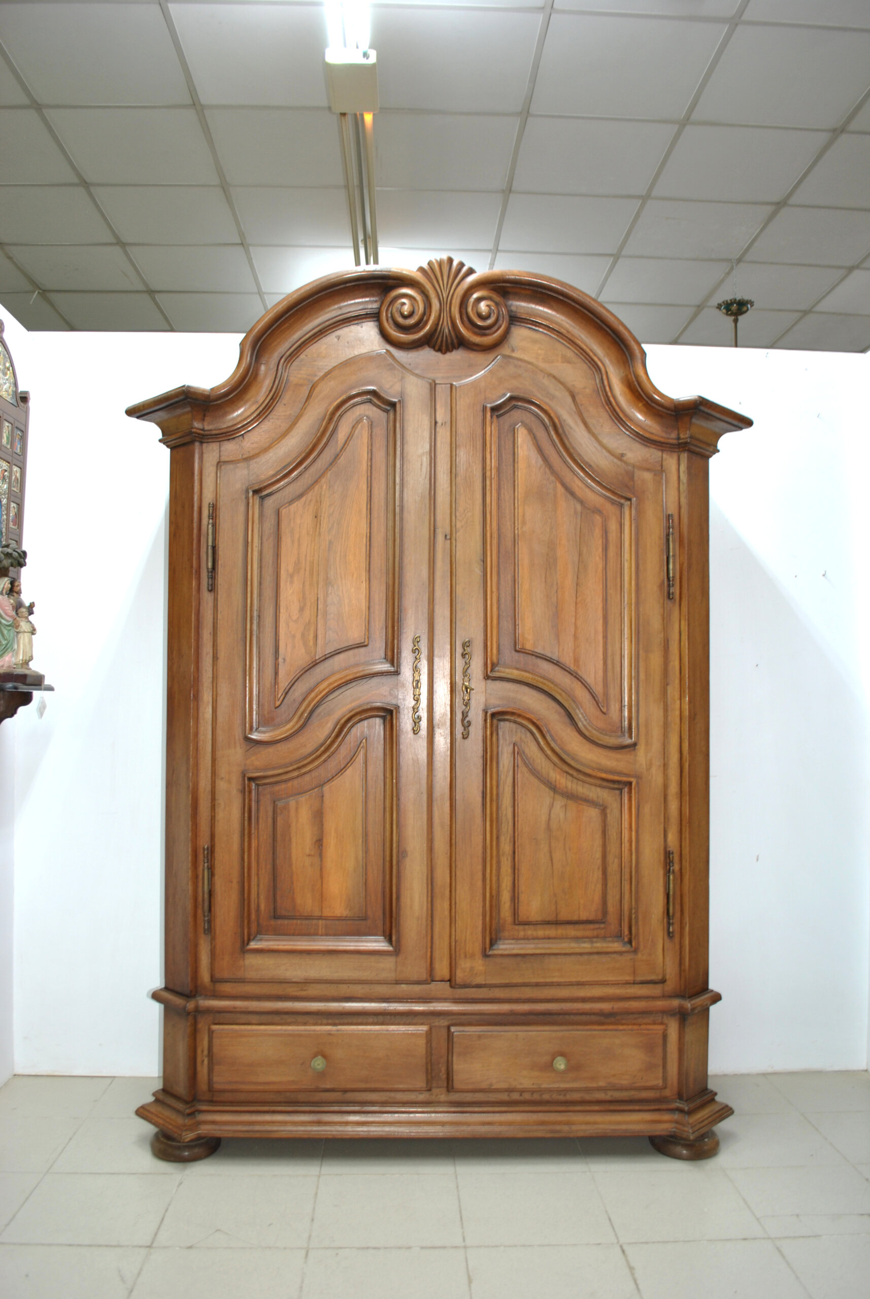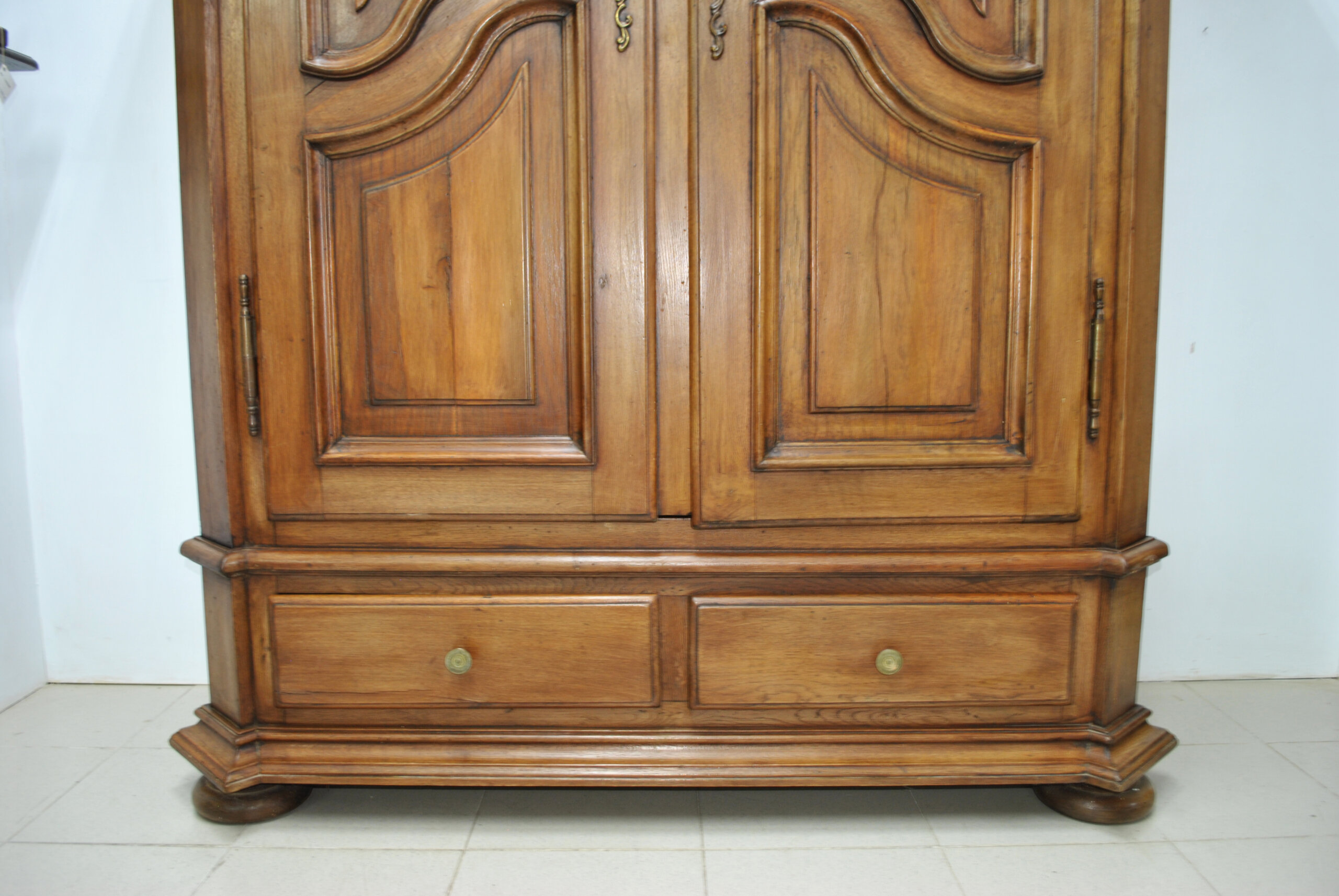 REF: 11848 – Fantástico armario antiguo de dos puertas realizado en madera maciza, de cálido tono miel, con un diseño clásico de gran elegancia y presencia. La pieza destaca por su imponente cornisa superior de forma ondulada, coronada con una talla central en espiral y concha, detalle característico del estilo Luis XV o provenzal francés. Las puertas presentan molduras sinuosas talladas a mano, que aportan movimiento y sofisticación, mientras que la parte inferior incorpora dos amplios cajones con tiradores metálicos originales, perfectos para almacenamiento adicional. El interior es espacioso, con una estructura sólida y limpia, ideal para uso funcional como armario, vitrina o mueble de apoyo decorativo. Su base moldurada y sus patas redondeadas realzan su carácter robusto y artesanal.