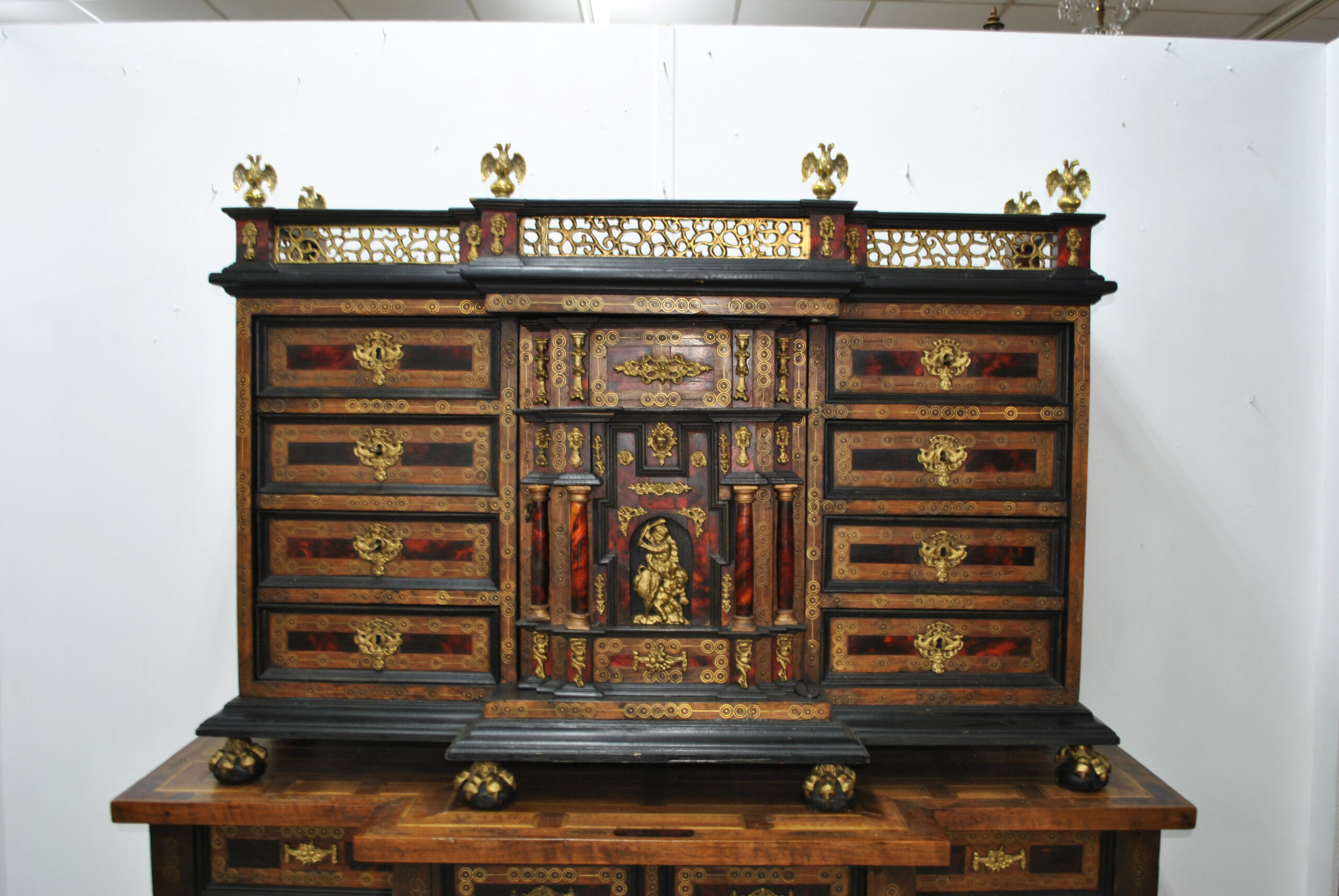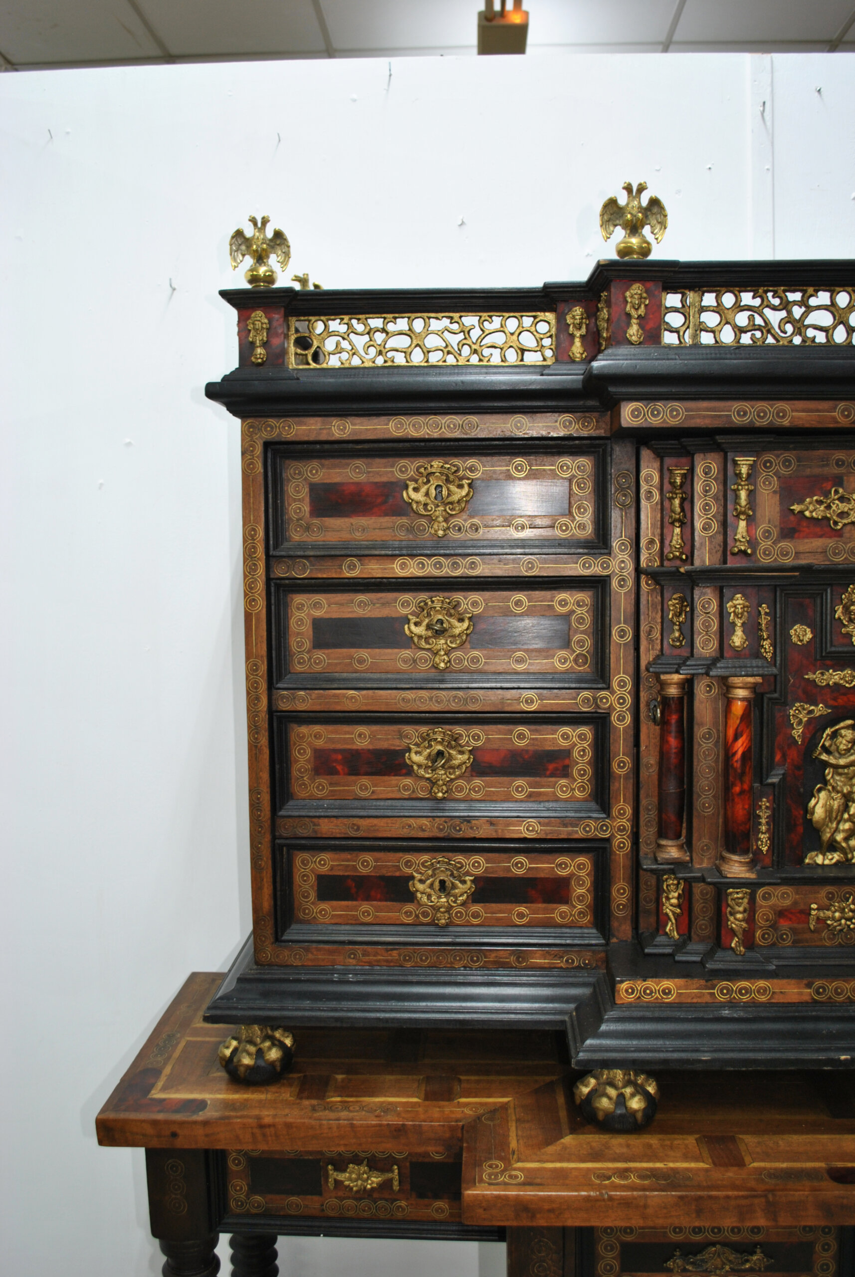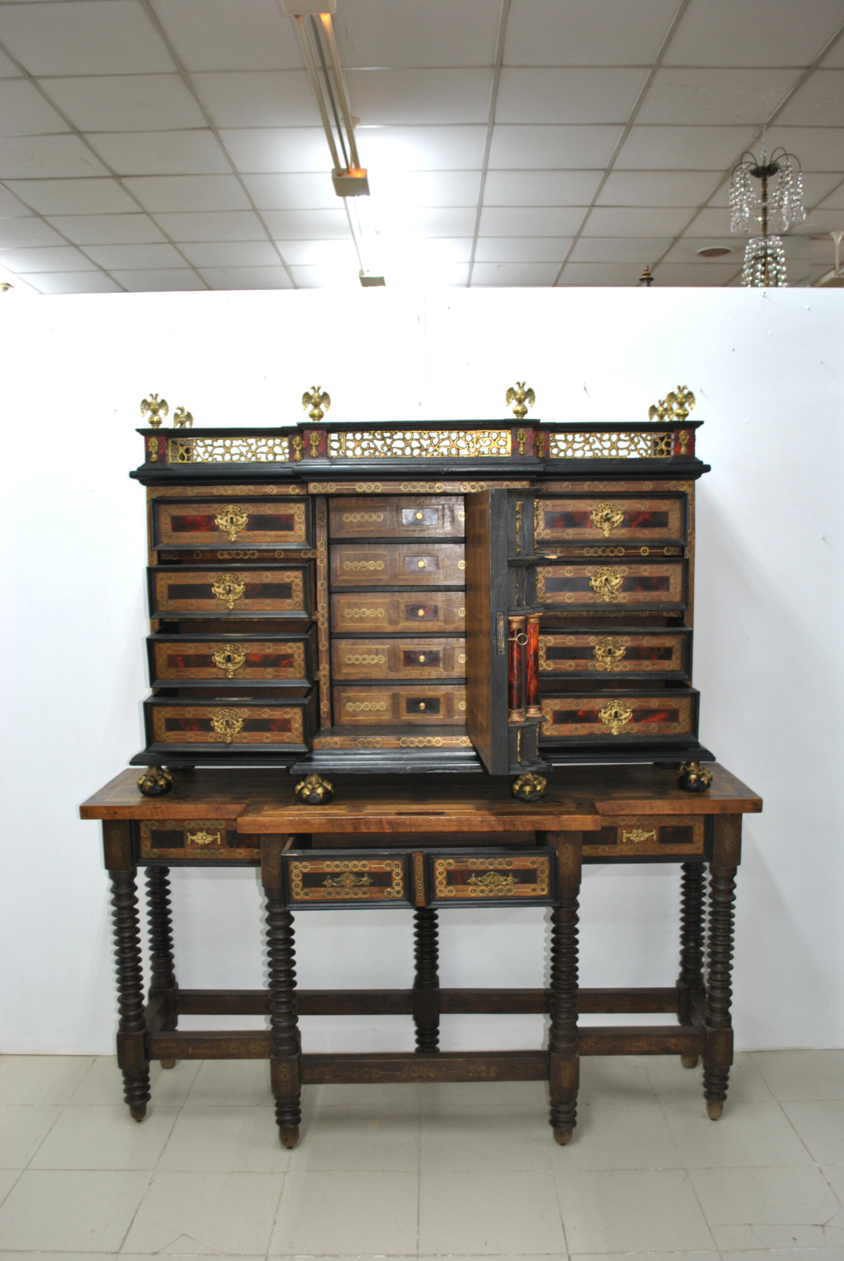 Fabricado en madera maciza, presenta un trabajo muy detallado de taracea y decoración con aplicaciones en bronce dorado. Destacan sus múltiples cajones, todos ellos decorados con tiradores y bocallaves de época, así como su estructura interior con pequeños compartimentos y cajones secretos.