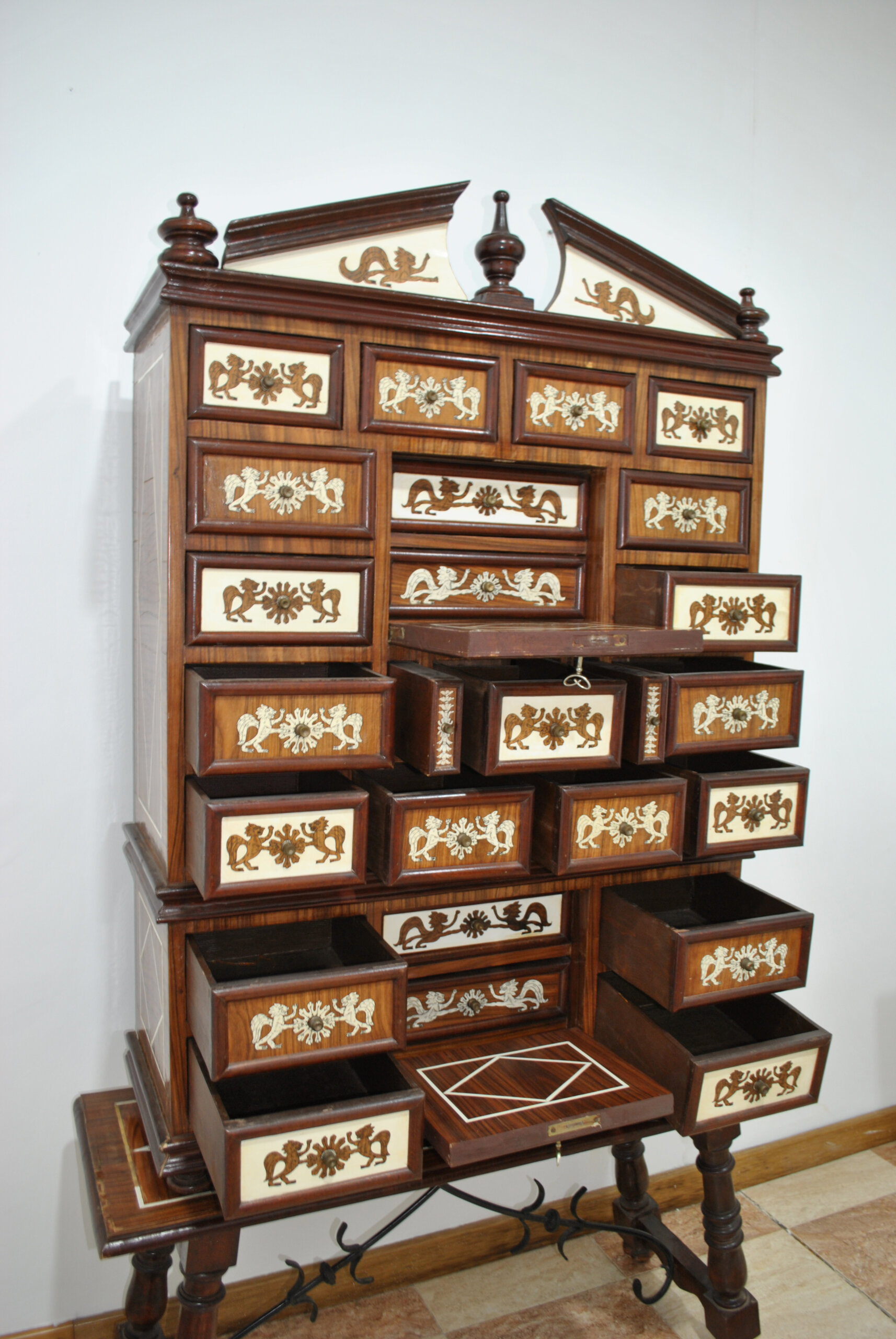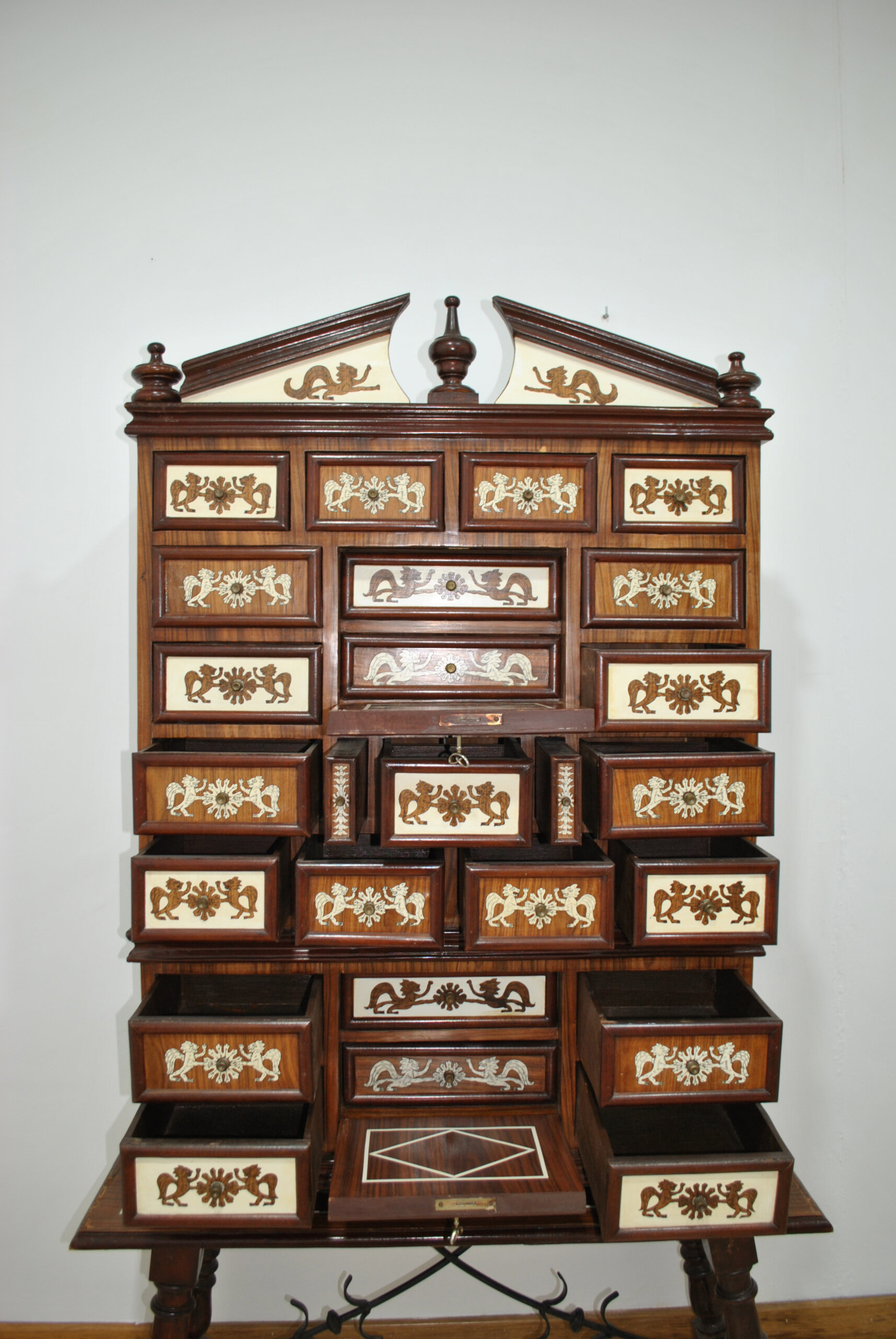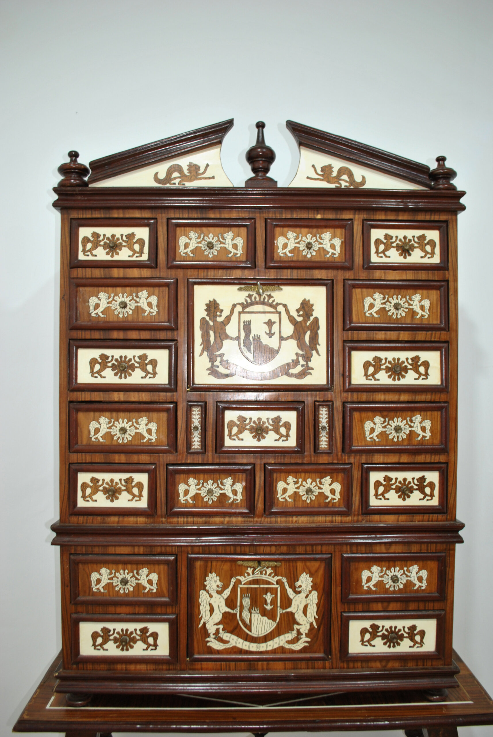 El frente se compone de múltiples cajones de diferentes tamaños, cada uno decorado con escenas simétricas de animales mitológicos afrontados y motivos florales, realizados en marquetería en tonos claros sobre fondo de madera noble. En el centro destacan paneles con escudos heráldicos flanqueados por figuras fantásticas aladas, aportando un marcado carácter señorial y evocación histórica.
