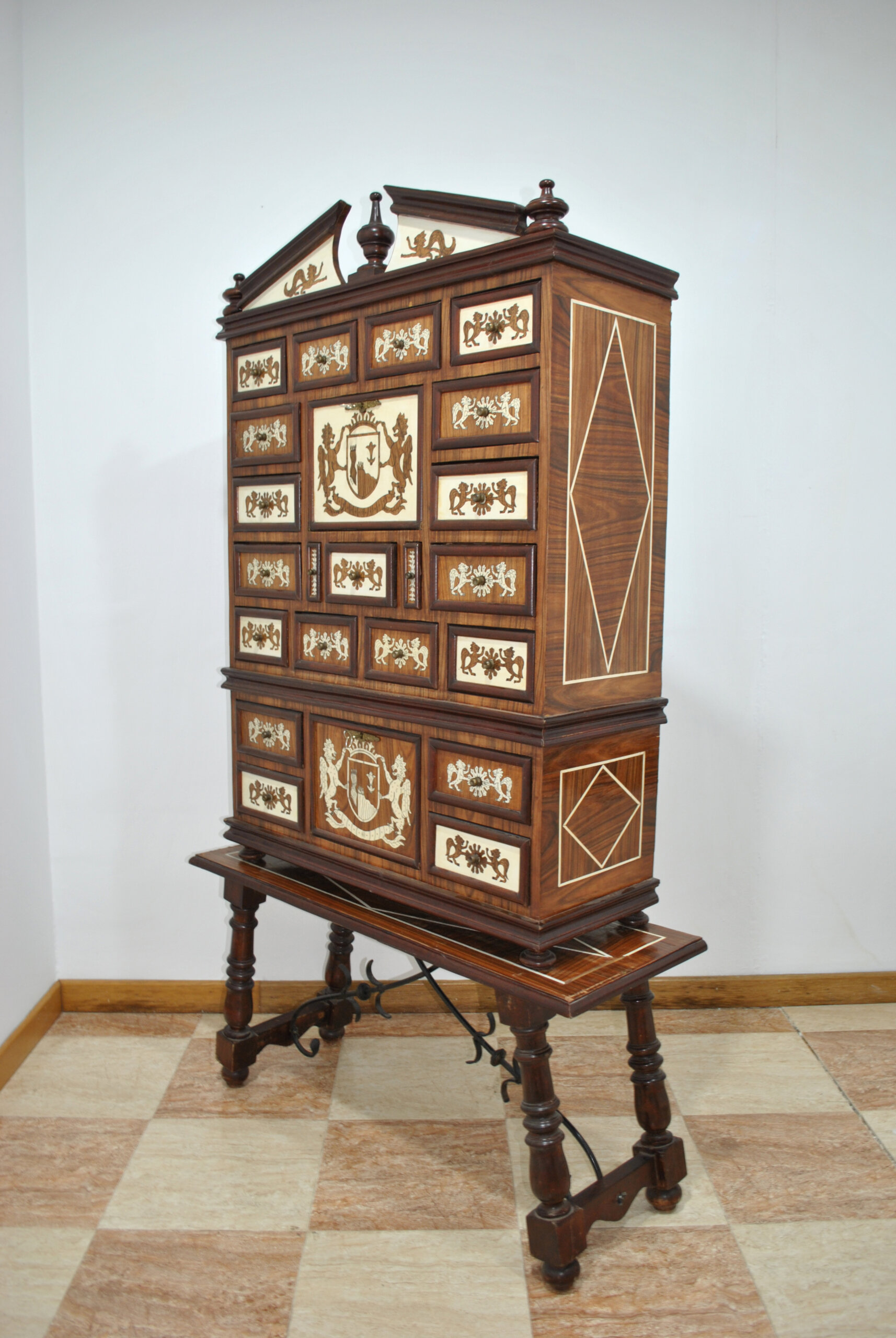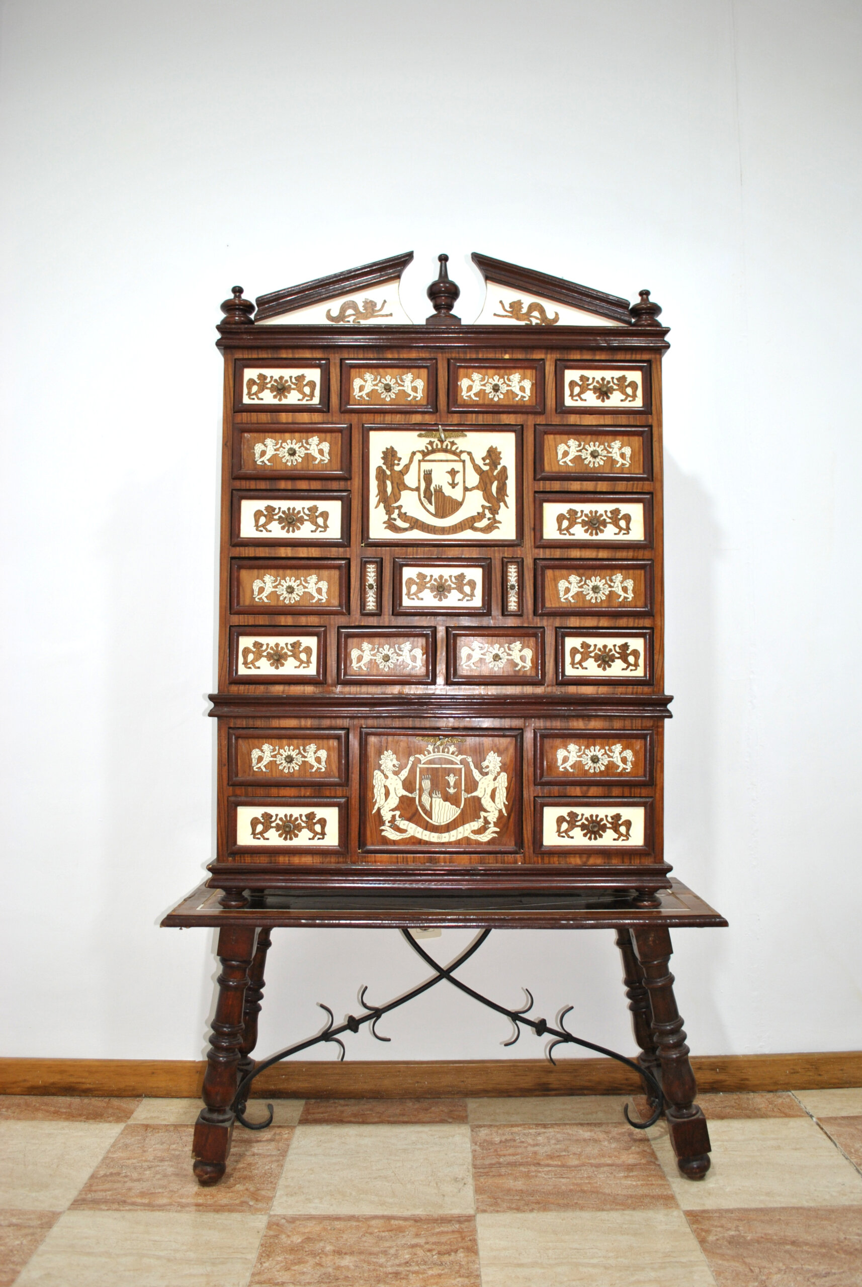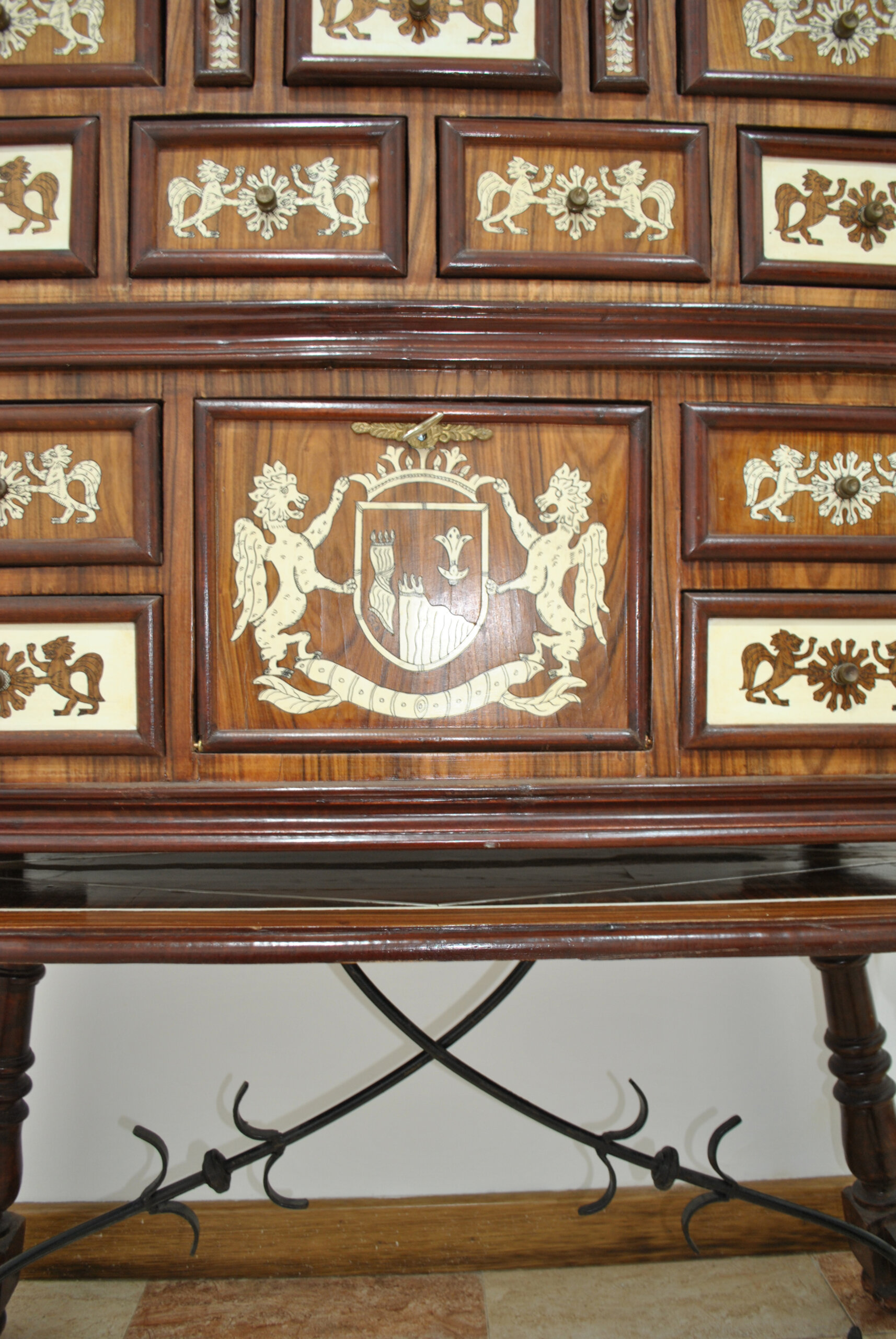 REF: 12204 – Magnífico bargueño antiguo ricamente decorado con marquetería y aplicaciones en contraste, apoyado sobre mesa independiente de patas torneadas unidas por fiadores de hierro forjado. Una pieza de gran presencia estética y carácter histórico, ideal como mueble protagonista en despacho, biblioteca o salón clásico.