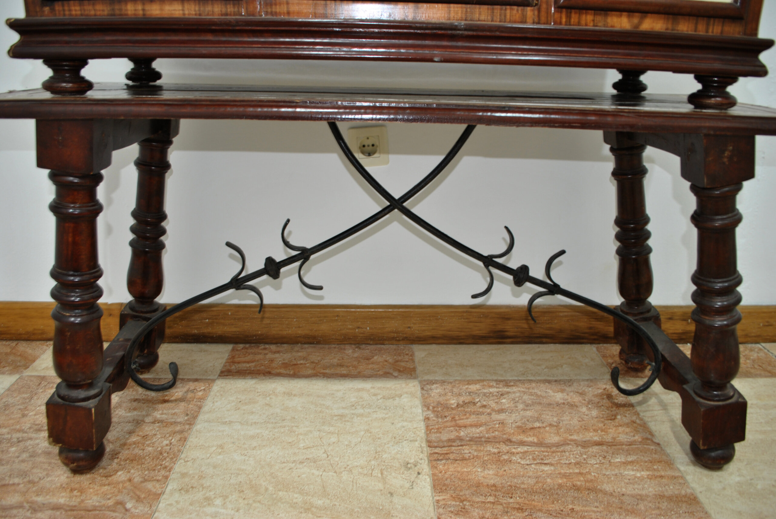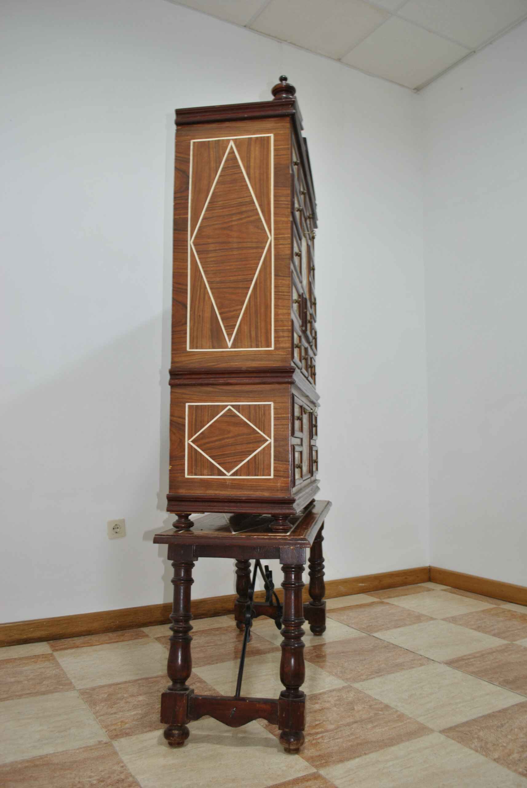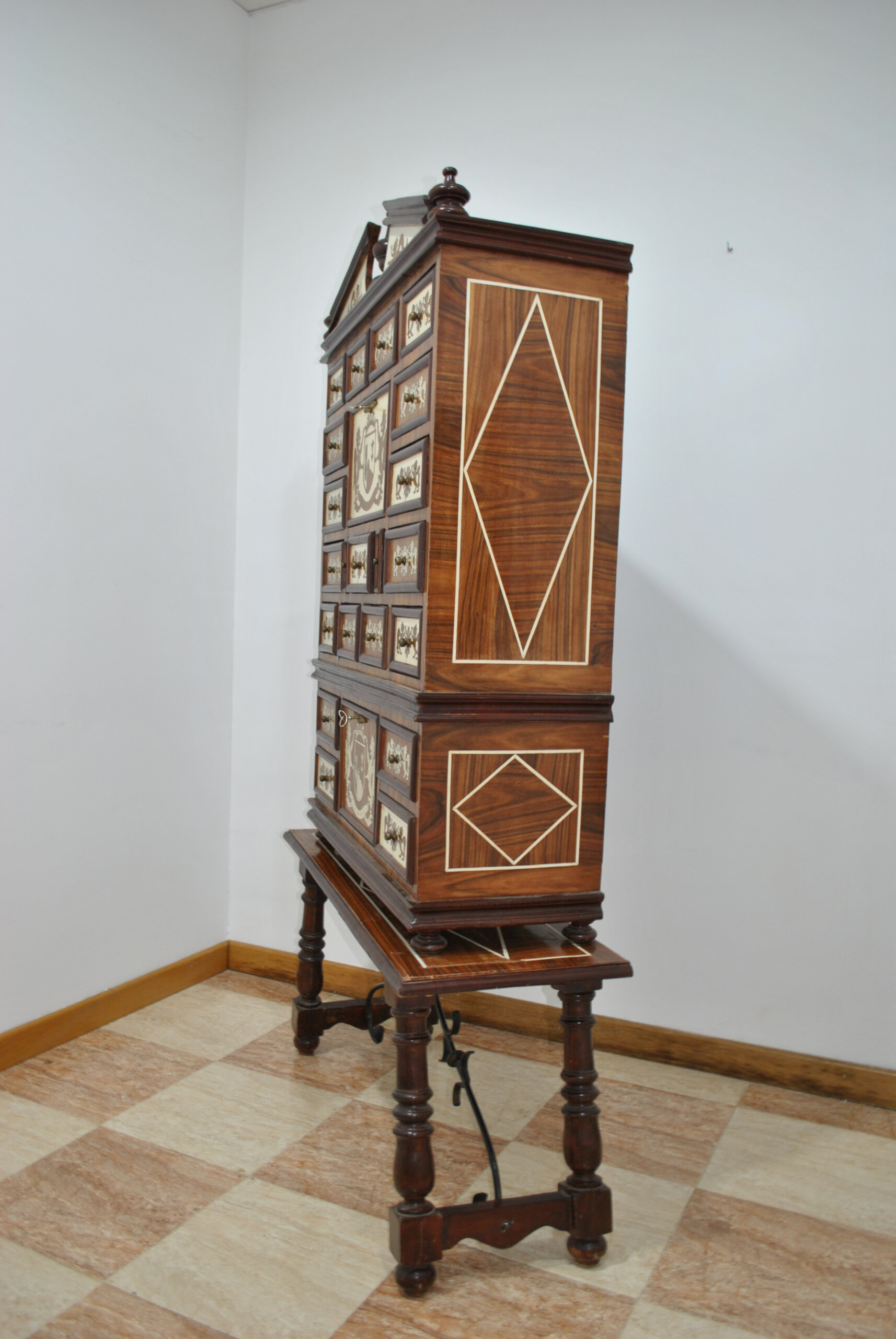 REF: 12204 – Magnífico bargueño antiguo ricamente decorado con marquetería y aplicaciones en contraste, apoyado sobre mesa independiente de patas torneadas unidas por fiadores de hierro forjado. Una pieza de gran presencia estética y carácter histórico, ideal como mueble protagonista en despacho, biblioteca o salón clásico.