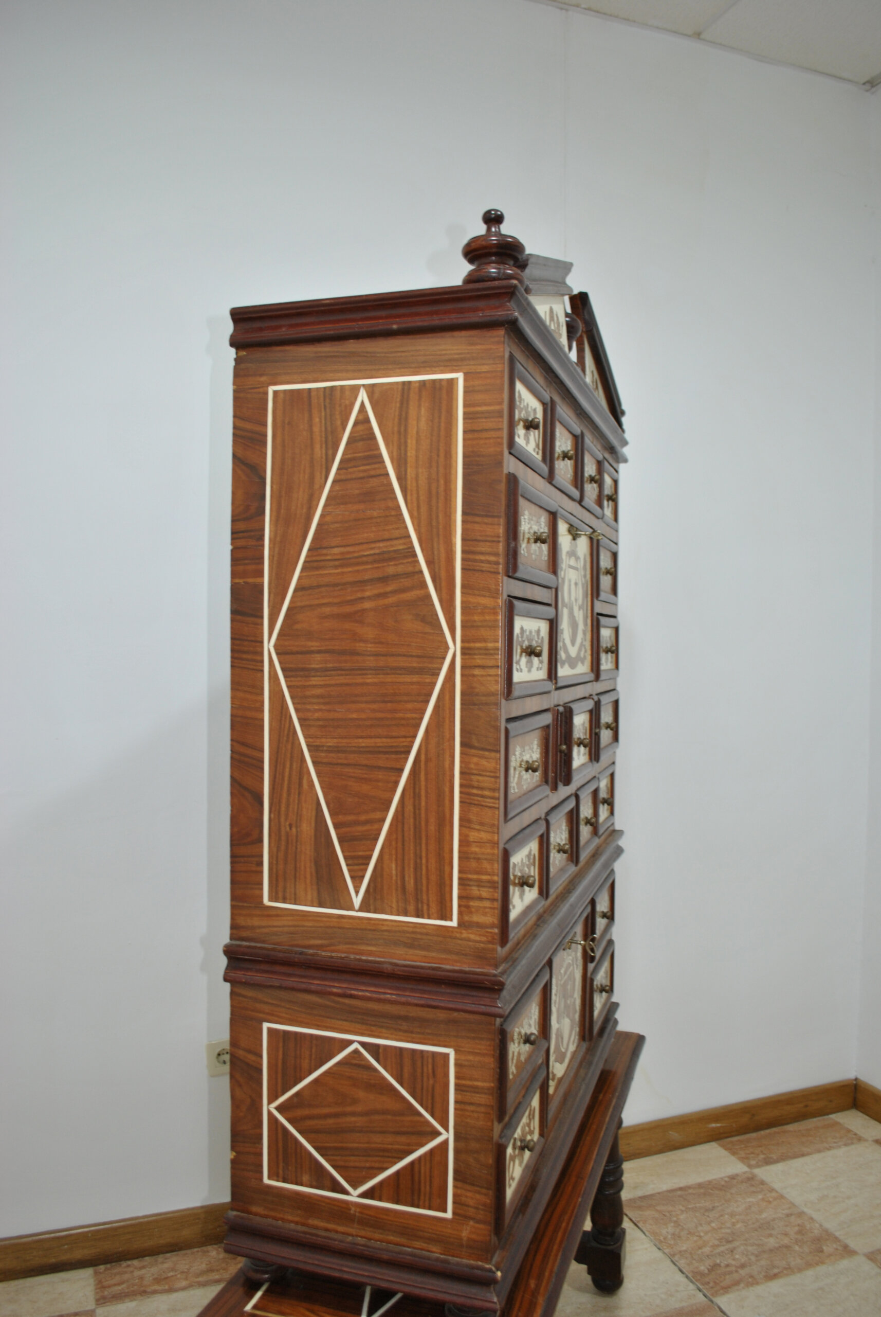 La cornisa superior se remata con frontón partido y pináculos torneados, reforzando su elegancia arquitectónica. Los laterales presentan paneles geométricos enmarcados con filetería clara formando rombos, detalle que demuestra el cuidado trabajo artesanal.