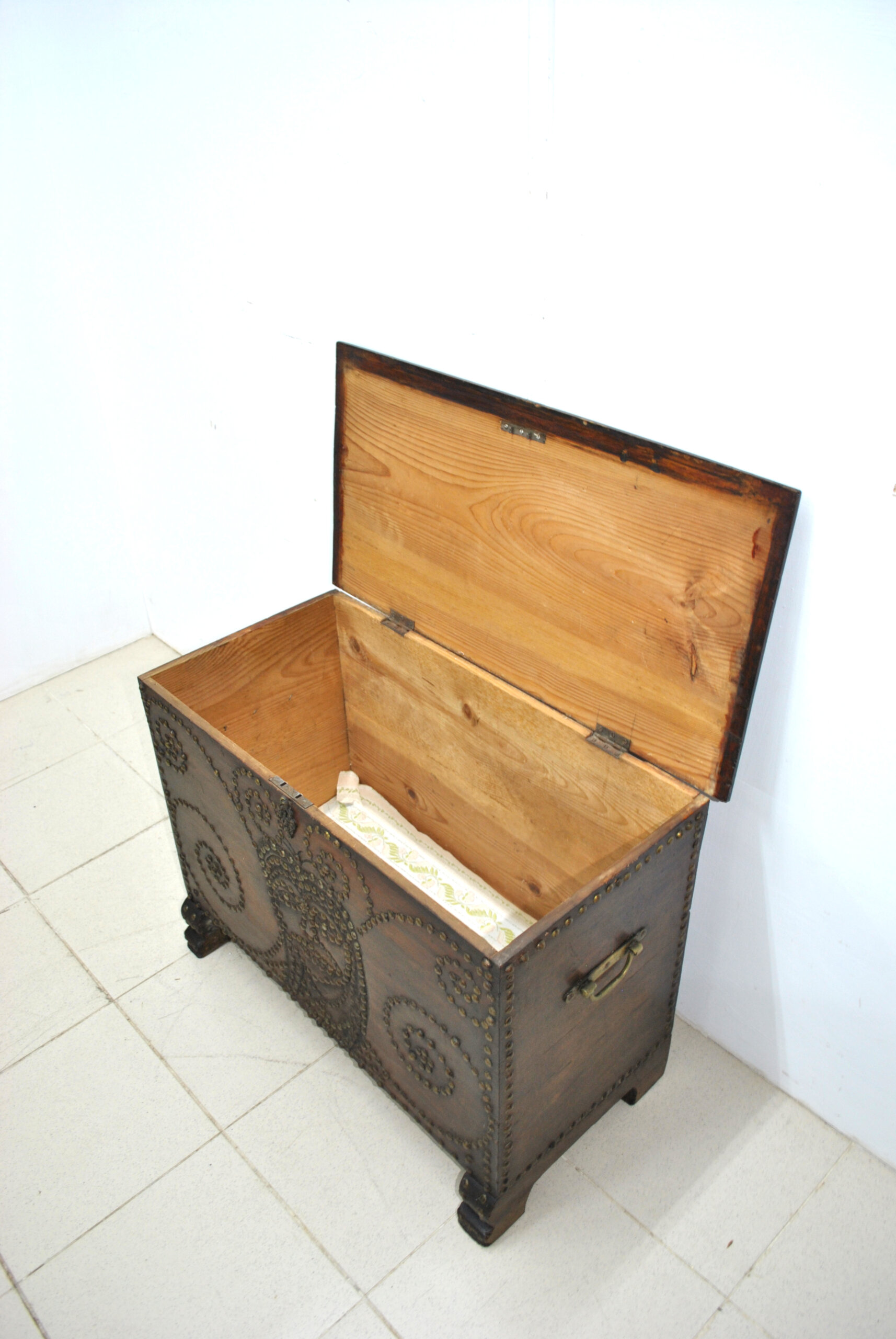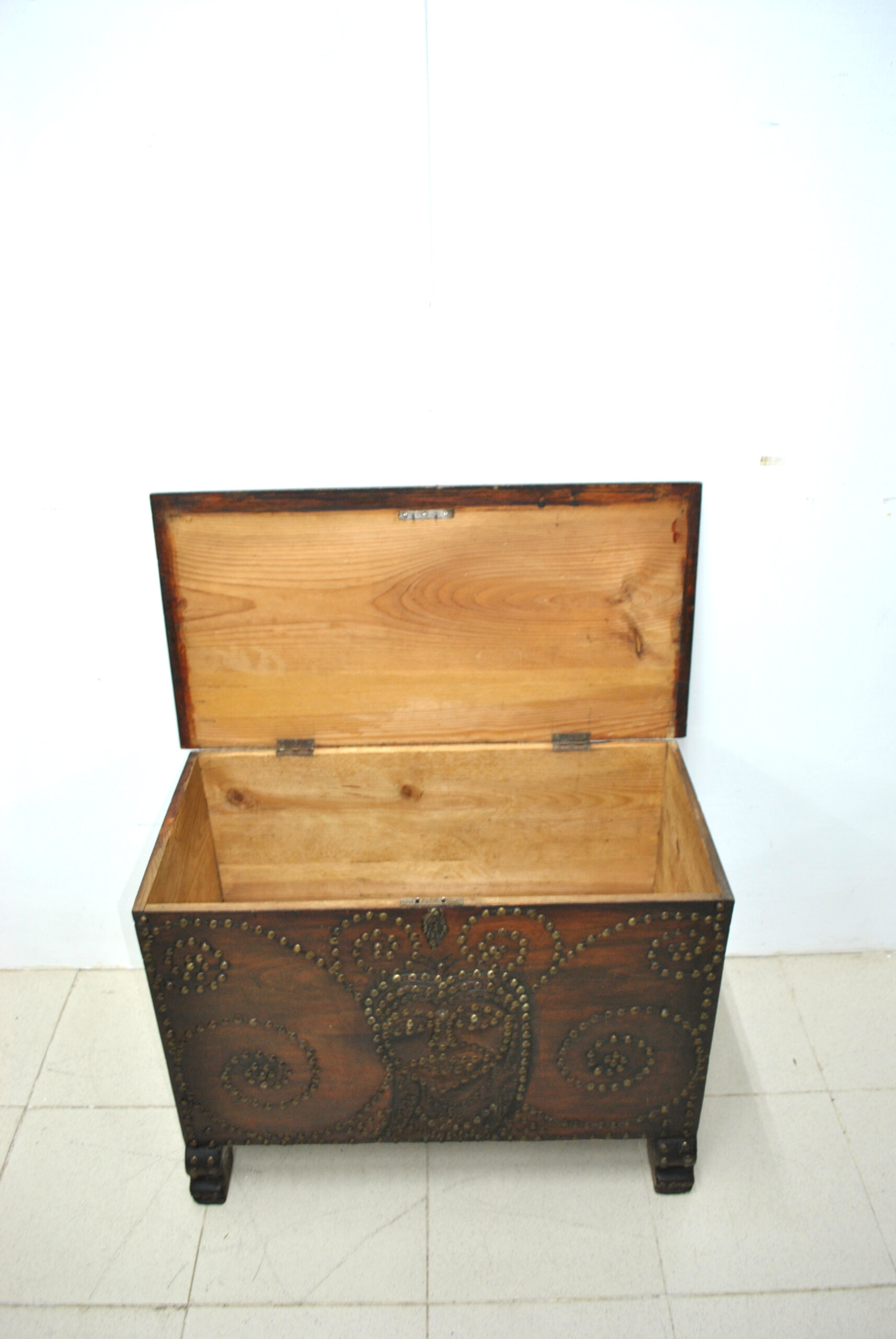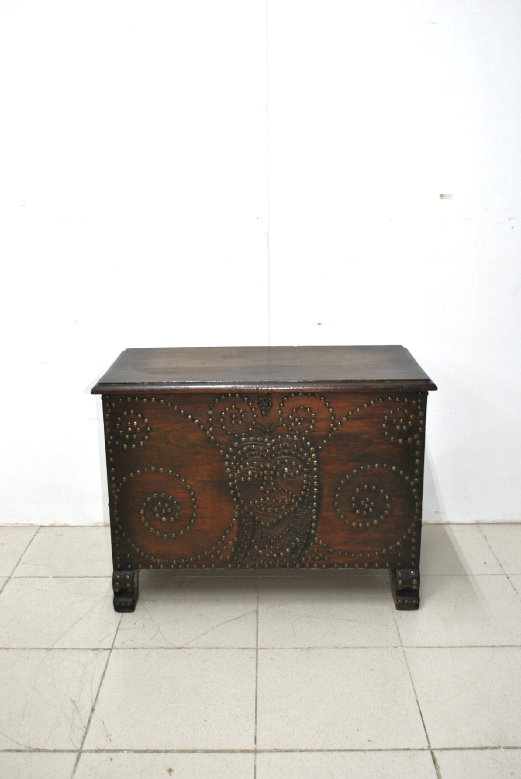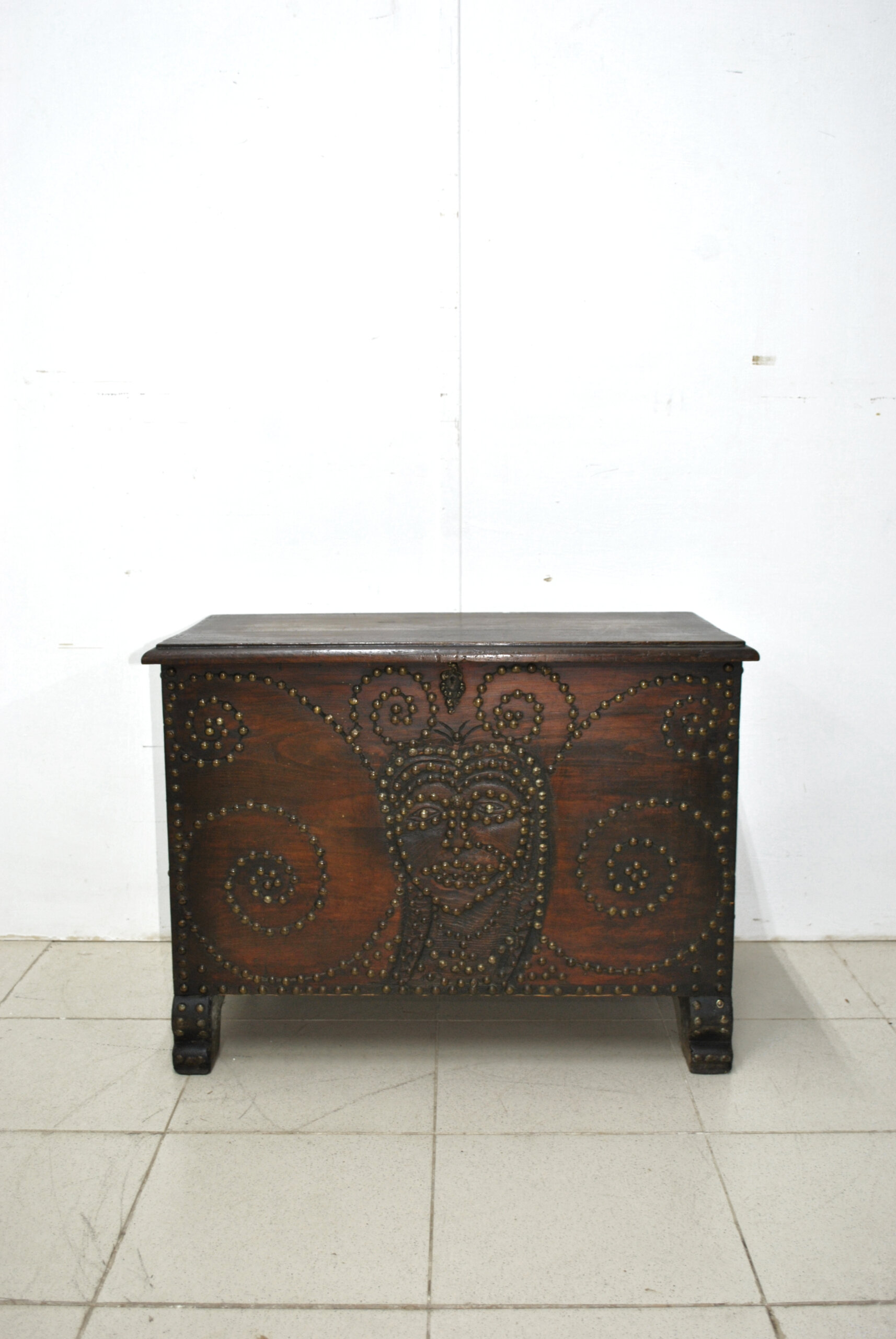 REF: 11996 – Magnífico baúl antiguo en madera maciza, con una extraordinaria decoración artesanal de clavos de hierro que dibujan un rostro central enmarcado por motivos espirales, símbolo de protección y prosperidad. Su tapa lisa y su estructura robusta denotan una fabricación sólida y tradicional, propia del S.XIX.