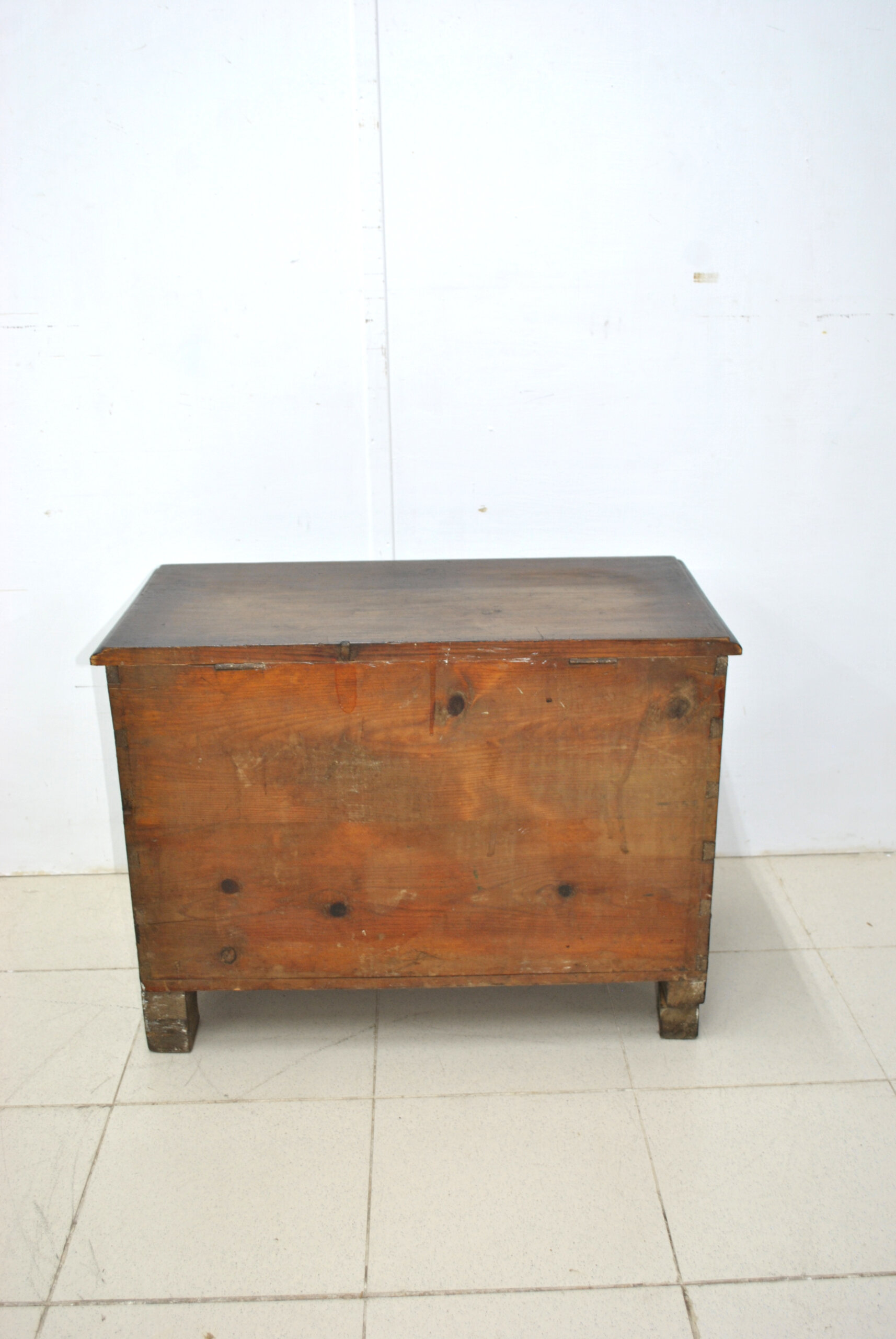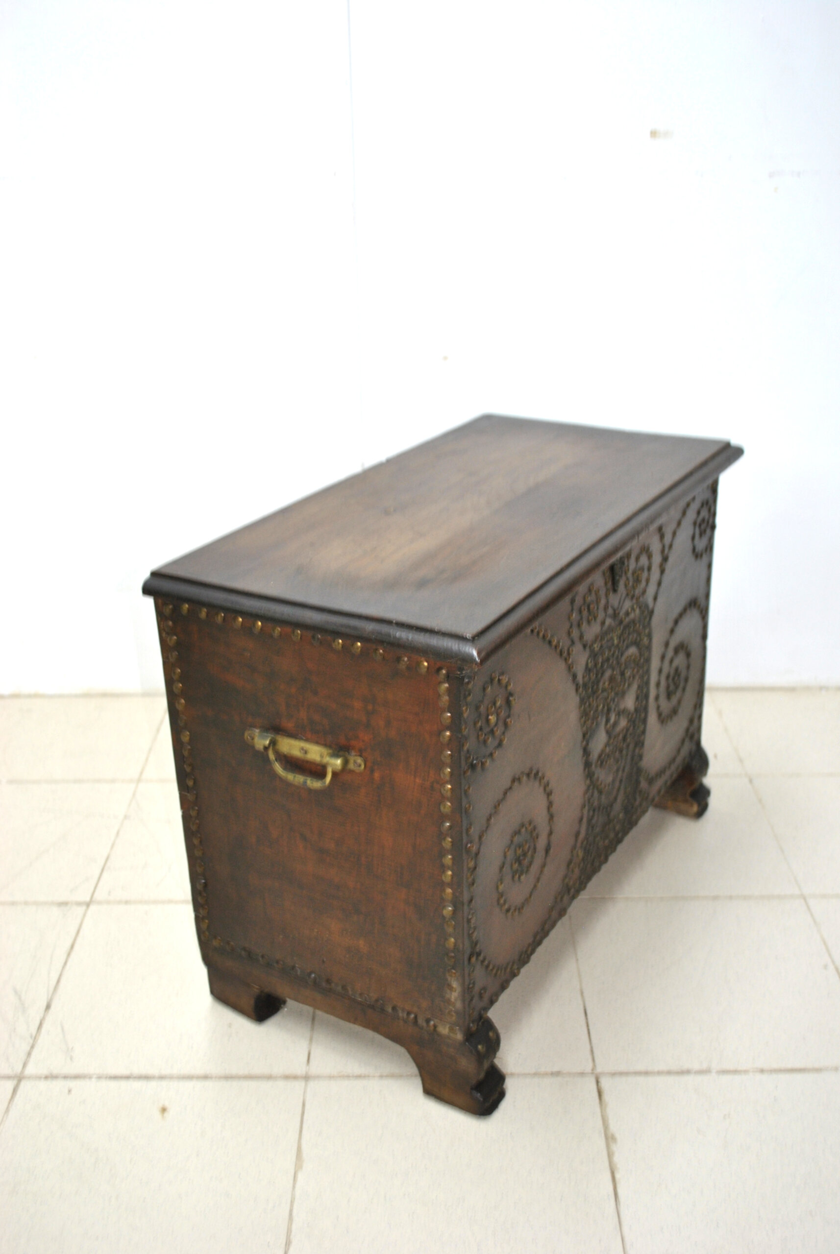 El interior conserva la madera en su tono natural, mostrando la nobleza del material y la autenticidad de su construcción. Los laterales incorporan asas metálicas originales, facilitando su transporte, mientras que los pies tallados añaden estabilidad y presencia decorativa.
