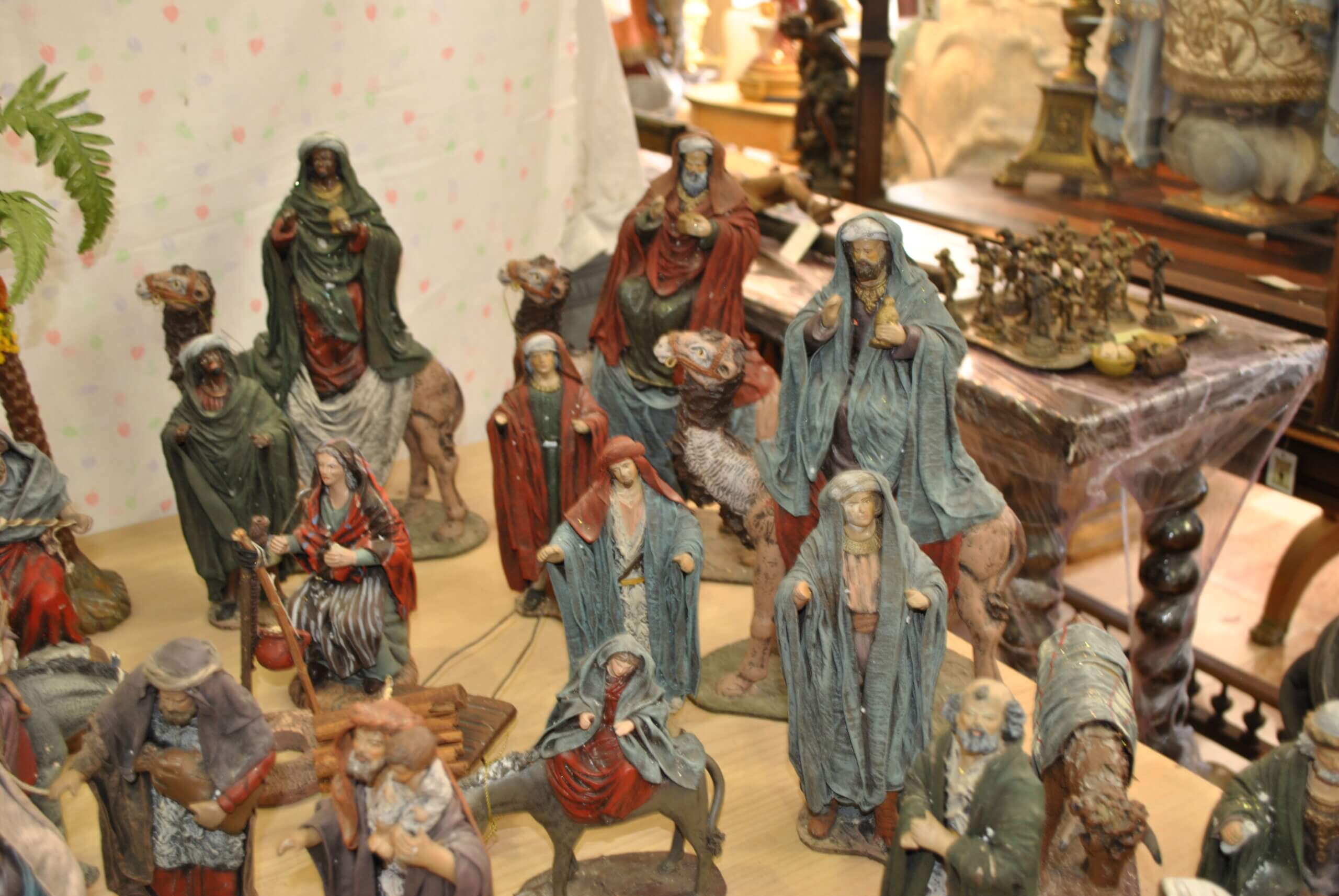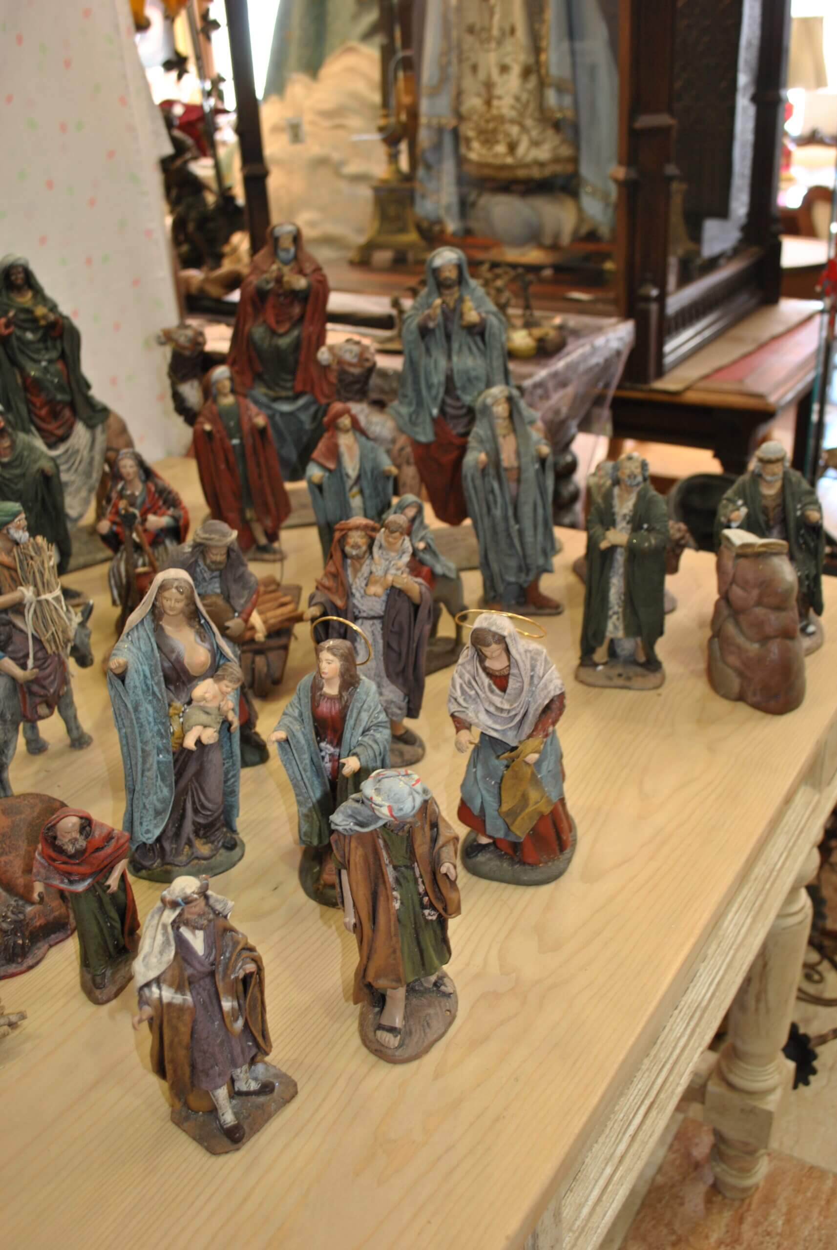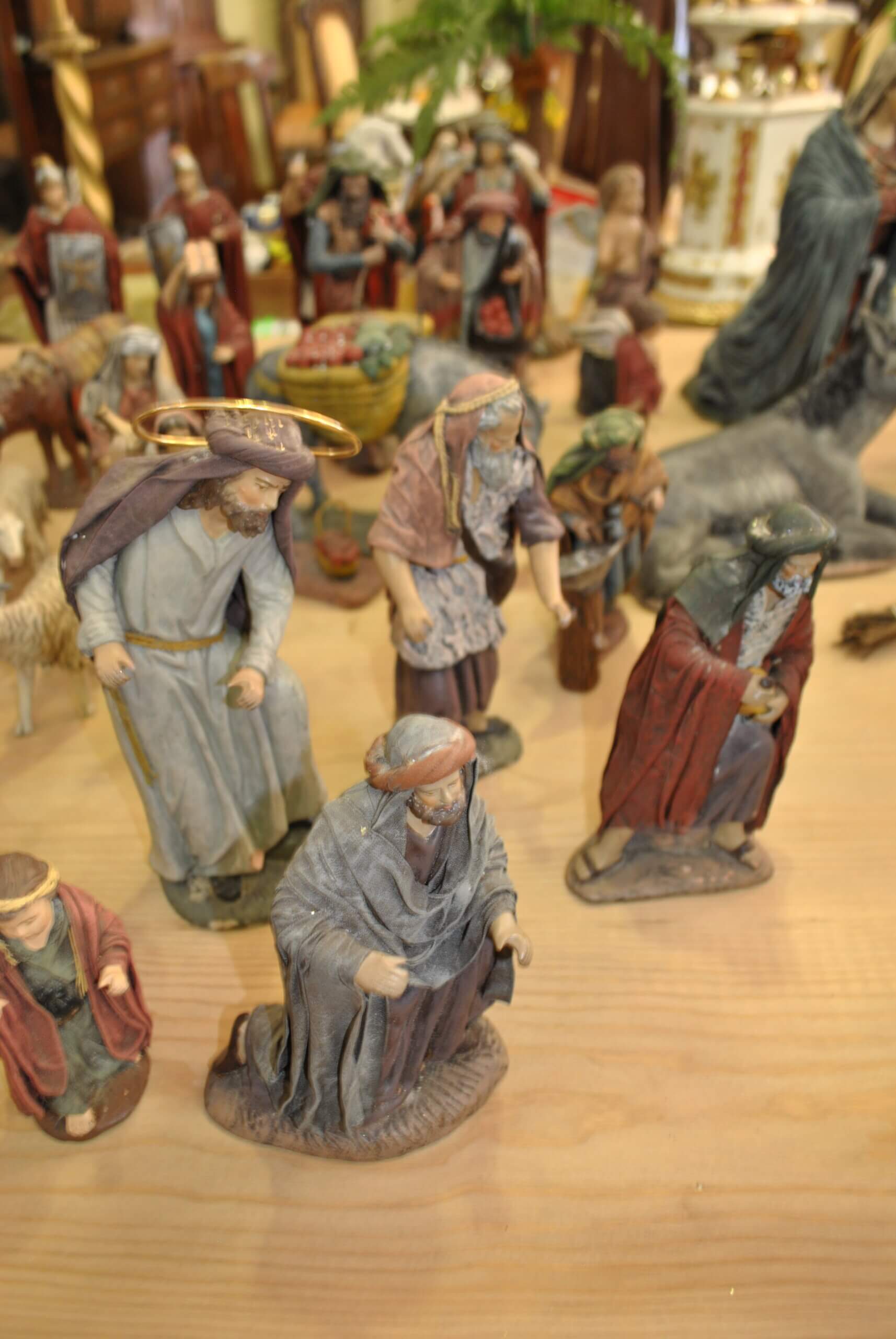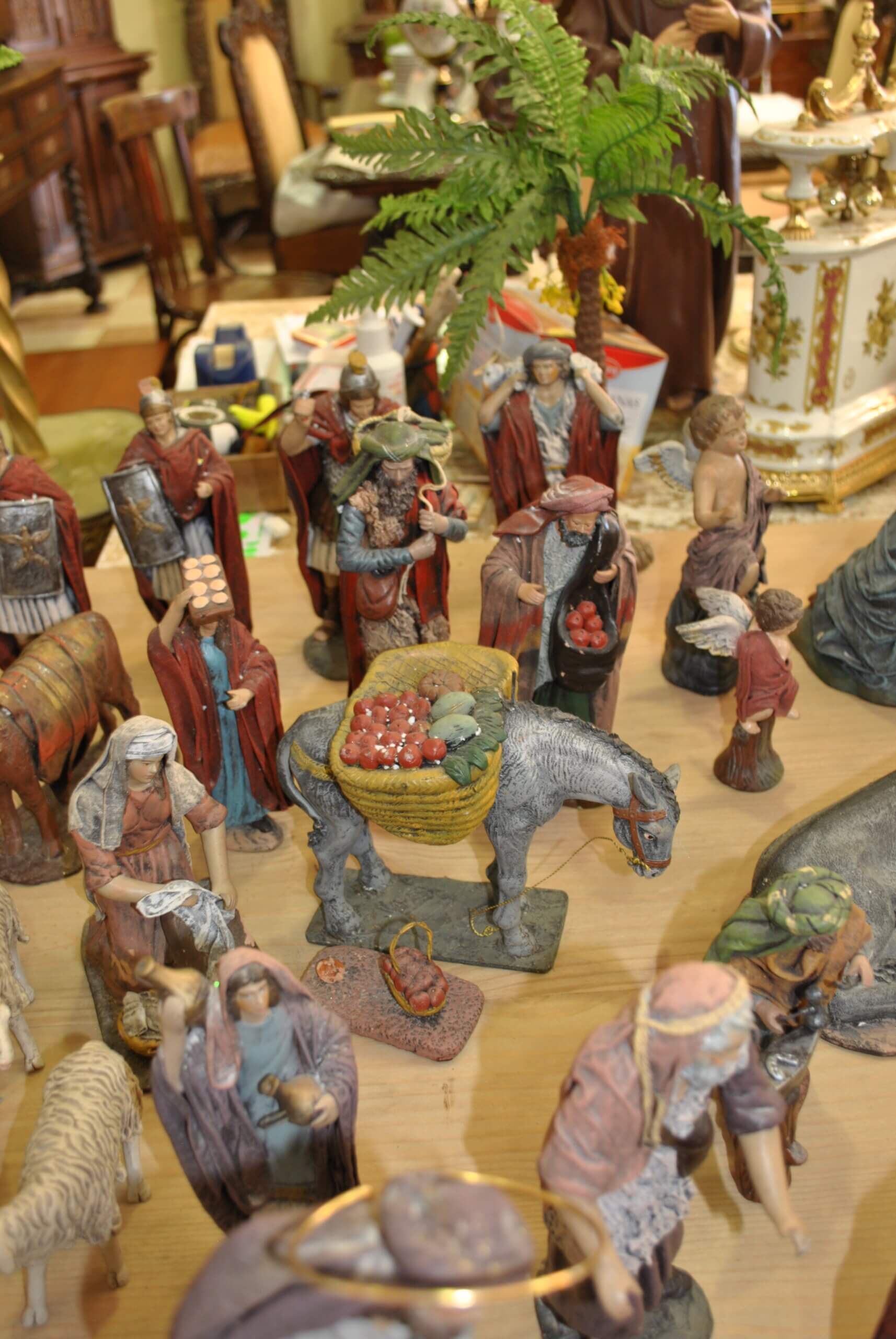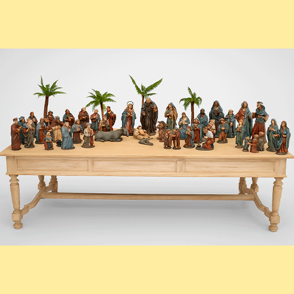 REF: 11880 – Magnífico belén artesanal compuesto por 72figuras policromadas pintadas a mano por J. Fernández con gran detalle, que incluyen la Sagrada Familia, los Reyes Magos con su séquito, pastores, aldeanos, animales y palmeras decorativas, todas dispuestas sobre una sólida mesa de madera maciza con acabado envejecido en blanco decapado. Las figuras, de entre 12 y 28 cm de altura, destacan por su realismo y expresividad, convirtiendo este conjunto en una pieza única ideal para coleccionistas, decoración de iglesias, capillas o espacios religiosos, así como para realzar escaparates y salones durante la Navidad.