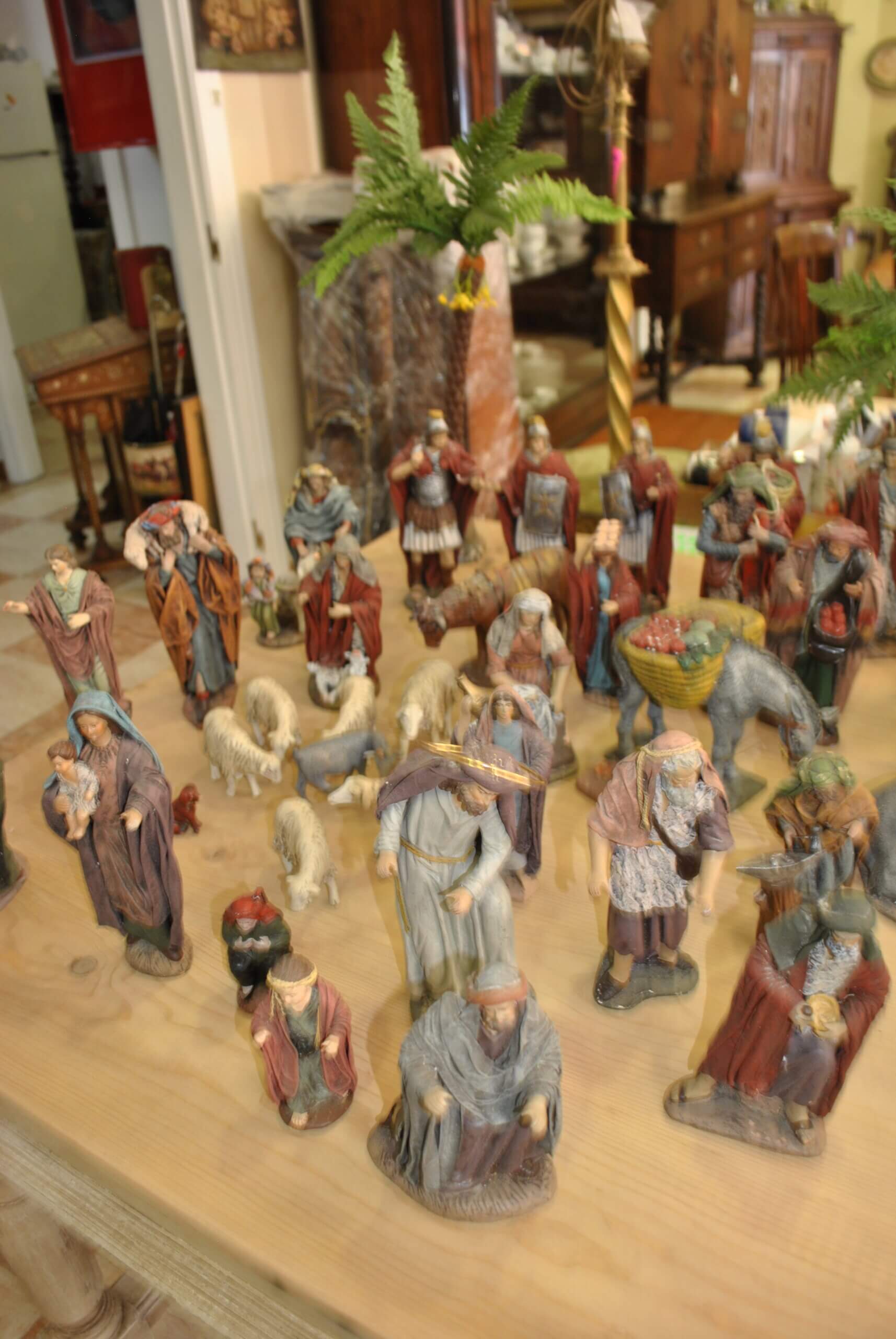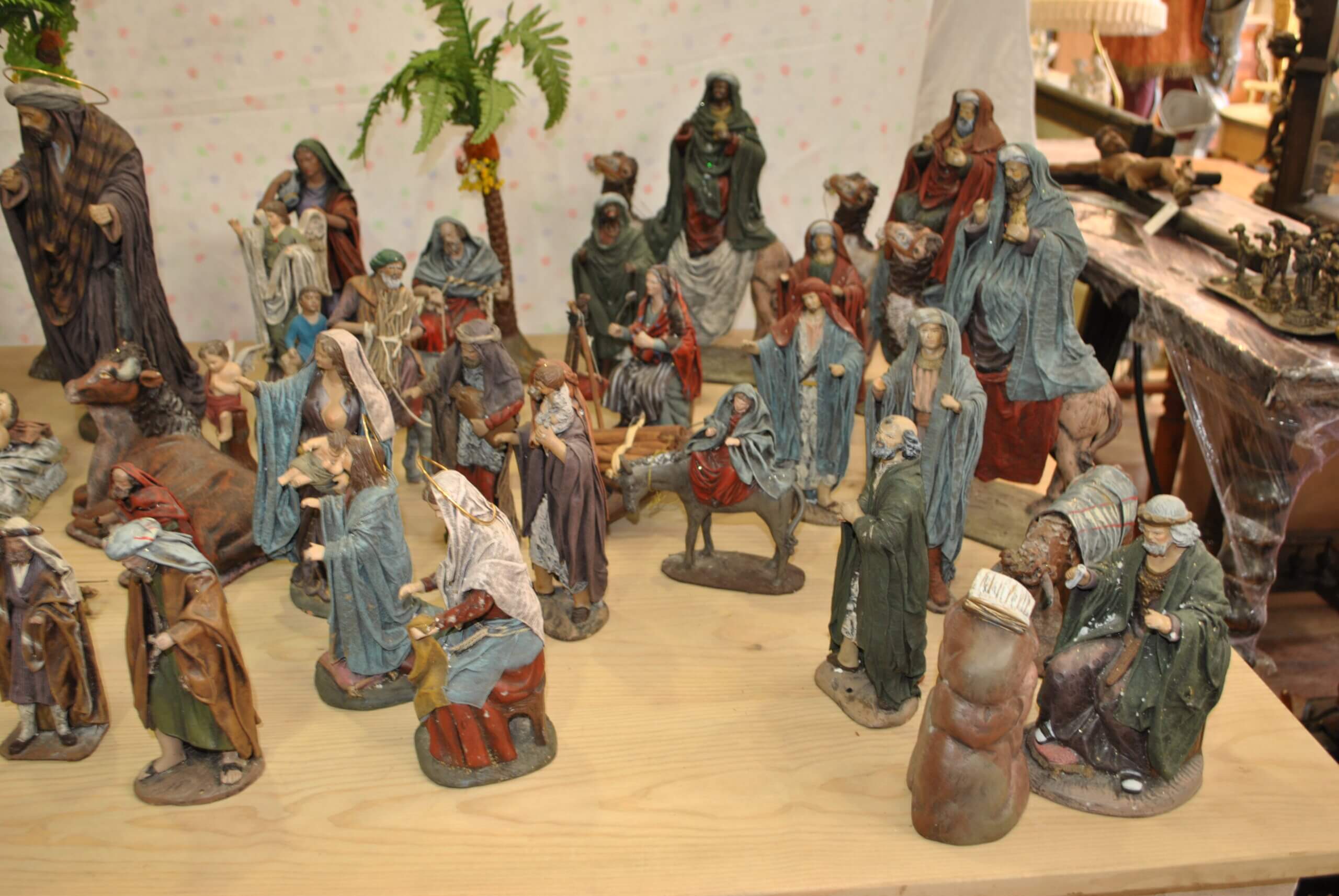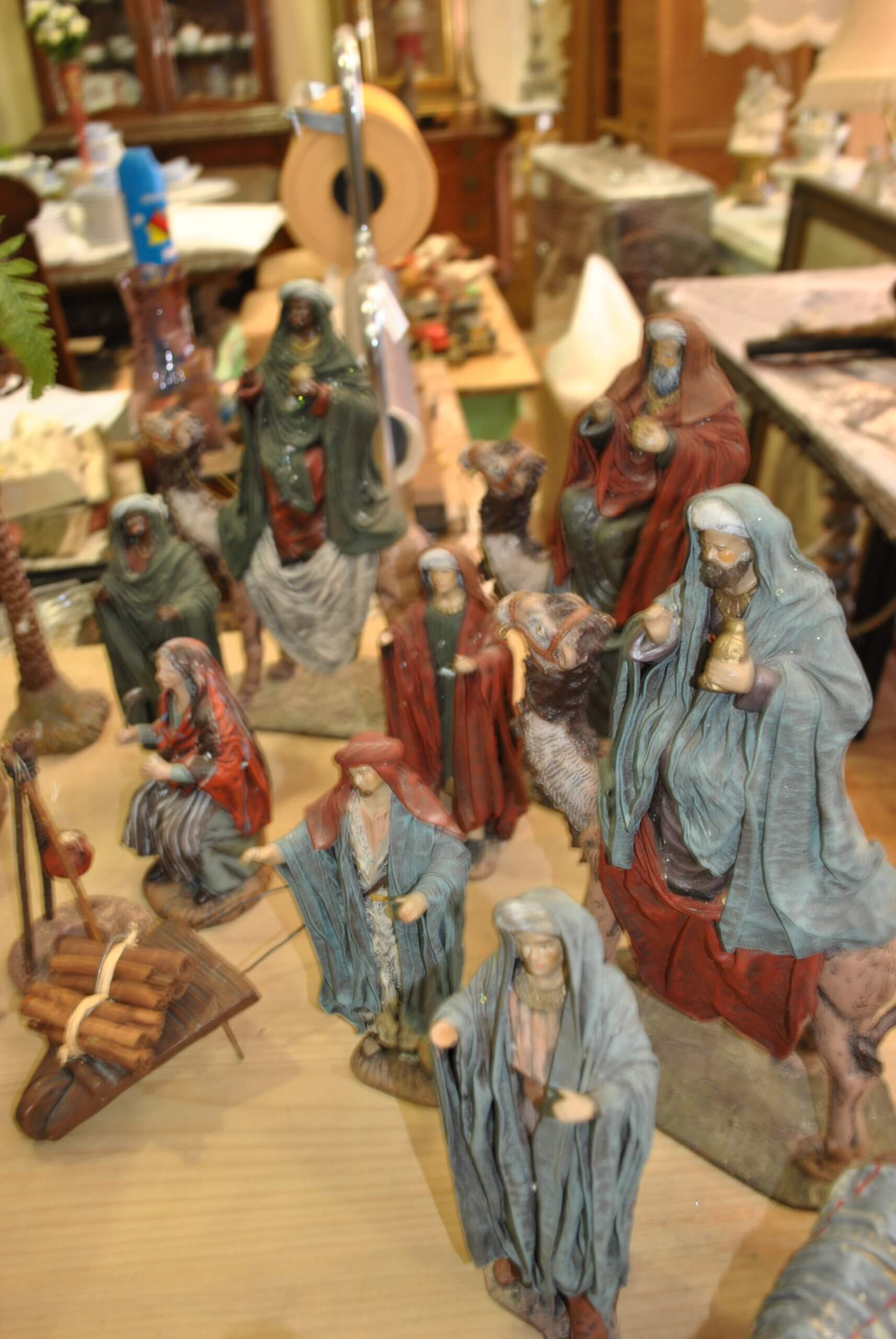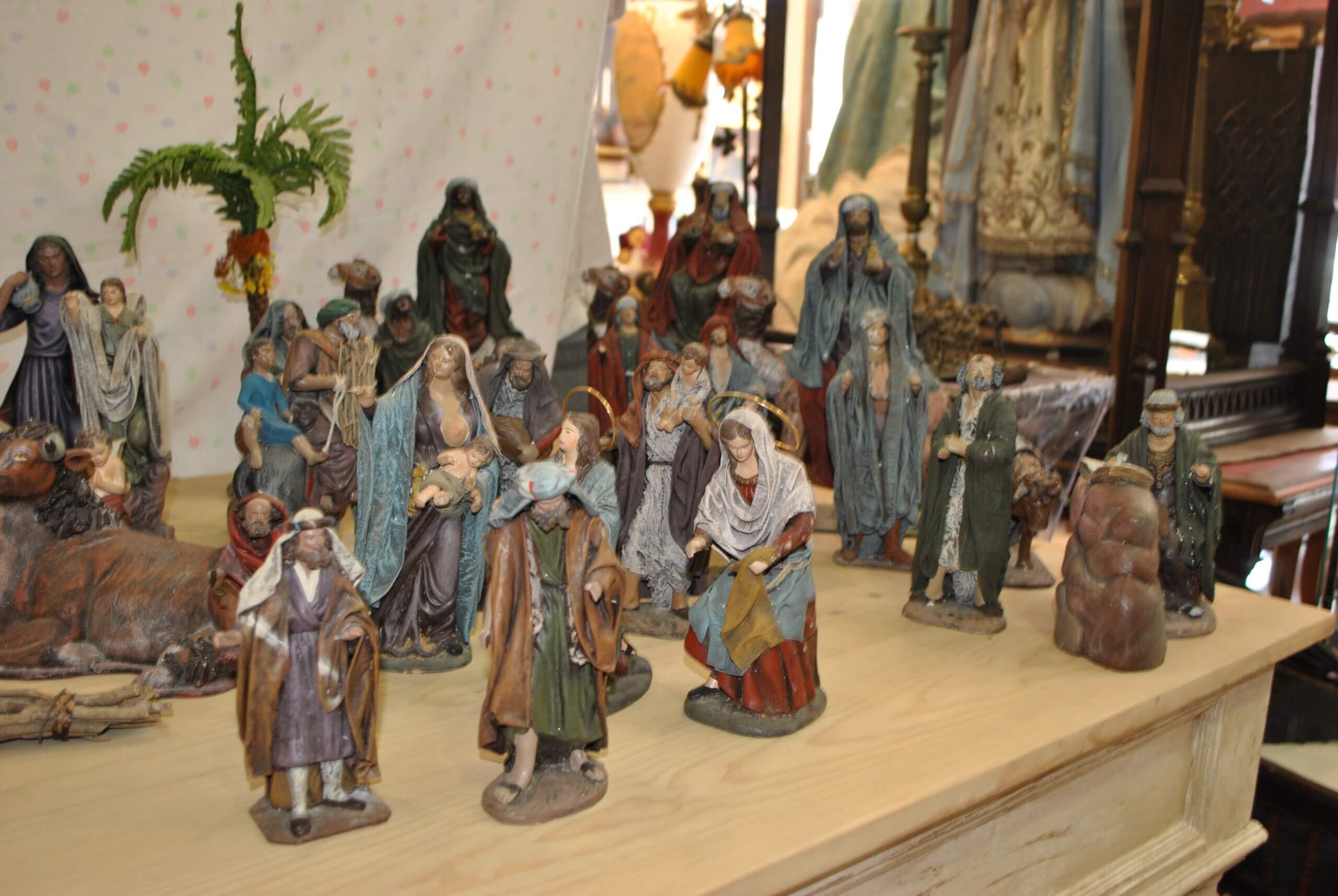 REF: 11880 – Magnífico belén artesanal compuesto por 72figuras policromadas pintadas a mano por J. Fernández con gran detalle, que incluyen la Sagrada Familia, los Reyes Magos con su séquito, pastores, aldeanos, animales y palmeras decorativas, todas dispuestas sobre una sólida mesa de madera maciza con acabado envejecido en blanco decapado. Las figuras, de entre 12 y 28 cm de altura, destacan por su realismo y expresividad, convirtiendo este conjunto en una pieza única ideal para coleccionistas, decoración de iglesias, capillas o espacios religiosos, así como para realzar escaparates y salones durante la Navidad.