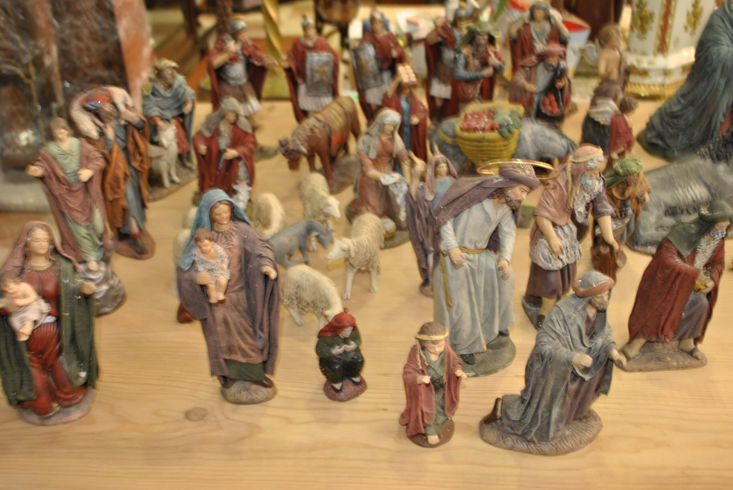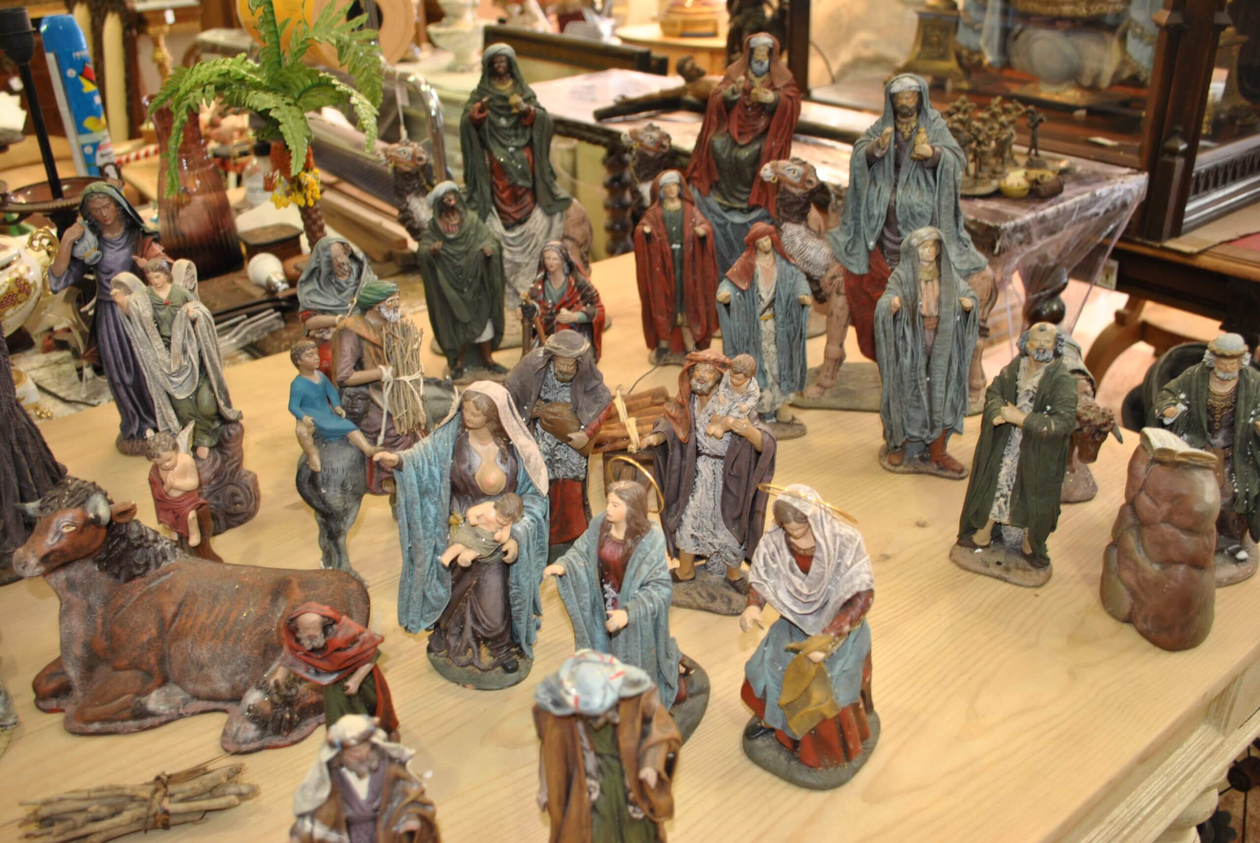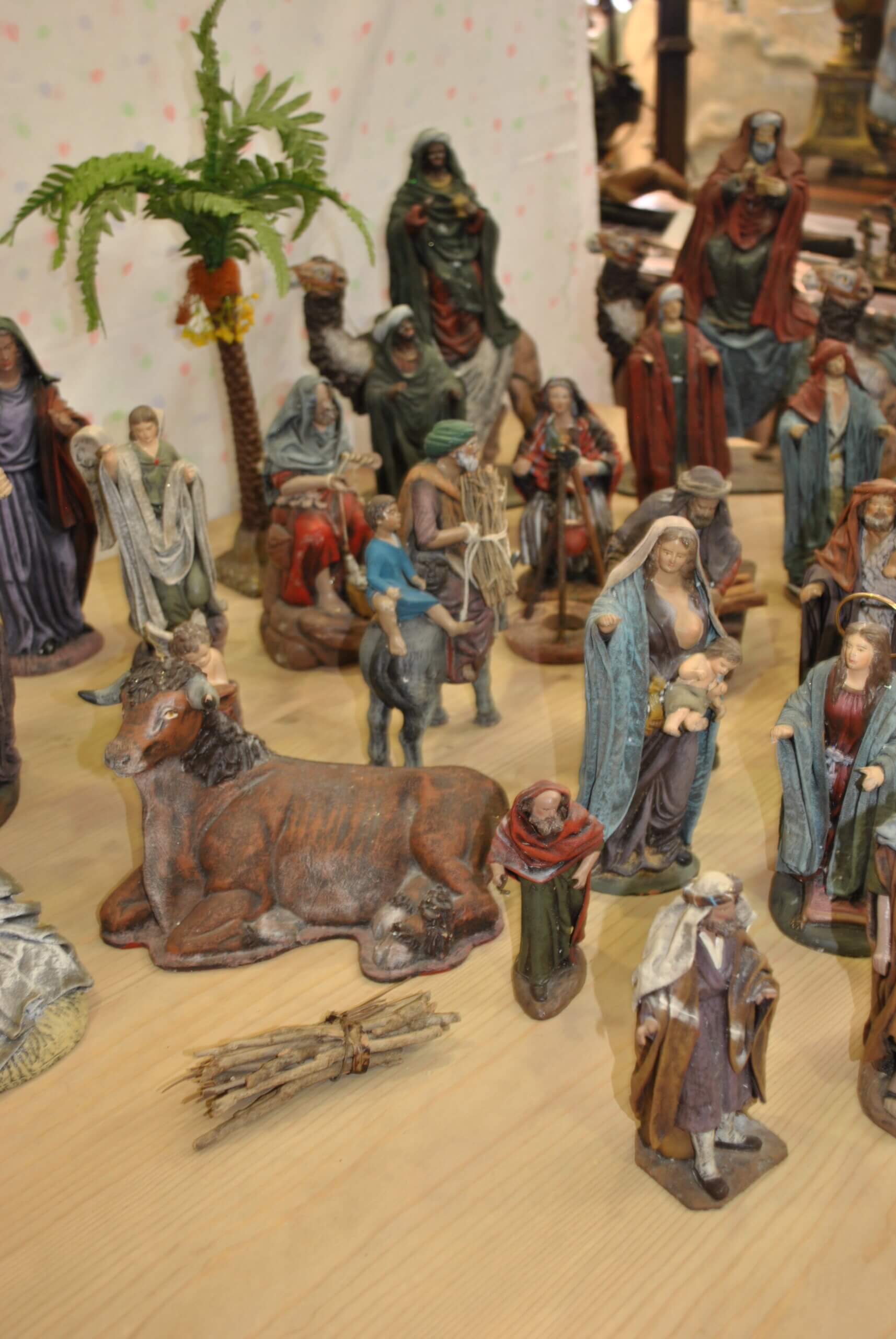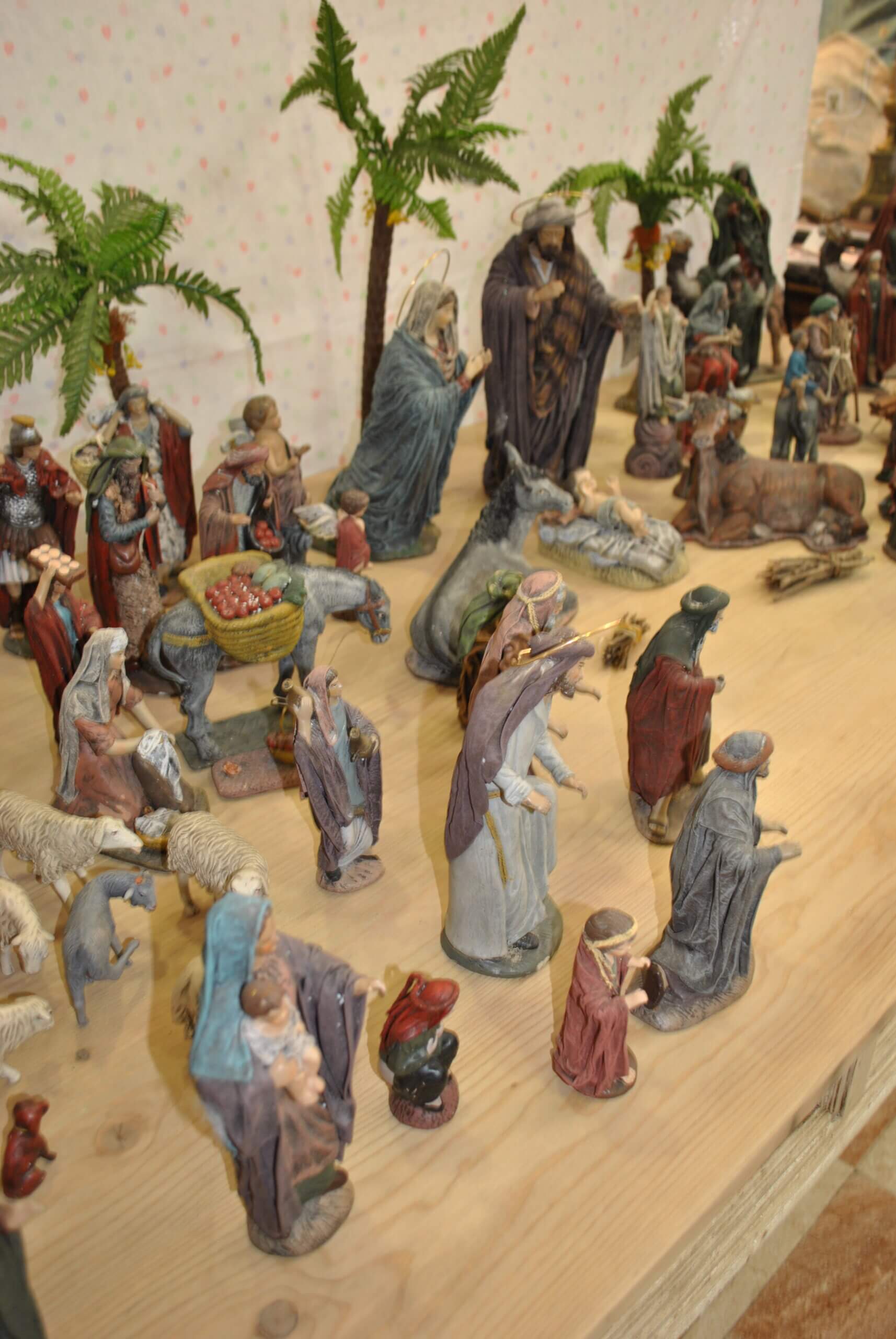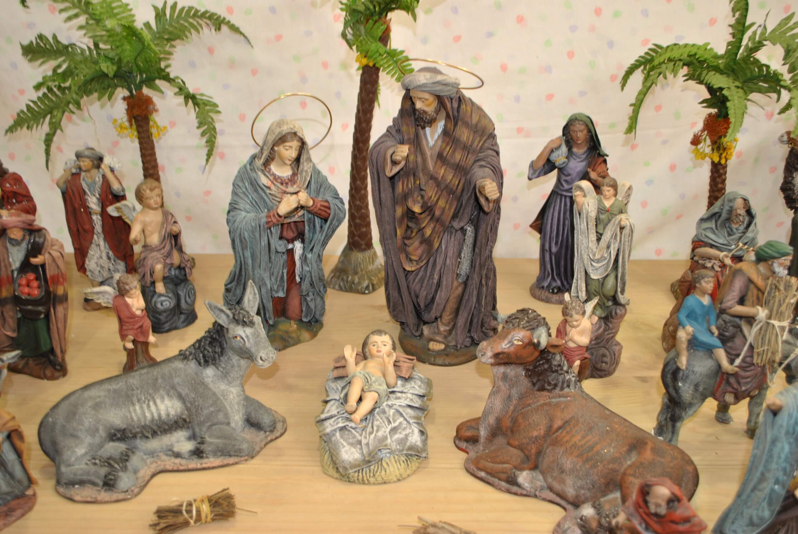 REF: 11880 – Magnífico belén artesanal compuesto por 72figuras policromadas pintadas a mano por J. Fernández con gran detalle, que incluyen la Sagrada Familia, los Reyes Magos con su séquito, pastores, aldeanos, animales y palmeras decorativas, todas dispuestas sobre una sólida mesa de madera maciza con acabado envejecido en blanco decapado. Las figuras, de entre 12 y 28 cm de altura, destacan por su realismo y expresividad, convirtiendo este conjunto en una pieza única ideal para coleccionistas, decoración de iglesias, capillas o espacios religiosos, así como para realzar escaparates y salones durante la Navidad.