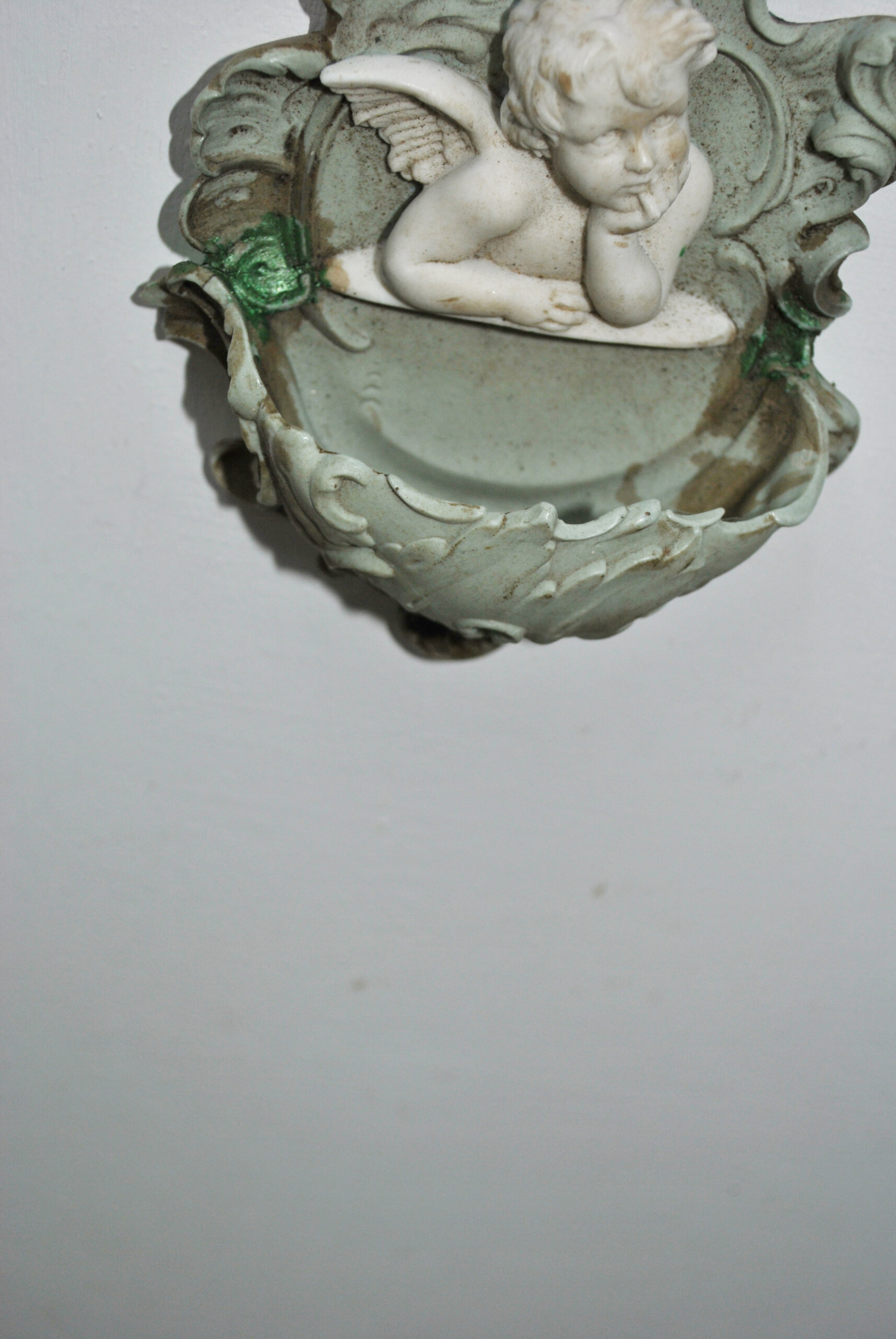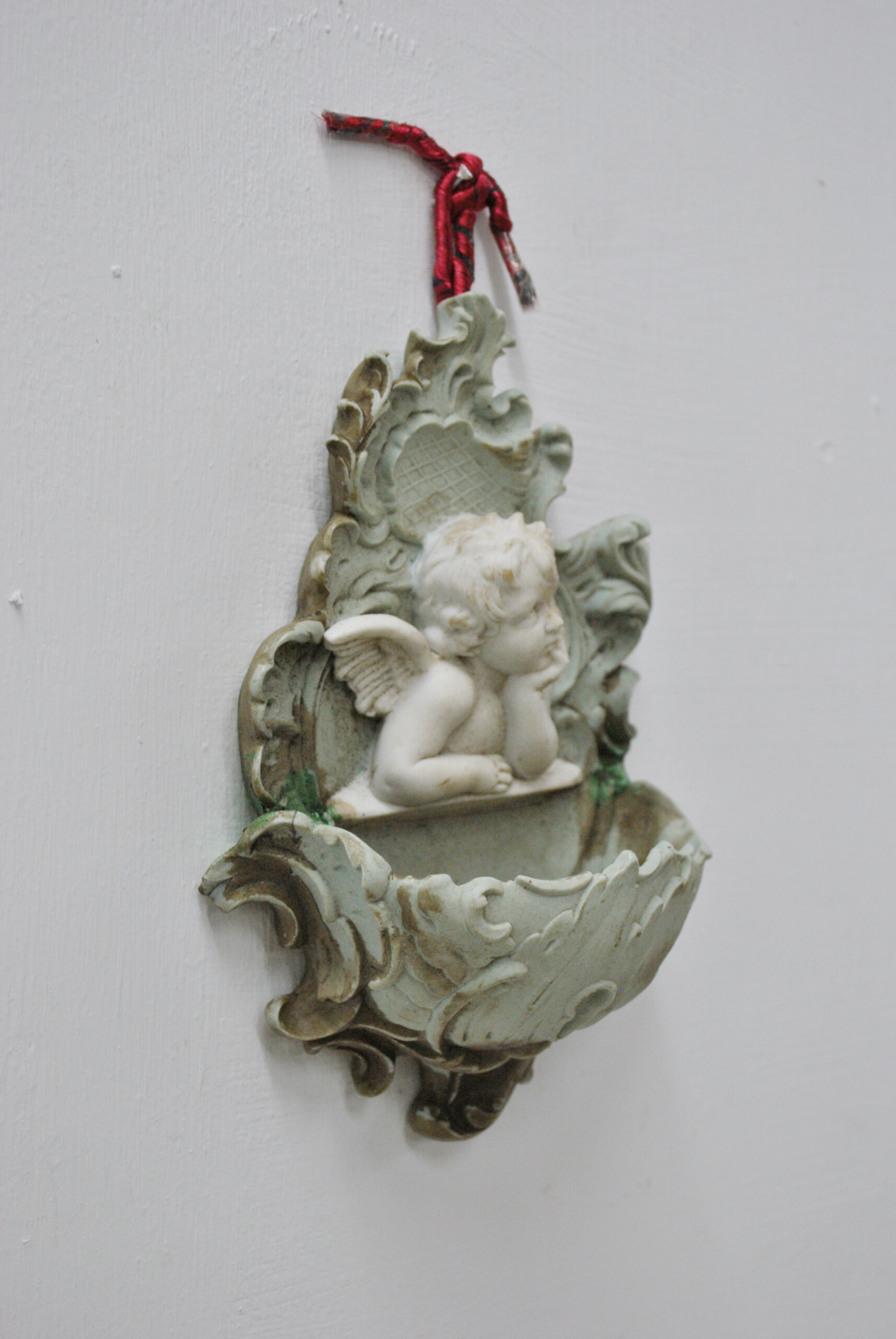 En el centro tiene la figura de un ángel (querubín) apoyado, con mucho detalle, lo que la hace muy especial y llamativa. En la parte inferior lleva el cuenco para el agua bendita.