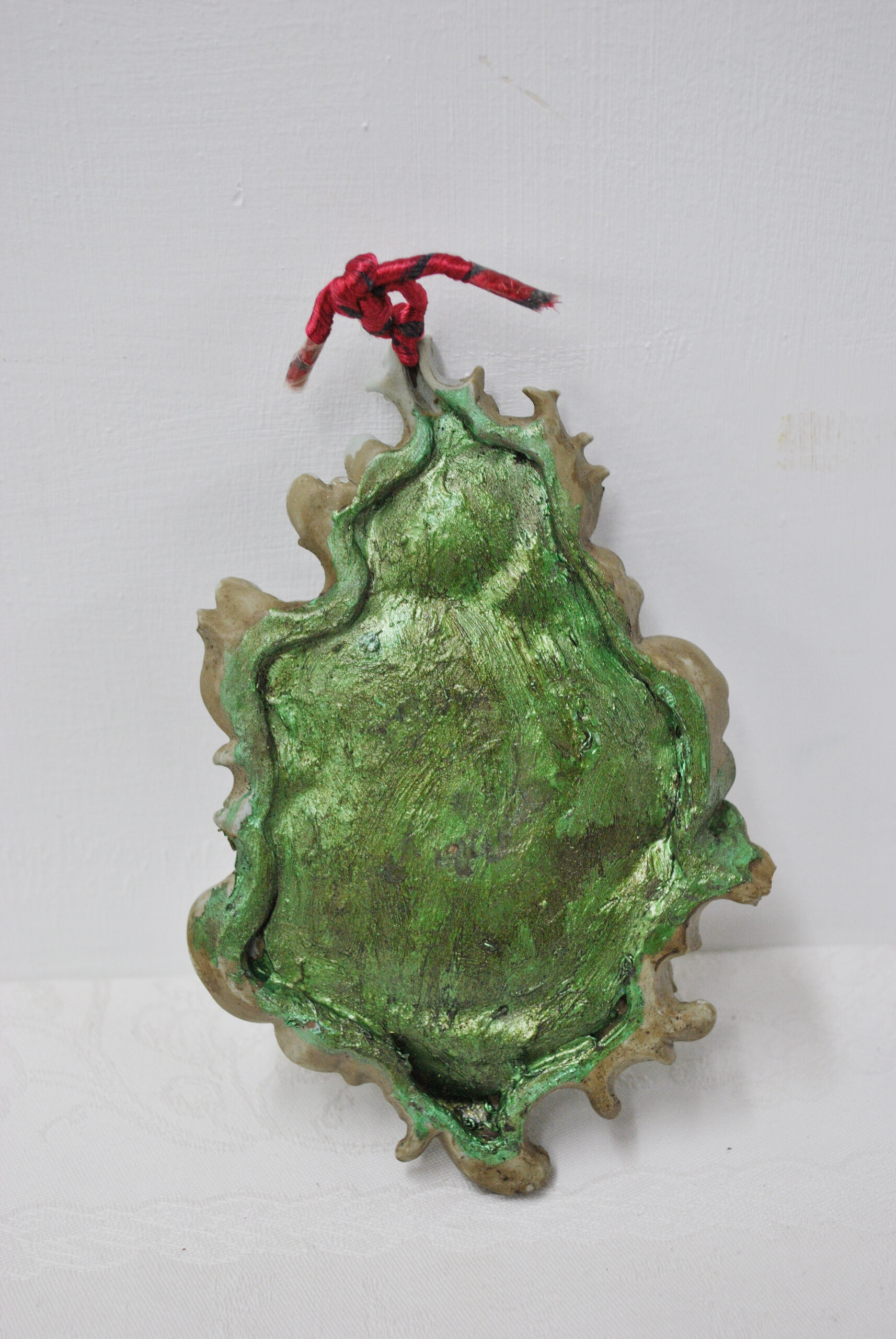 REF: 12405 – Bonita benditera antigua para colgar en la pared, con un diseño muy decorativo. Está hecha en biscuit con acabado envejecido en tonos verdes y beige que le da un aspecto antiguo.