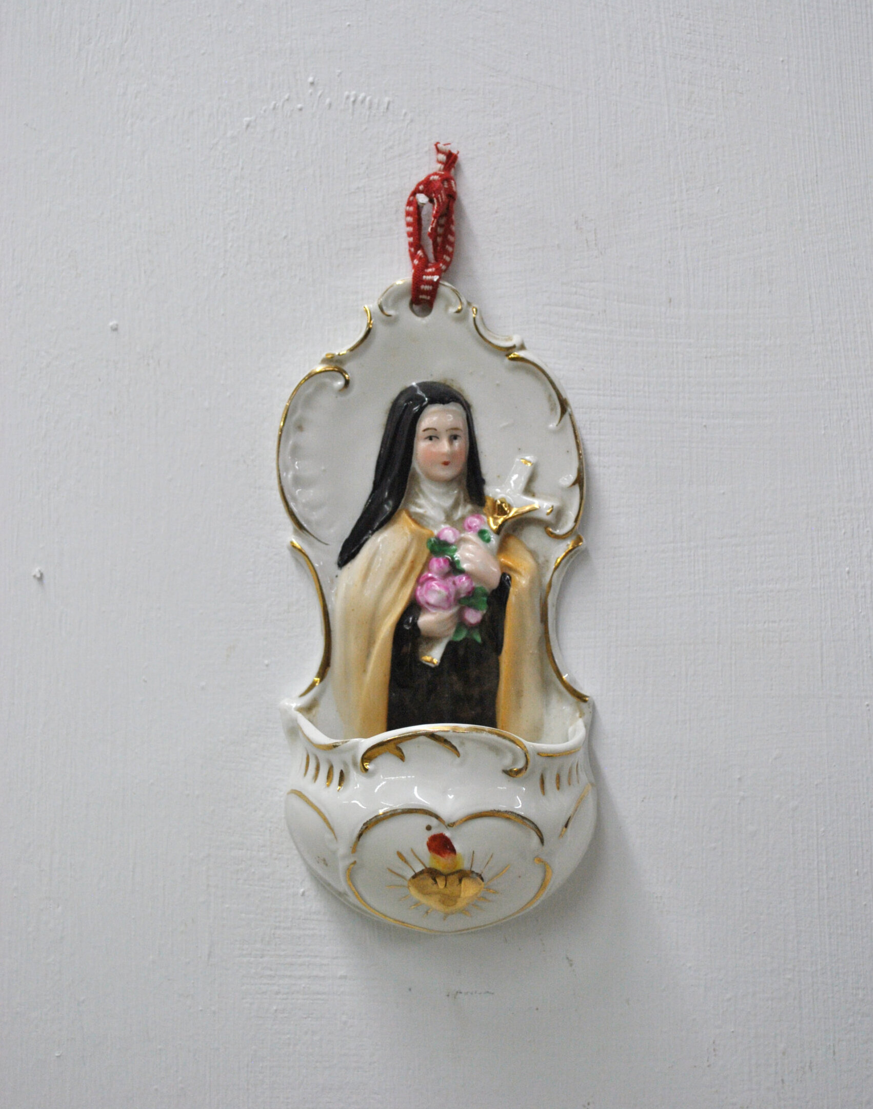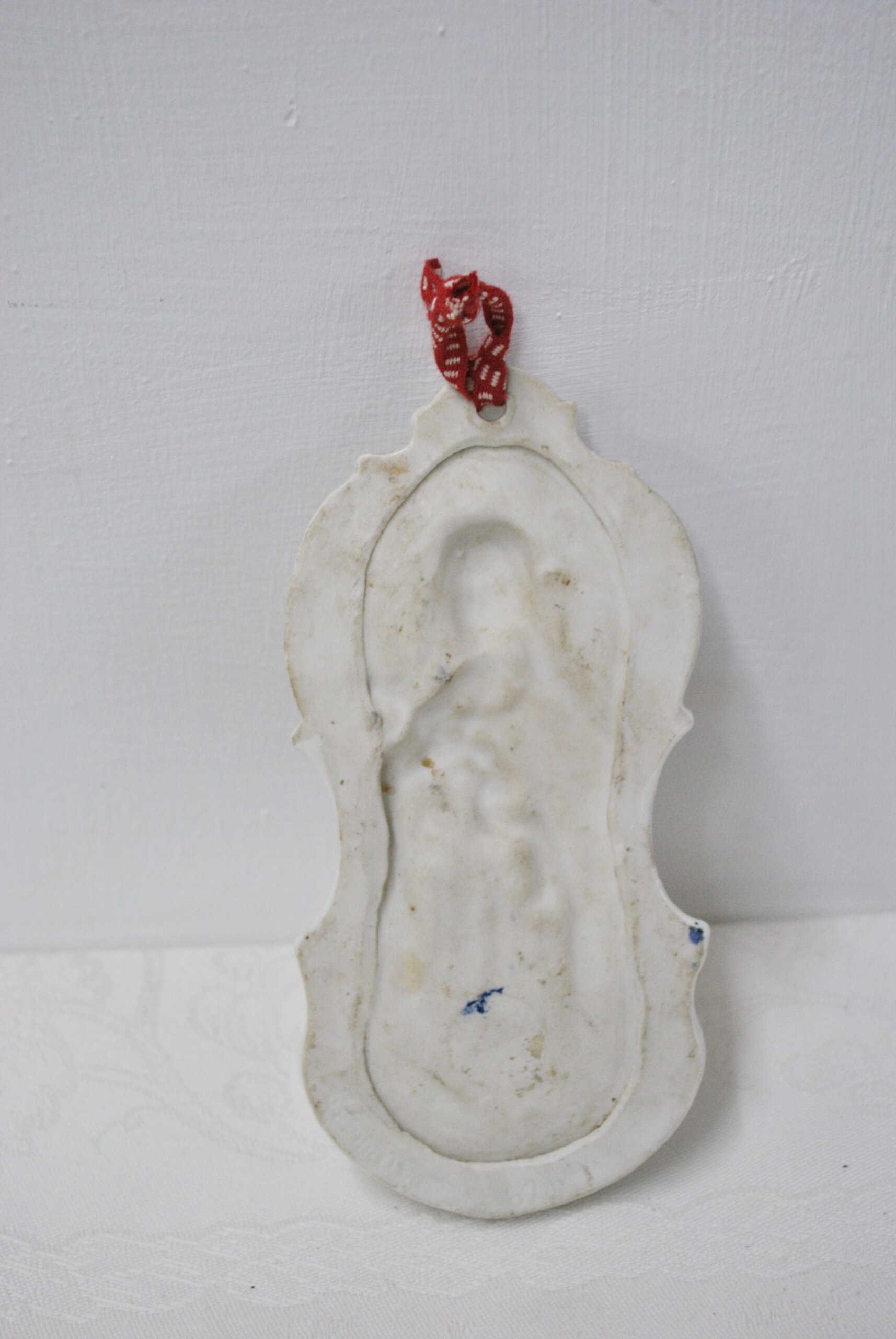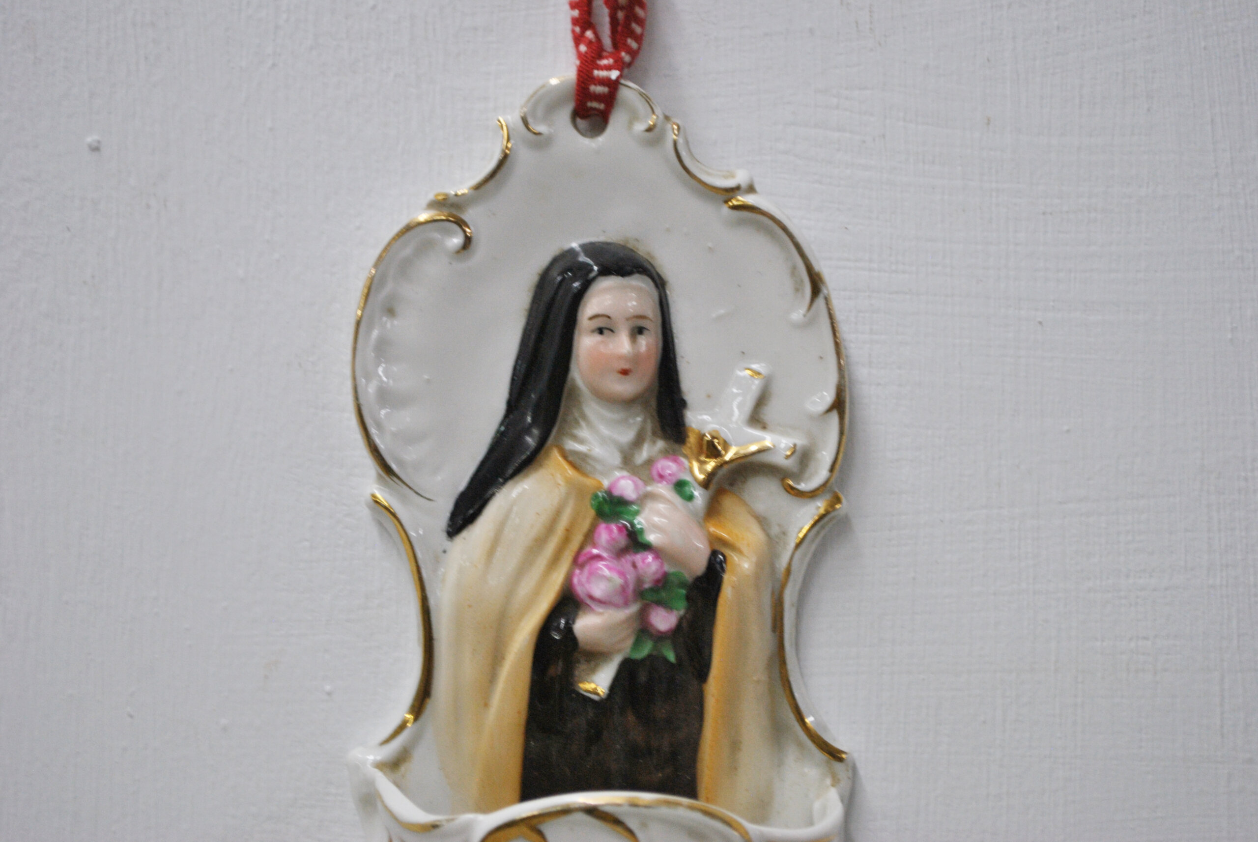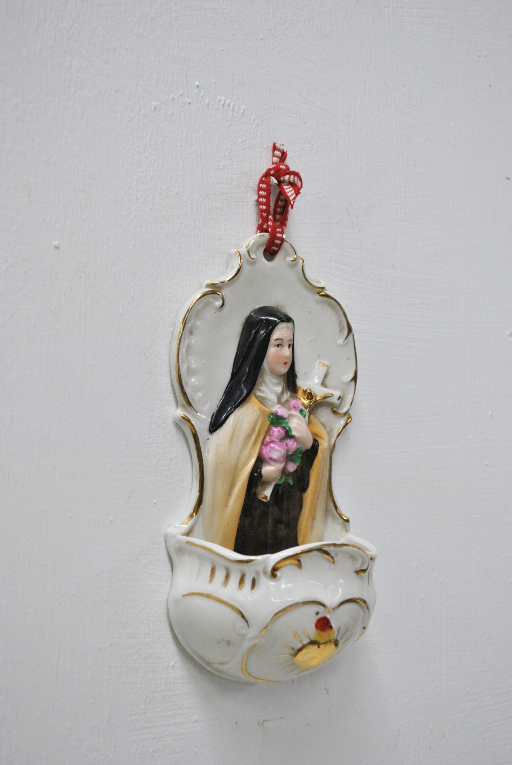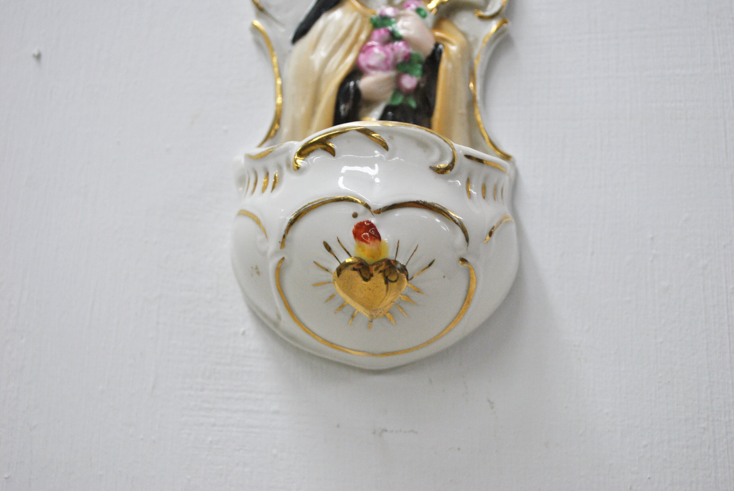 REF: 12404 – Bonita benditera antigua de pared hecha en porcelana, con un diseño muy decorativo y delicado. En el centro lleva una figura en relieve de Santa Teresa, con detalles pintados en colores suaves y toques dorados.