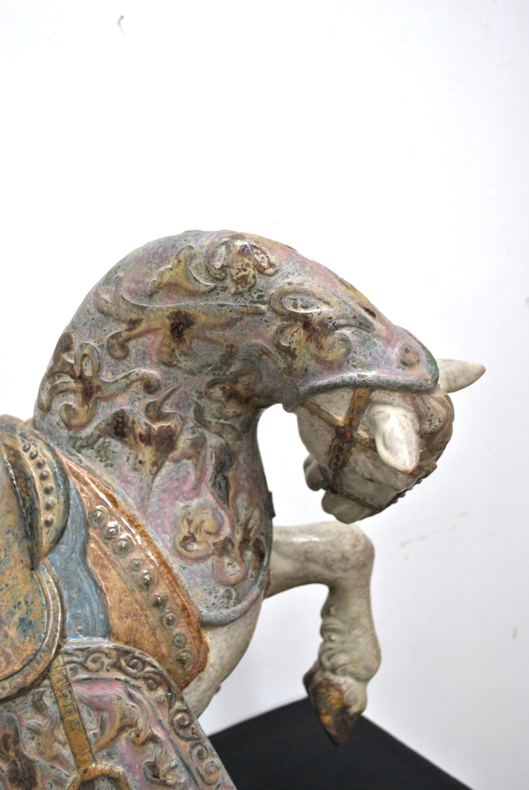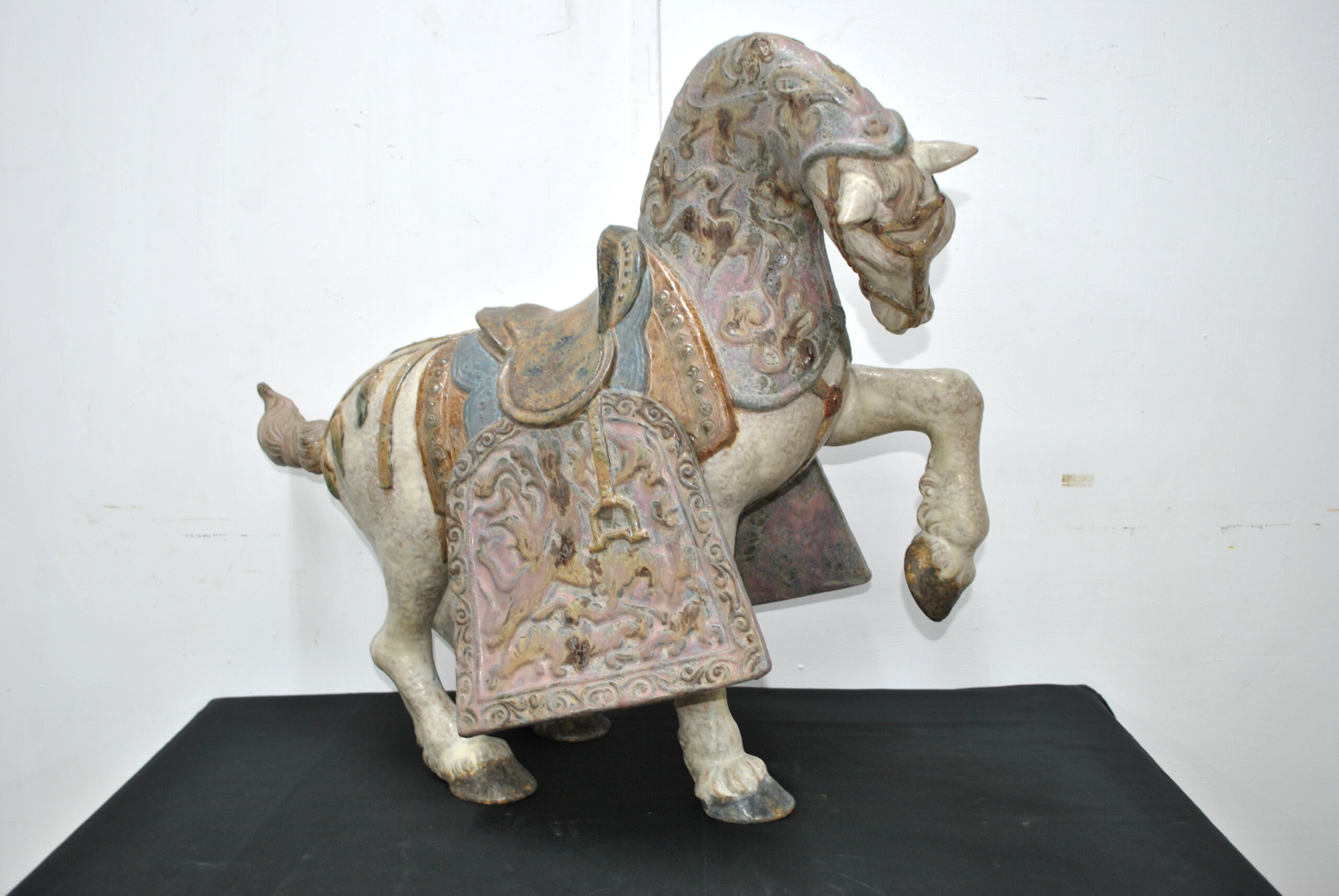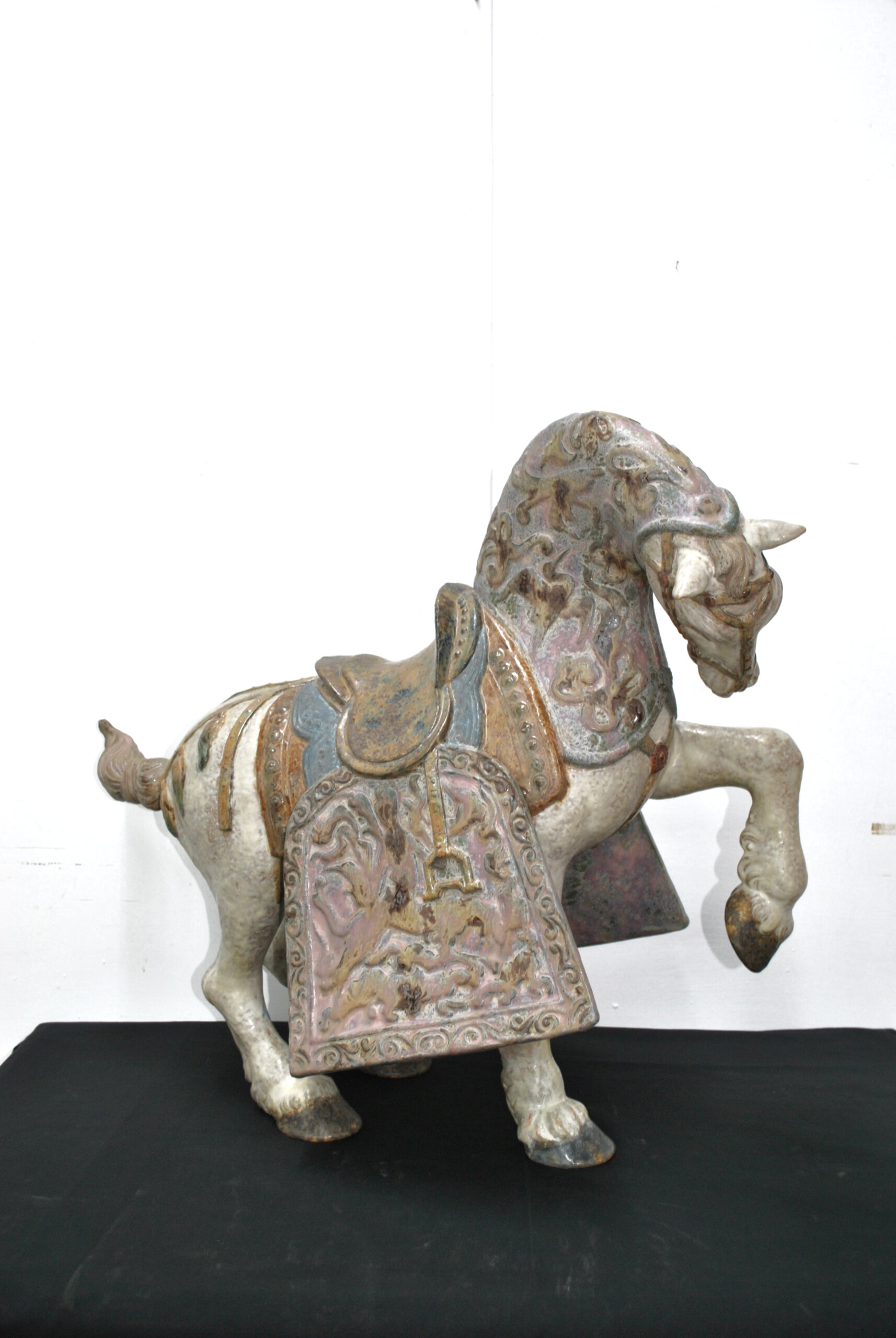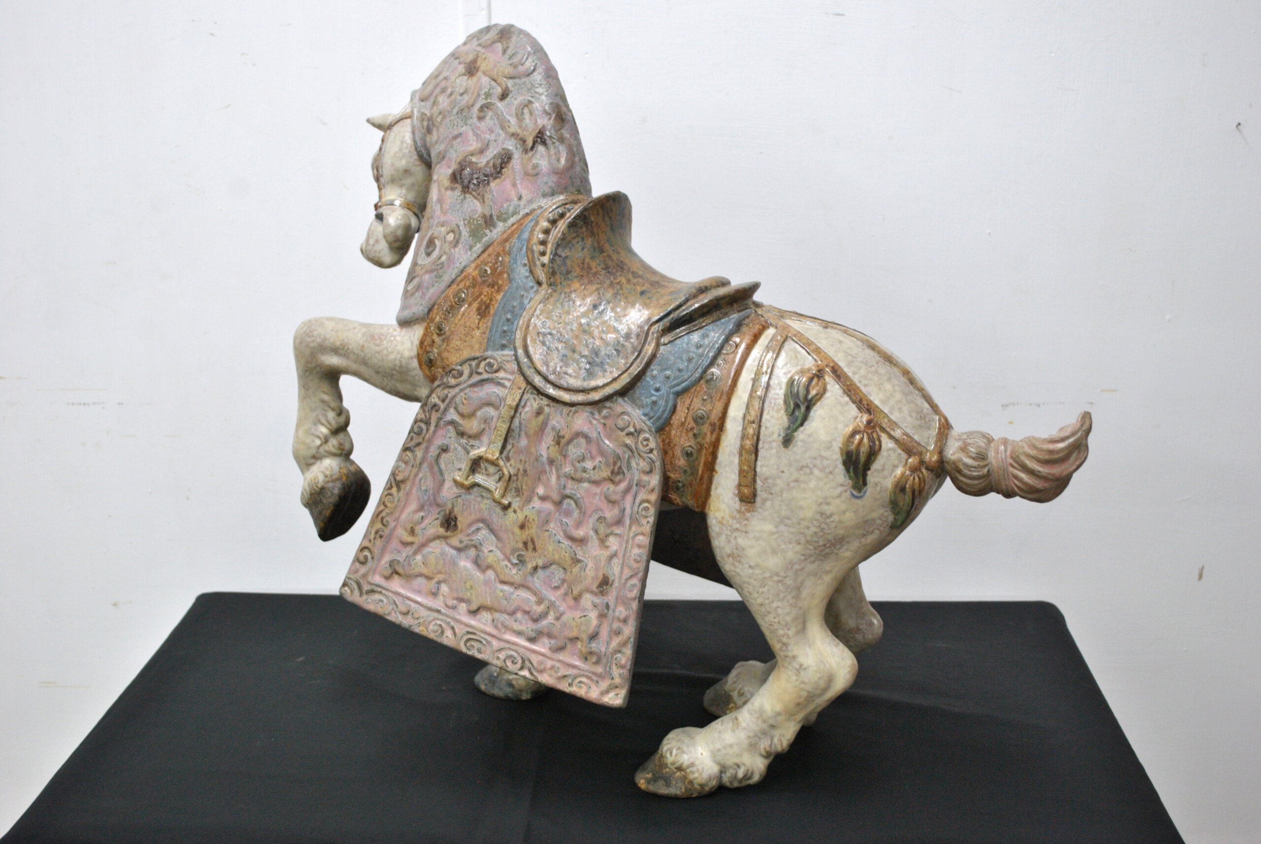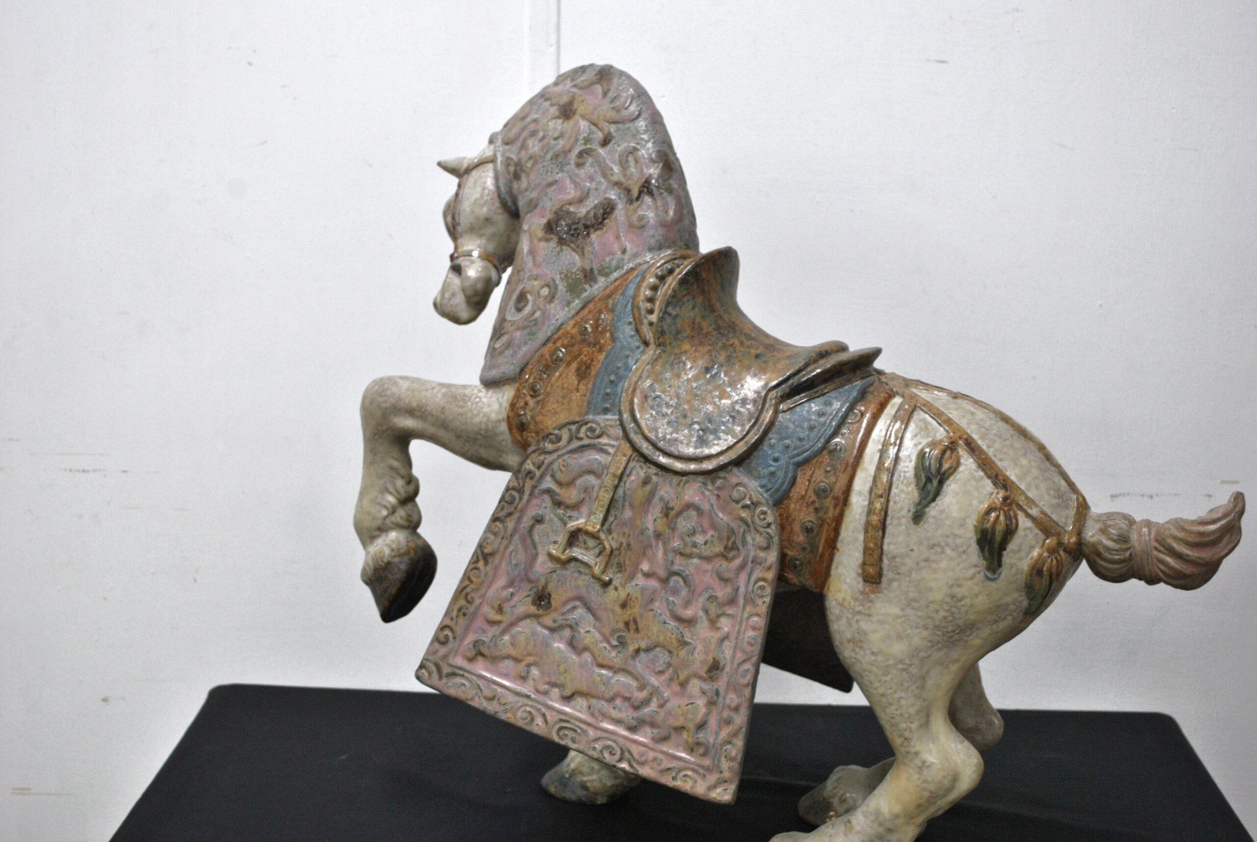 La figura representa un caballo de inspiración Tang, erguido sobre tres patas y con una en alto, en actitud majestuosa y movimiento contenido. El cuerpo, de modelado firme y equilibrado, luce una rica decoración en relieve con bridas, mantos y silla ornamentados con motivos vegetales y roleos típicos del arte oriental reinterpretado bajo la elegancia mediterránea del sello Lladró.