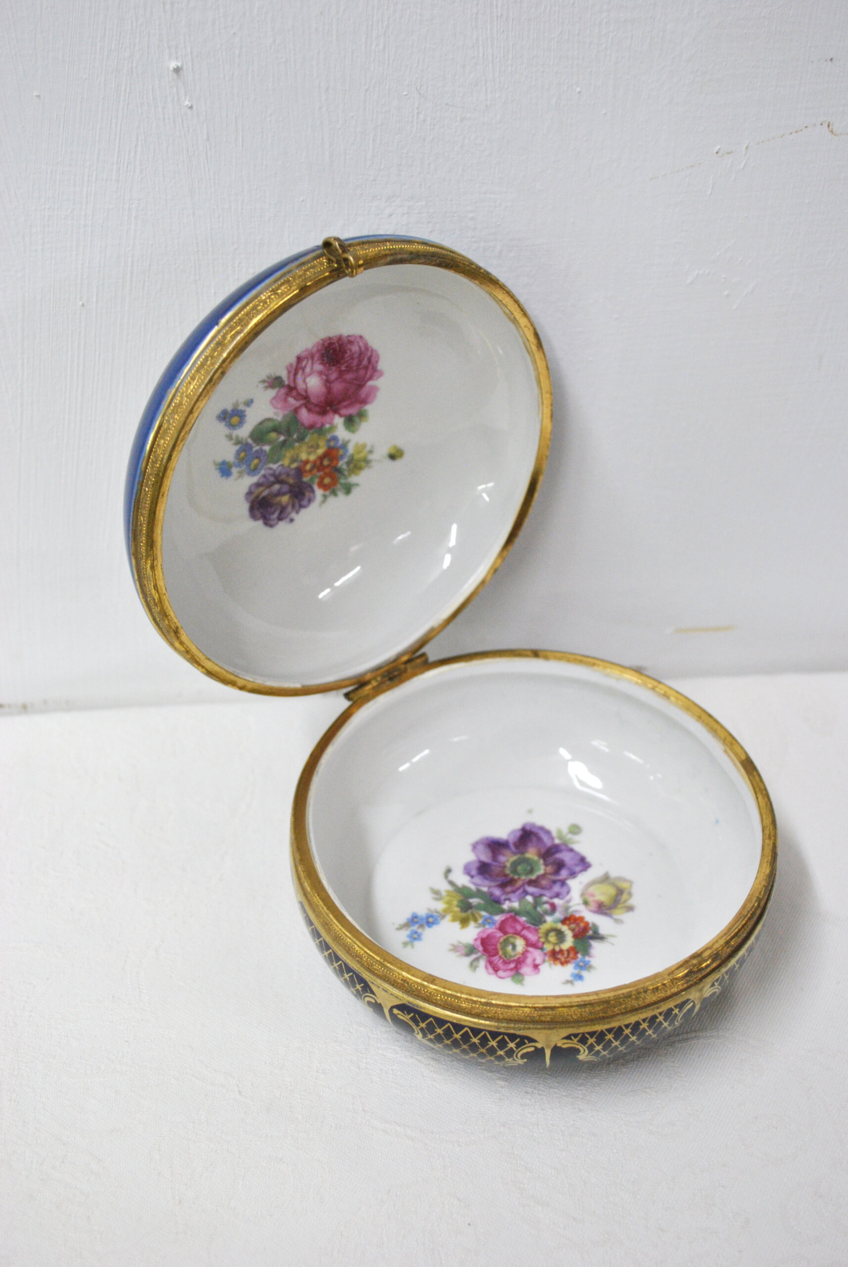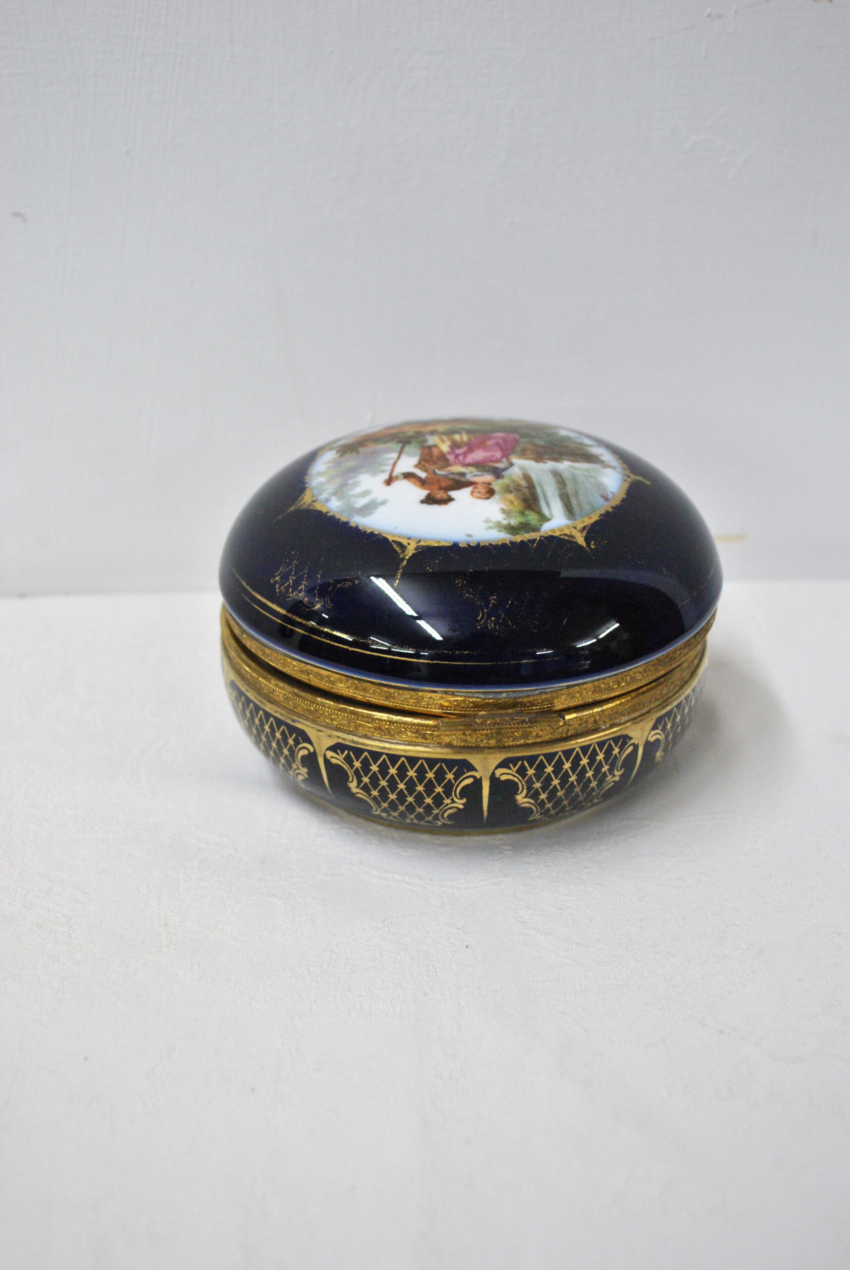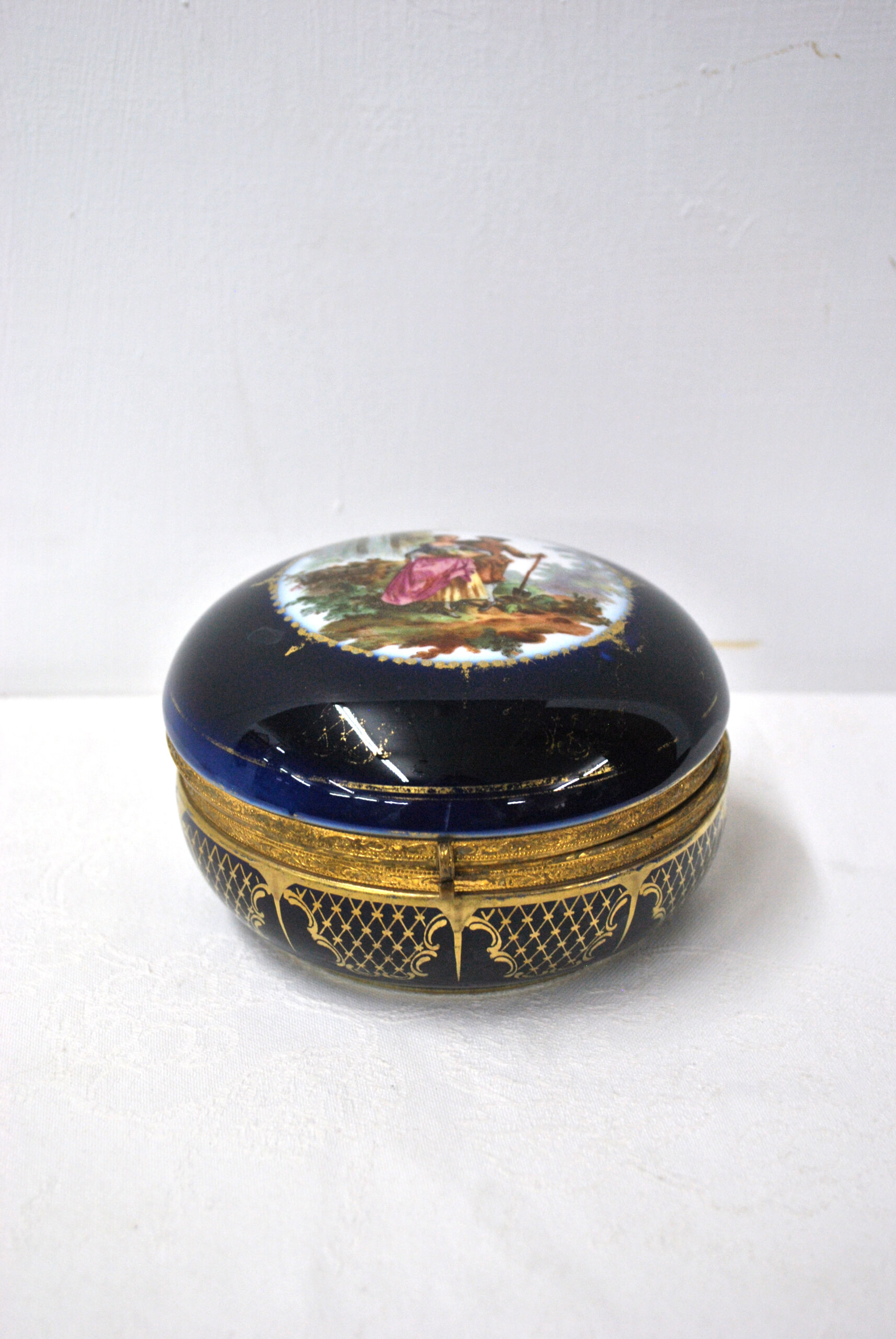 REF: 11901 – Elegante caja o joyero de porcelana esmaltada, de forma circular y tono azul cobalto profundo, con delicados detalles dorados y montura de bronce dorado finamente cincelado. En la tapa presenta una exquisita escena galante pintada a mano, representando una pareja romántica en un paisaje bucólico. El interior está decorado con motivos florales policromos, tanto en la base como en la tapa, evidenciando la meticulosa labor artesanal de su manufactura. El borde metálico, de color oro envejecido, enmarca la pieza con elegancia y está dotado de bisagra funcional y cierre de presión.