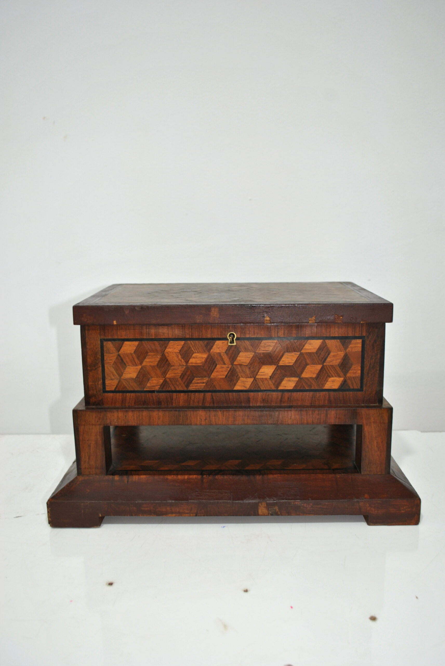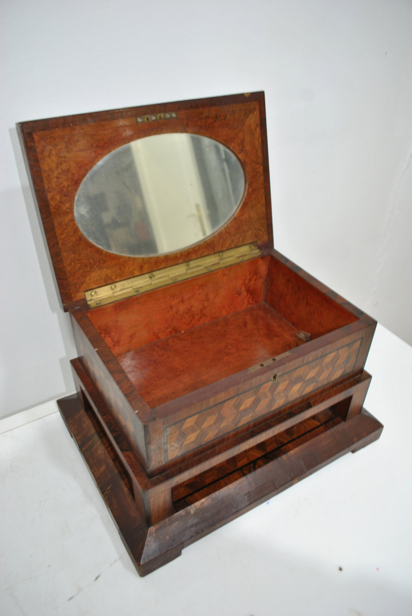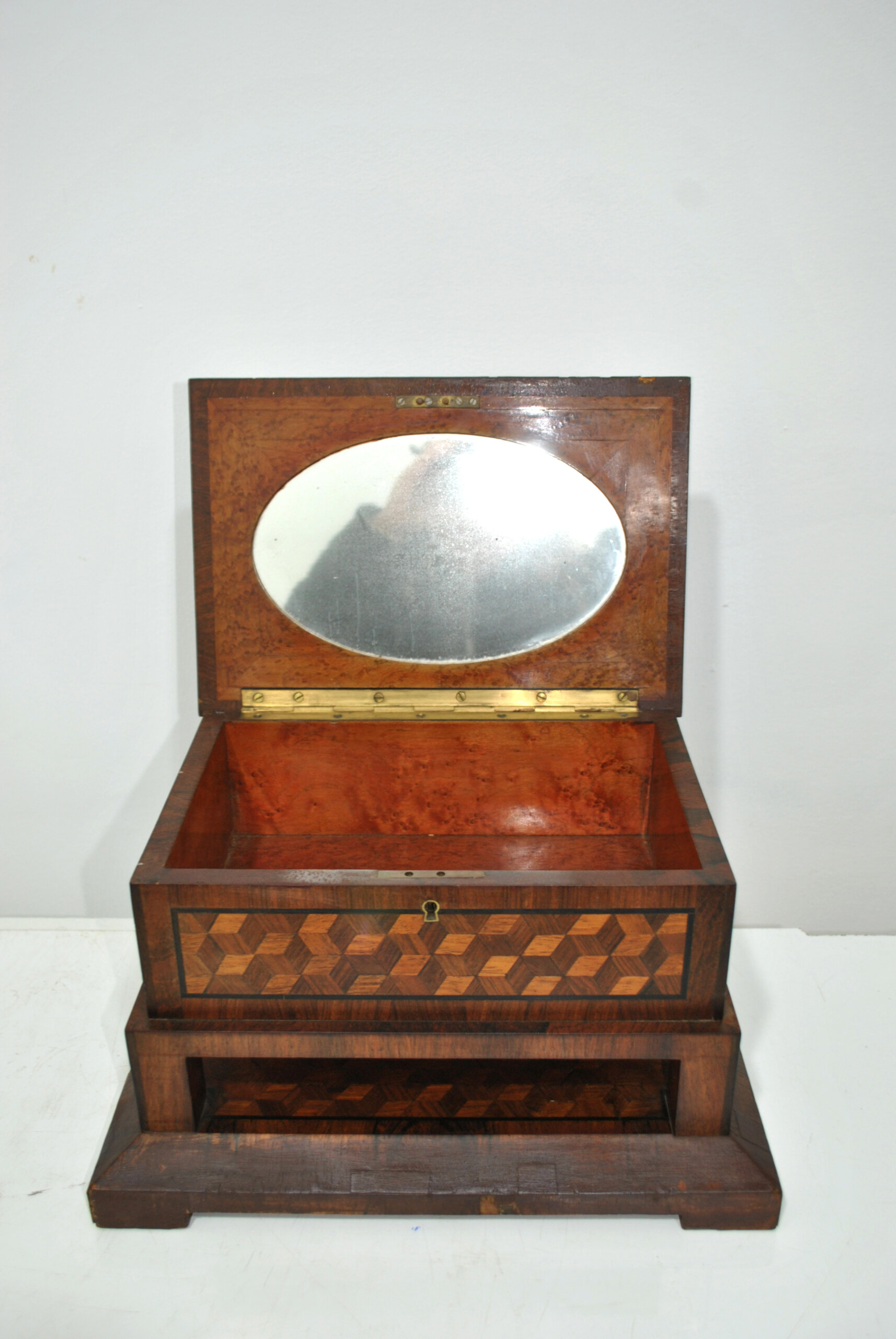 Presenta un elaborado trabajo de taracea con motivos geométricos en forma de cubos, tanto en la tapa como en el frontal, realizado con distintas maderas que crean un bonito contraste de tonos. La tapa abatible conserva en su interior un espejo ovalado, lo que la convierte en una práctica caja tocador o joyero.