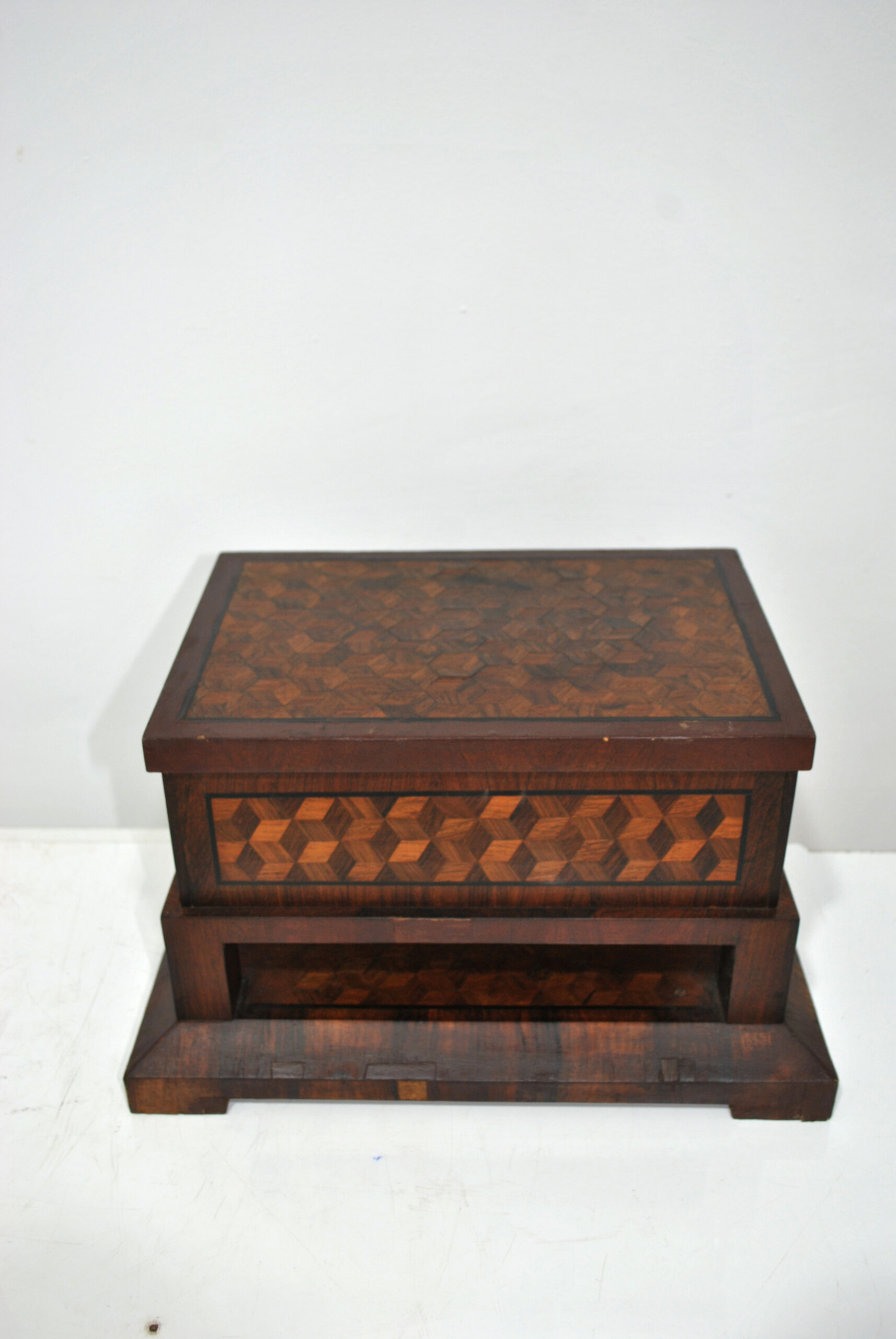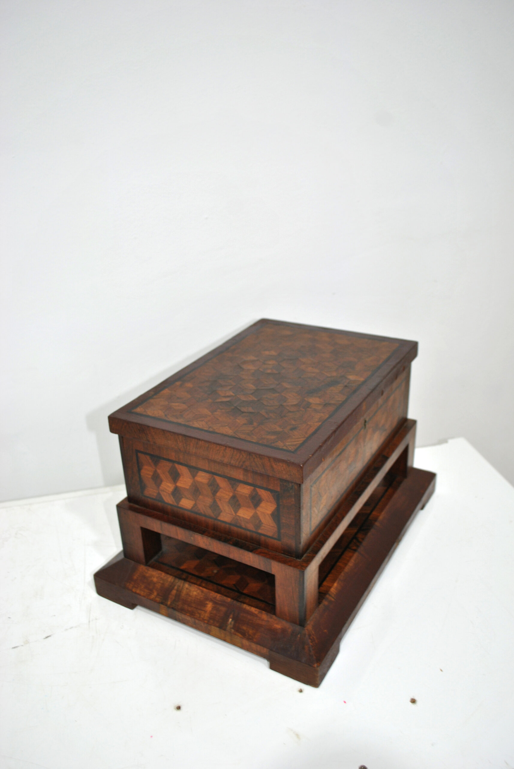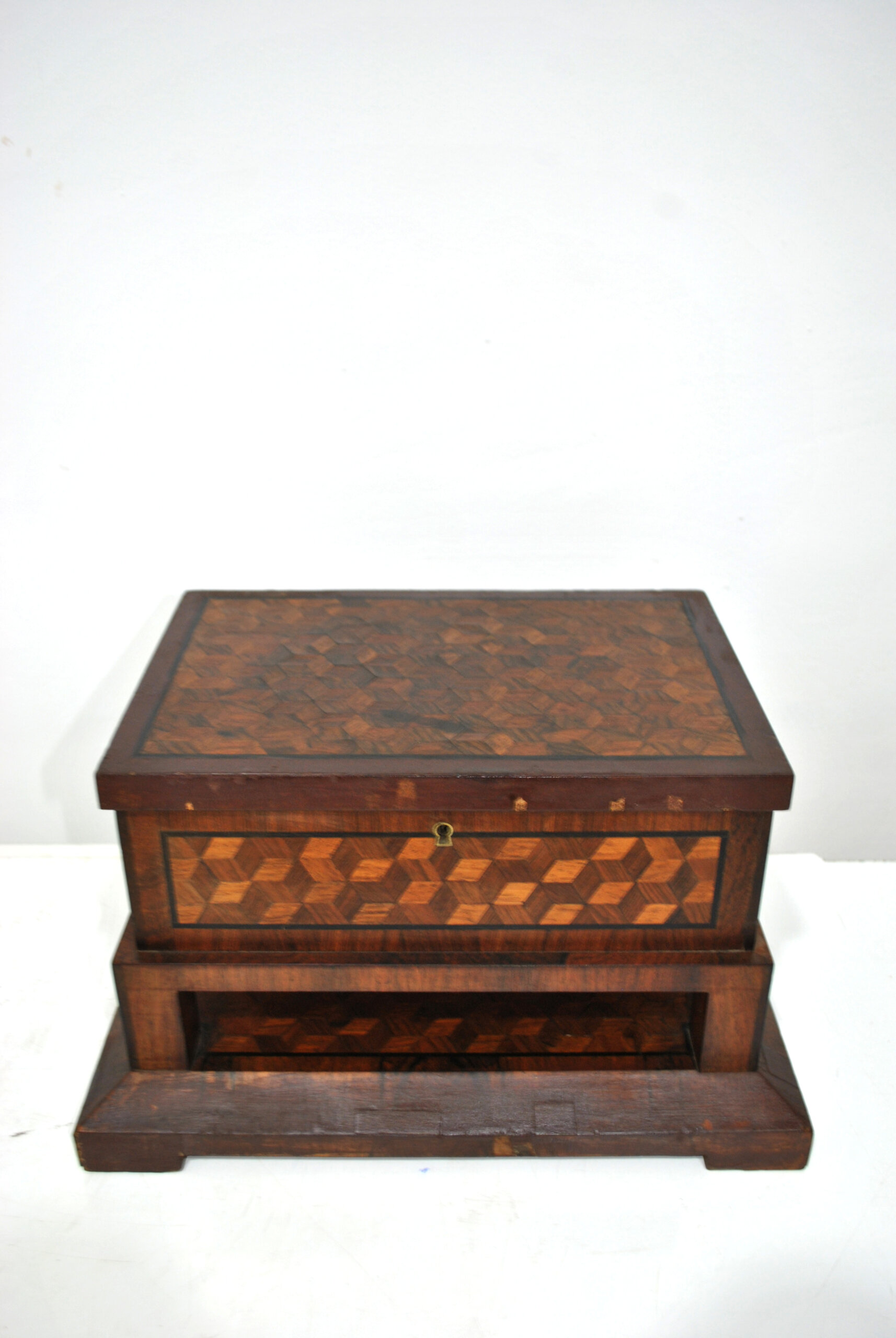Presenta un elaborado trabajo de taracea con motivos geométricos en forma de cubos, tanto en la tapa como en el frontal, realizado con distintas maderas que crean un bonito contraste de tonos. La tapa abatible conserva en su interior un espejo ovalado, lo que la convierte en una práctica caja tocador o joyero.