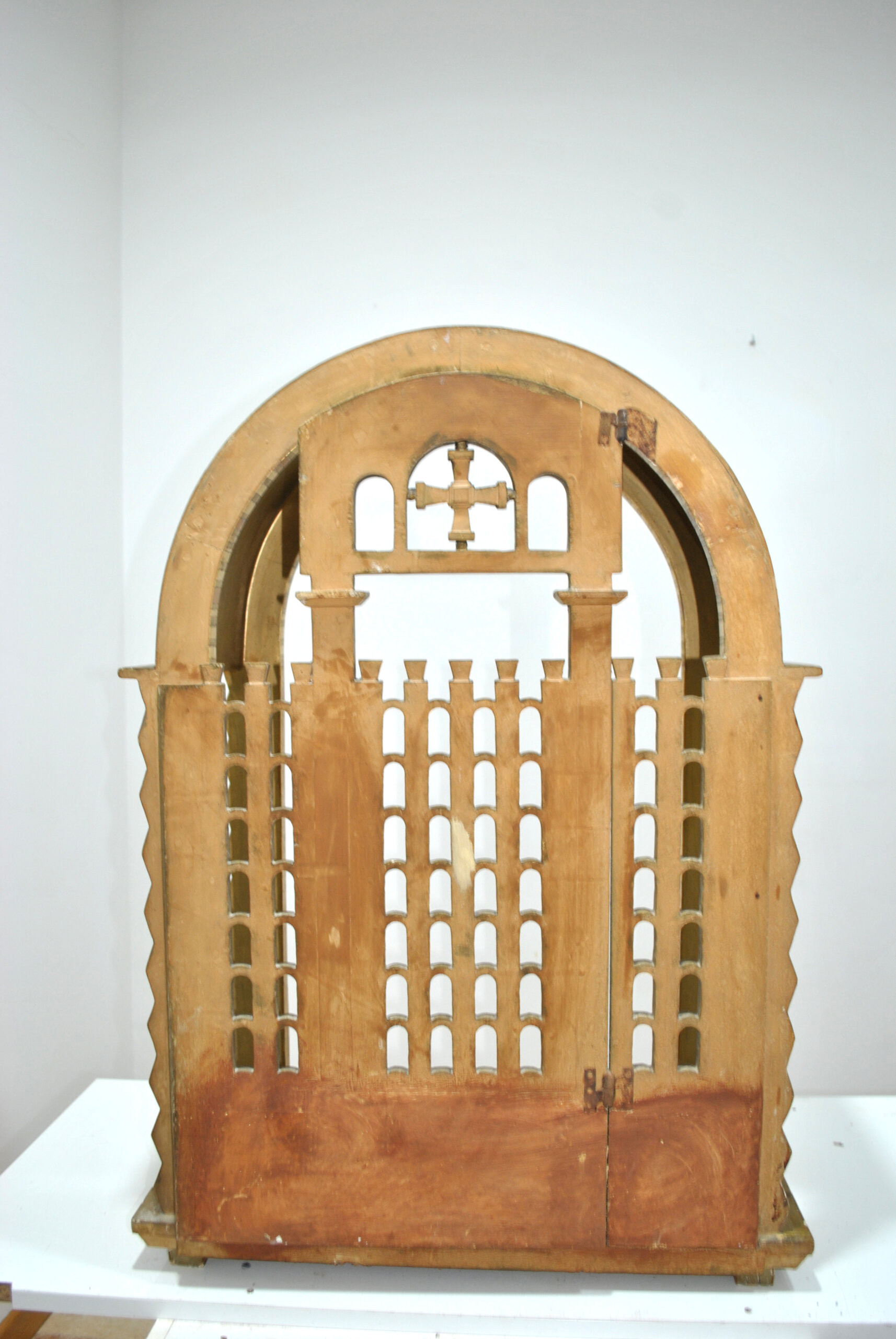 La parte superior presenta un arco decorado con motivos geométricos grabados y, en el centro, una pequeña cruz situada entre tres arcadas, elemento simbólico típico del arte religioso. En el interior se crea un espacio a modo de pequeño altar o nicho donde colocar una talla religiosa, virgen, santo o crucifijo.