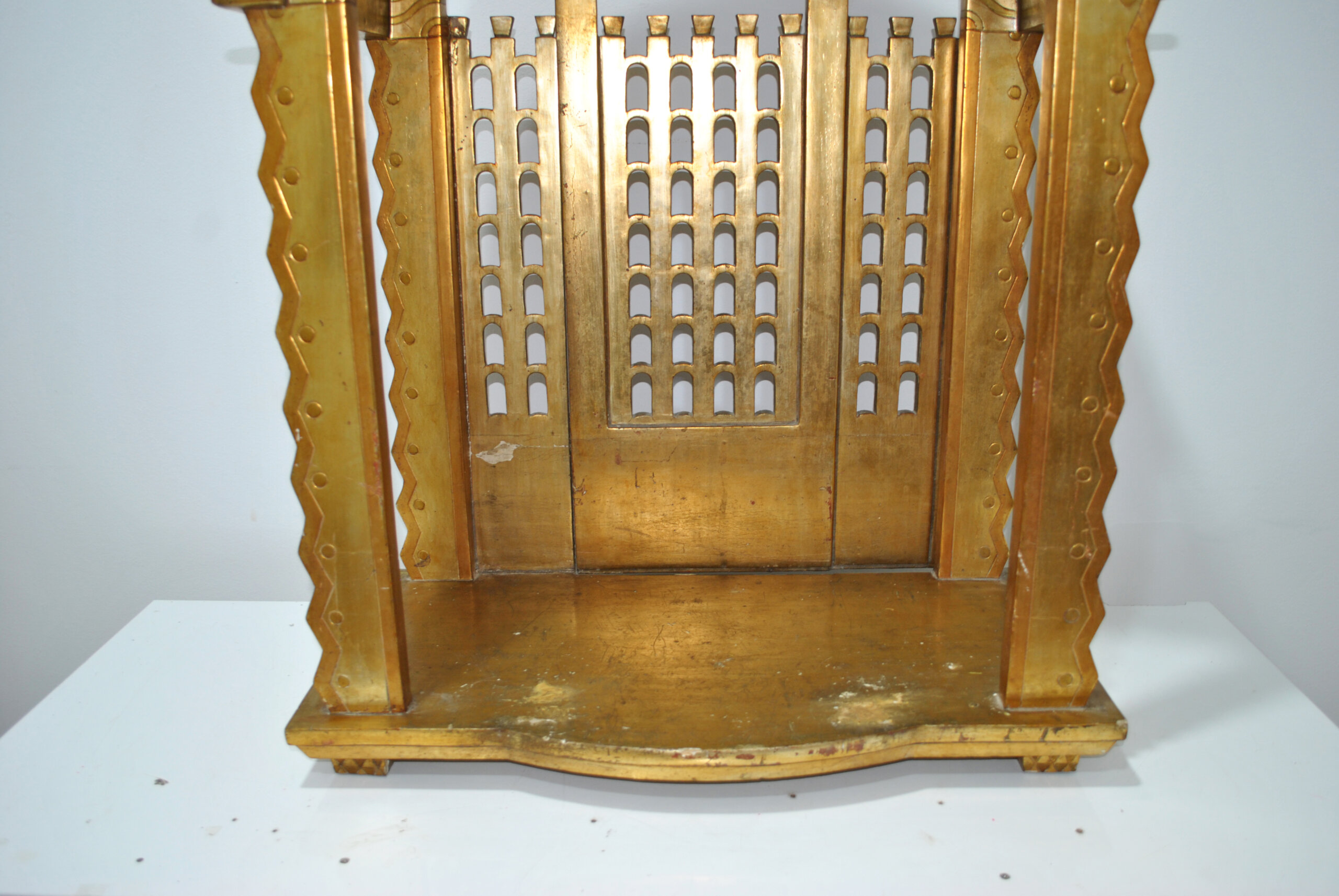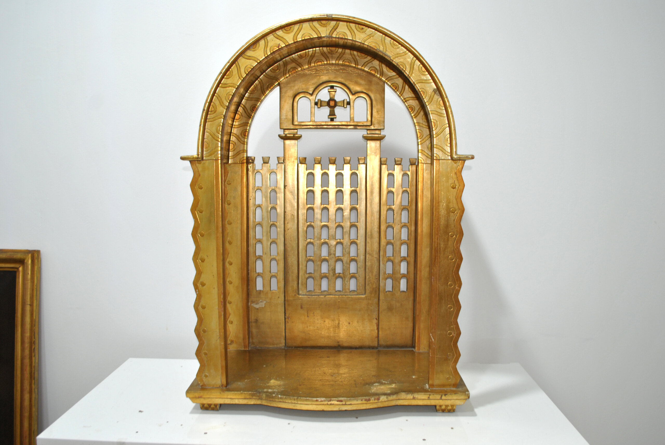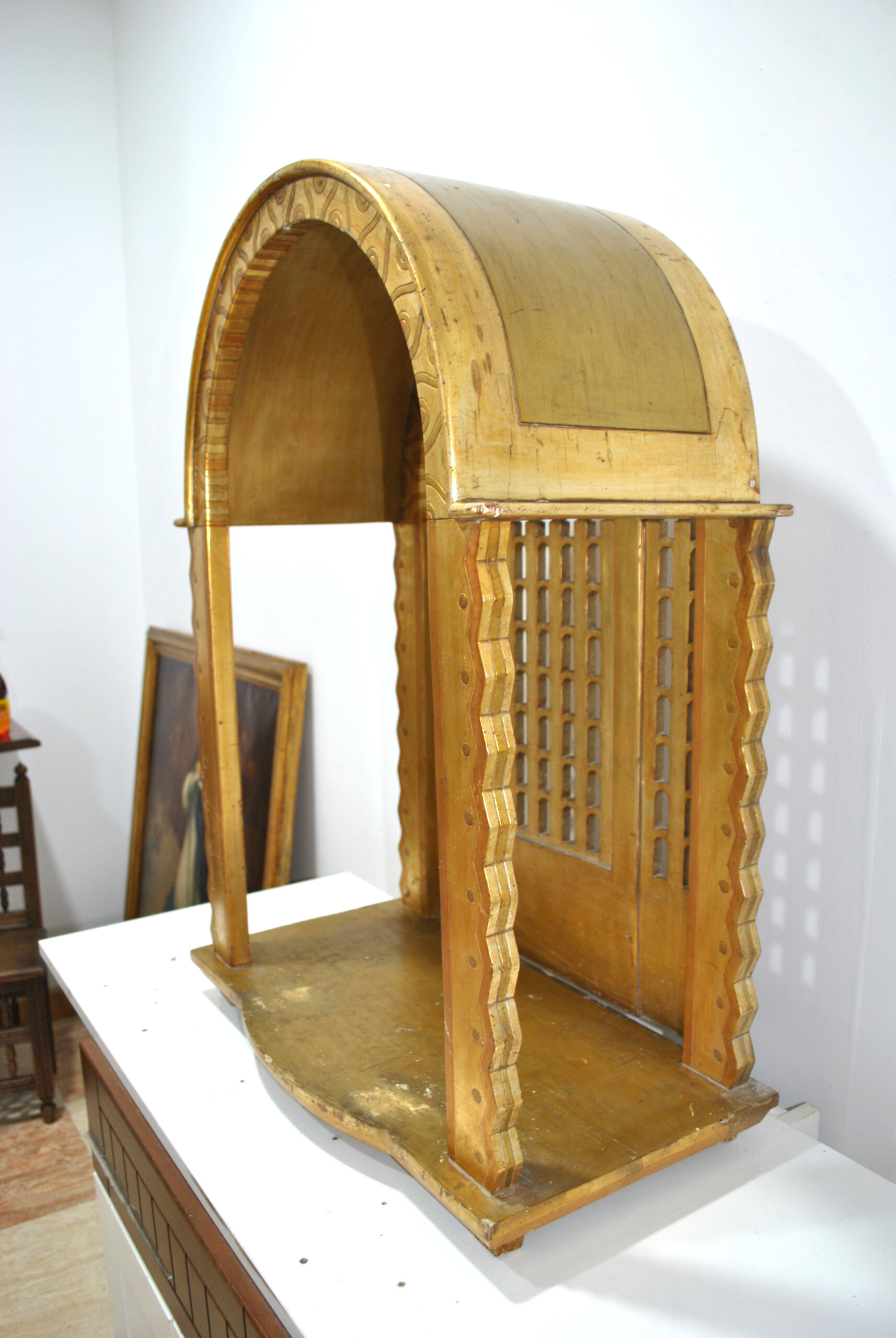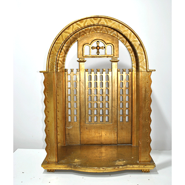 REF: 12287 – Antigua capilla u hornacina de altar realizada en madera tallada y dorada, diseñada para albergar una imagen religiosa. Se trata de una pieza decorativa muy especial, con arquitectura inspirada en templos o retablos, destacando su elegante arco superior, columnas laterales y celosías decorativas que evocan la estética neogótica y eclesiástica.
