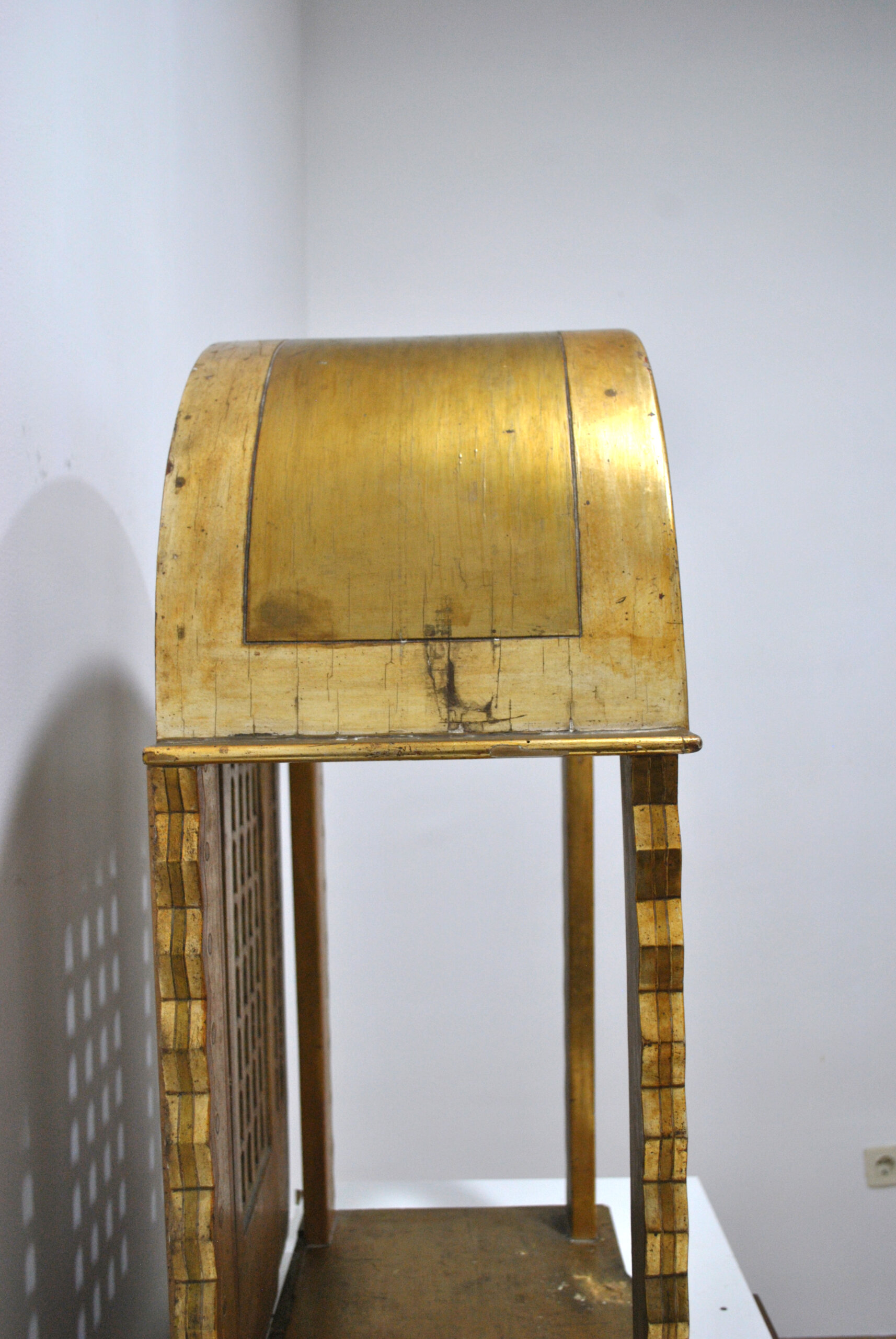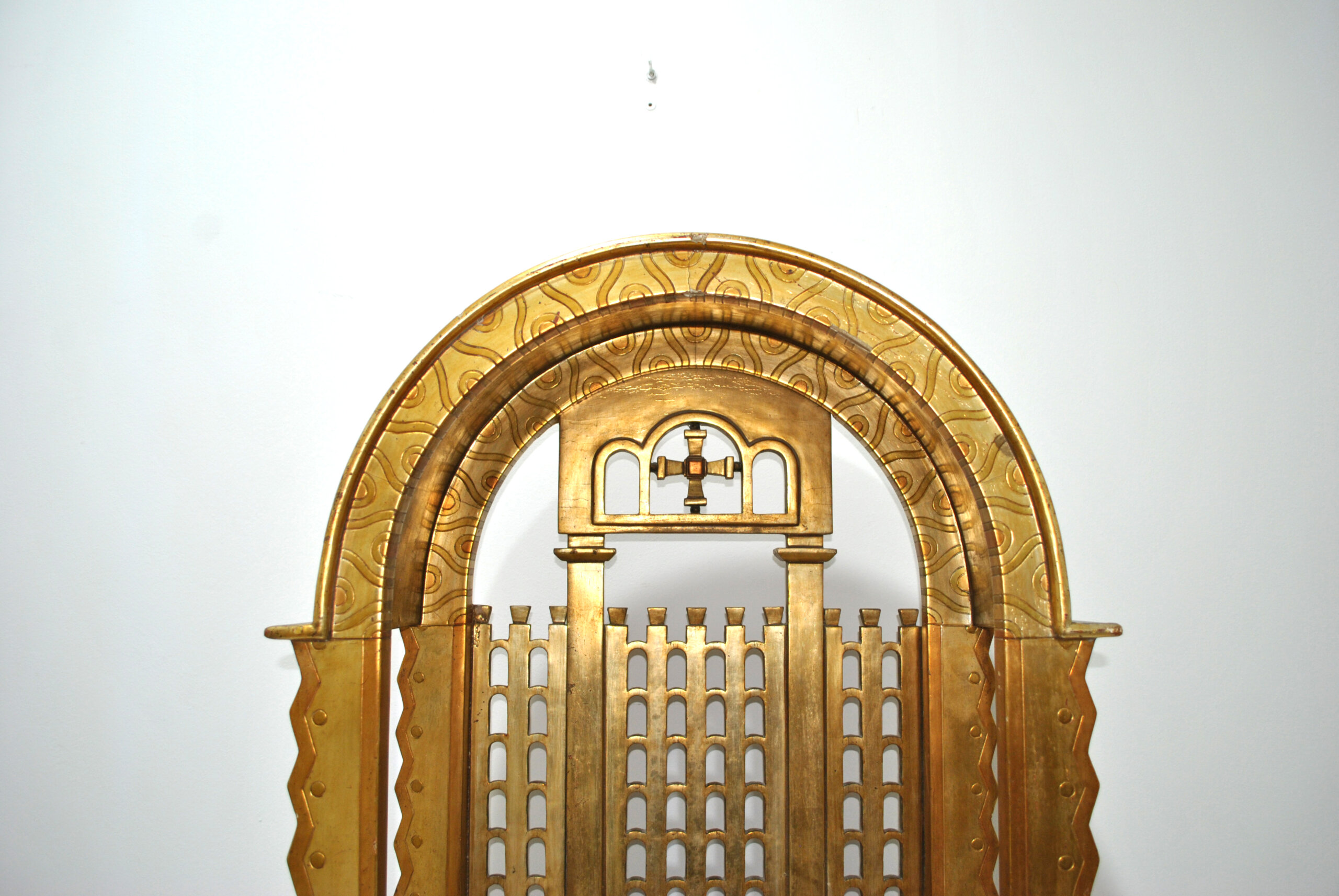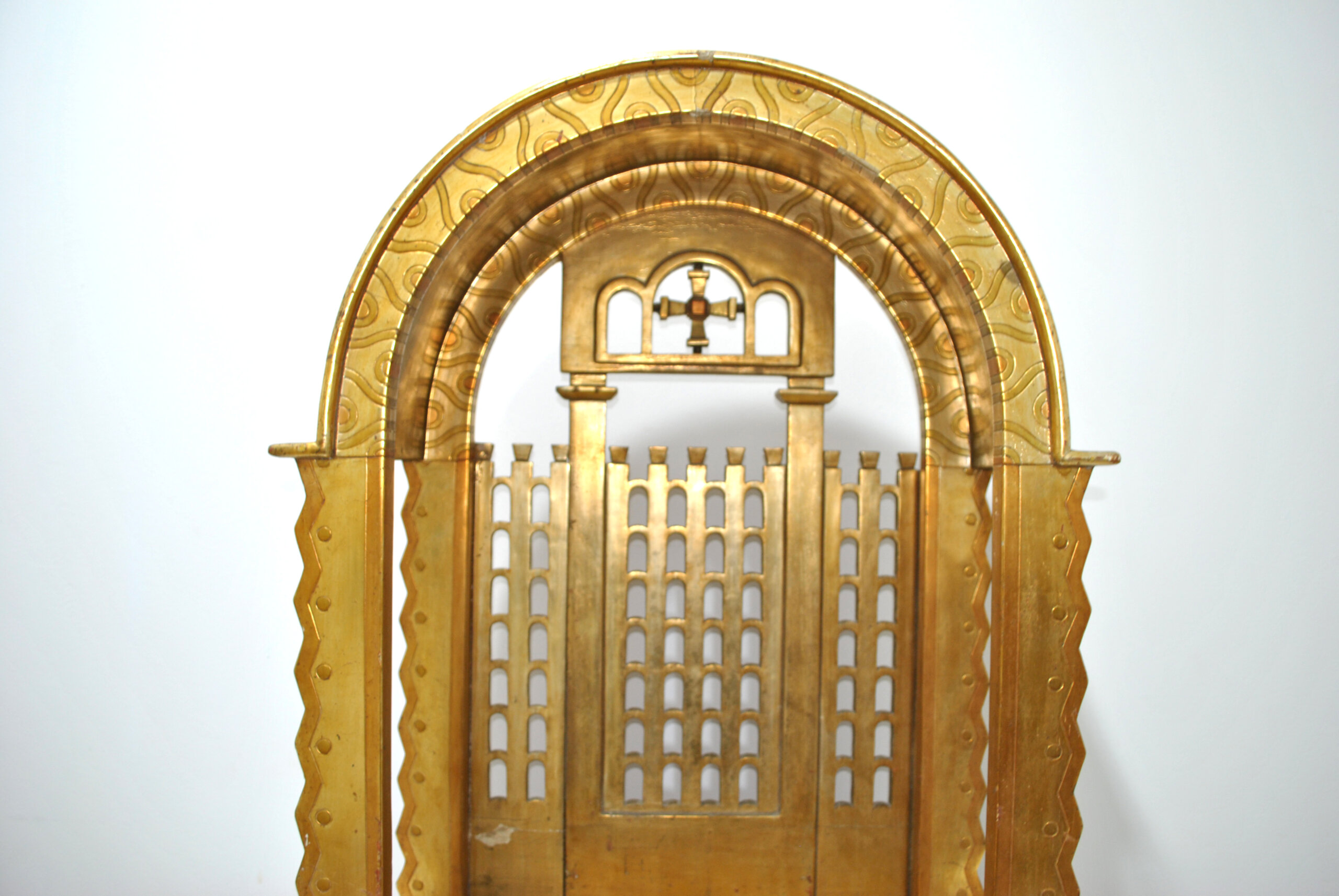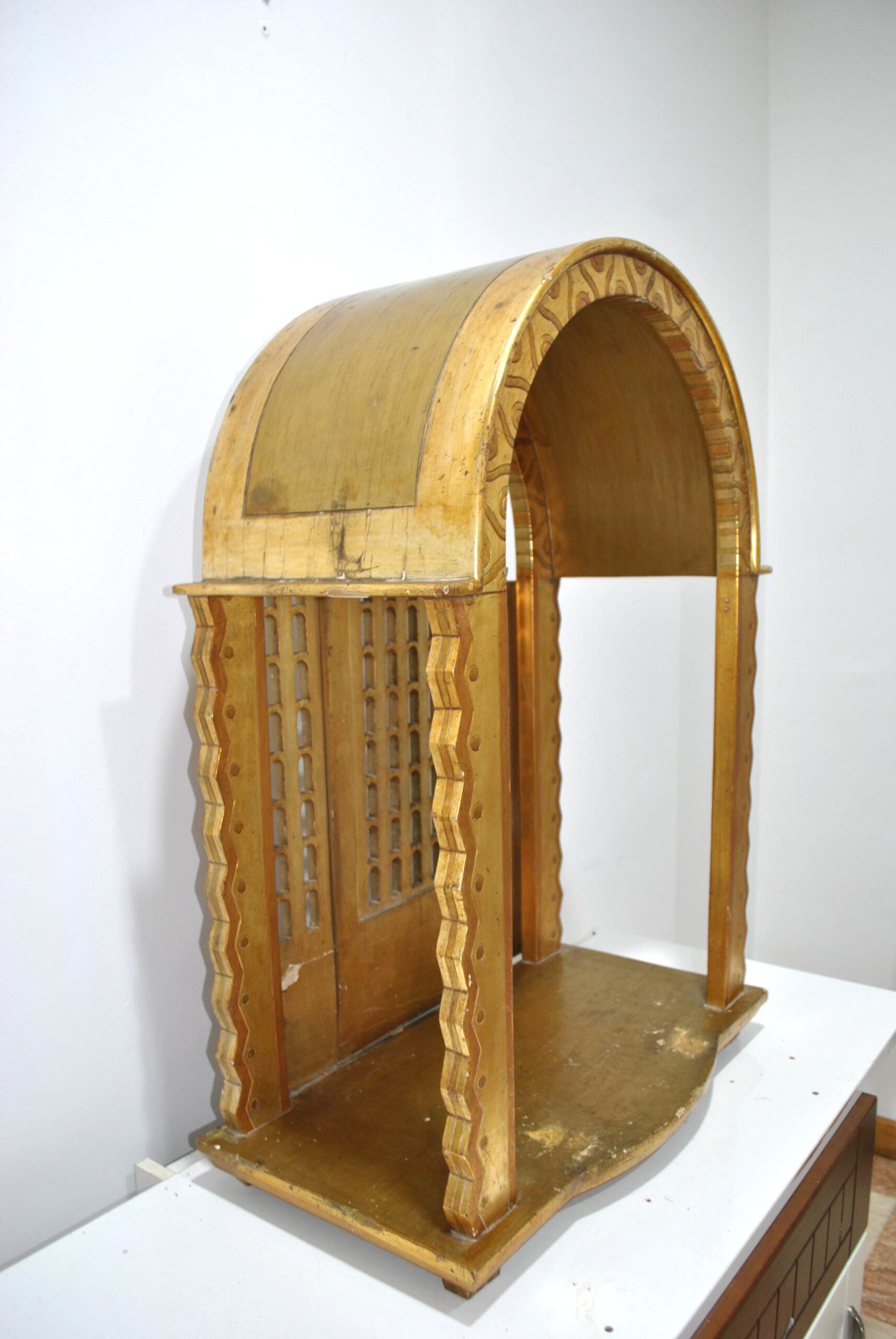 REF: 12287 – Antigua capilla u hornacina de altar realizada en madera tallada y dorada, diseñada para albergar una imagen religiosa. Se trata de una pieza decorativa muy especial, con arquitectura inspirada en templos o retablos, destacando su elegante arco superior, columnas laterales y celosías decorativas que evocan la estética neogótica y eclesiástica.
