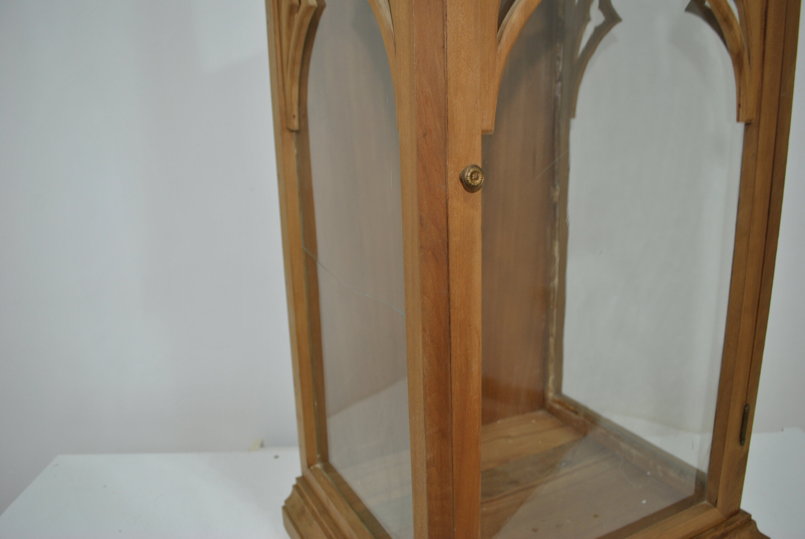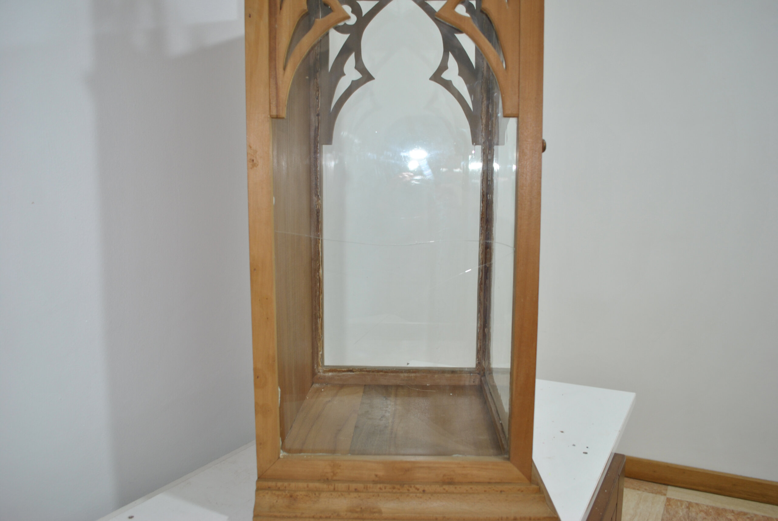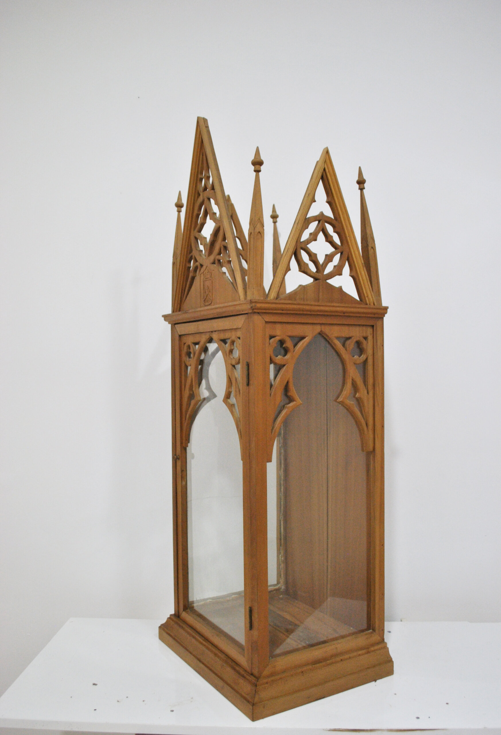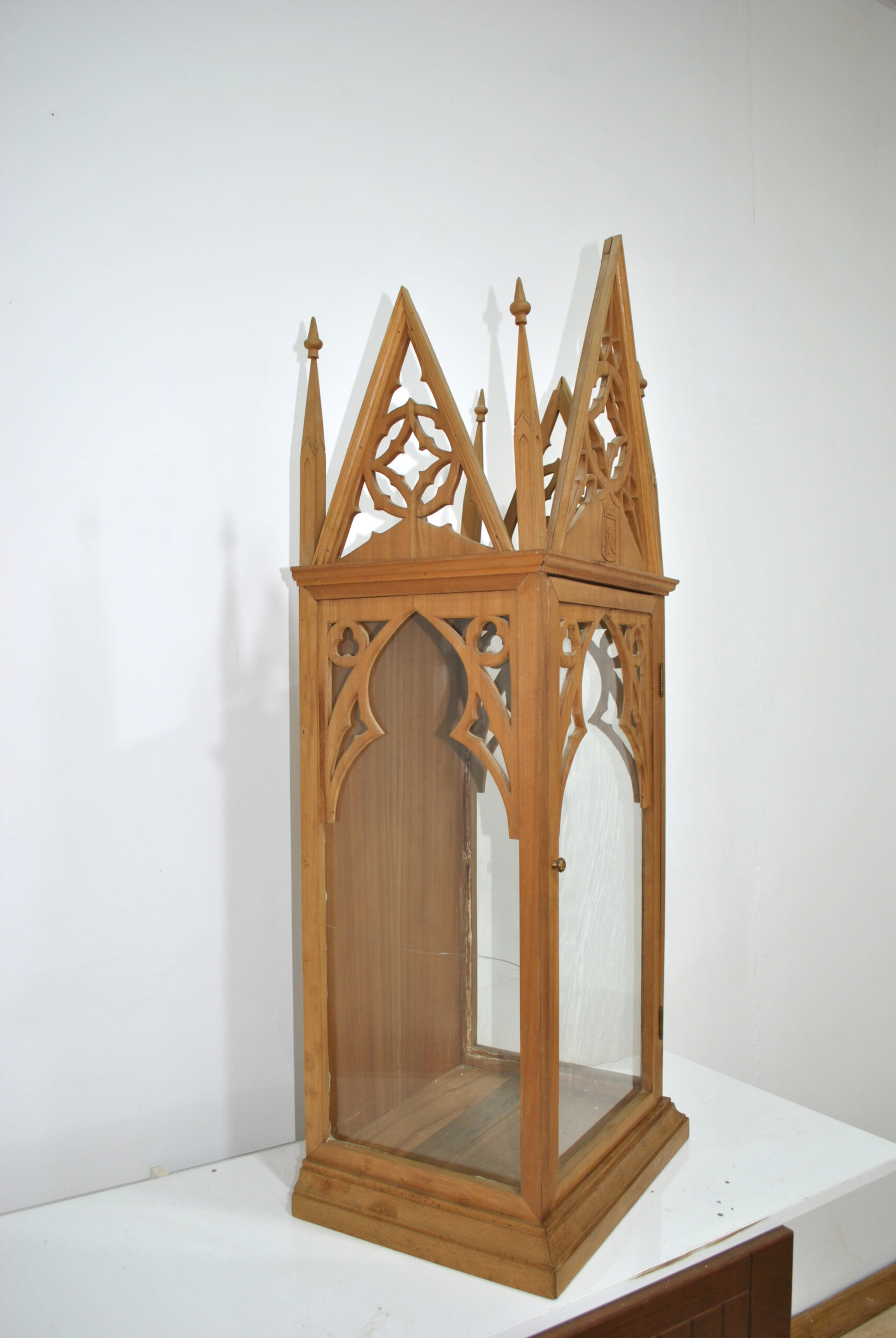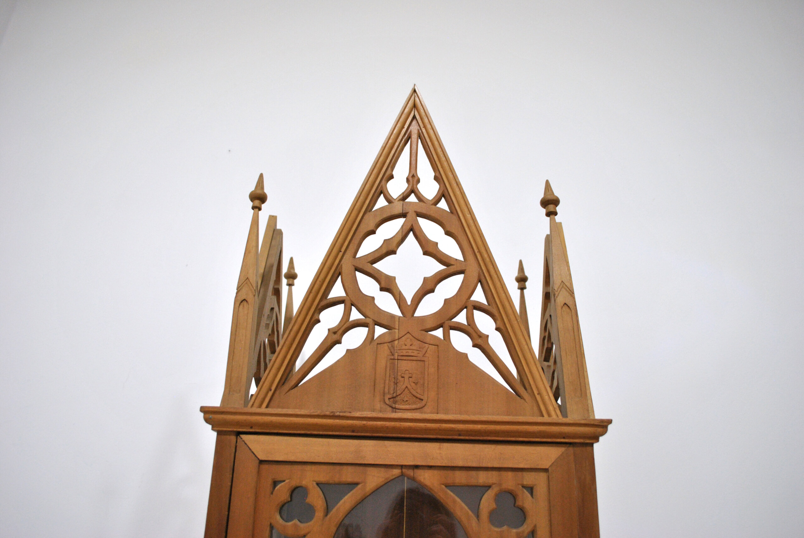REF: 12176 – Magnífica capilla antigua neogótica realizada en madera maciza en tono natural claro, concebida como pequeña capilla doméstica o expositor devocional.