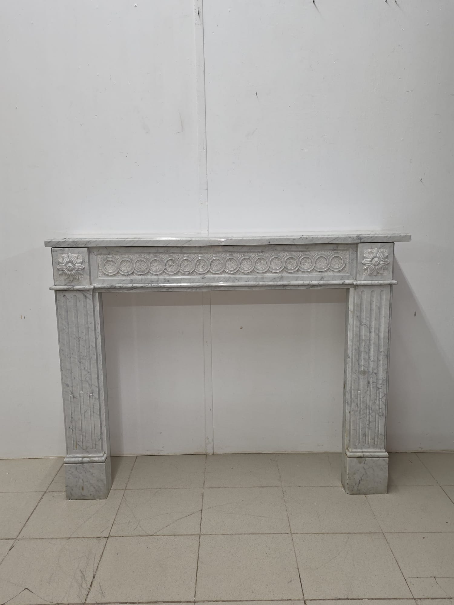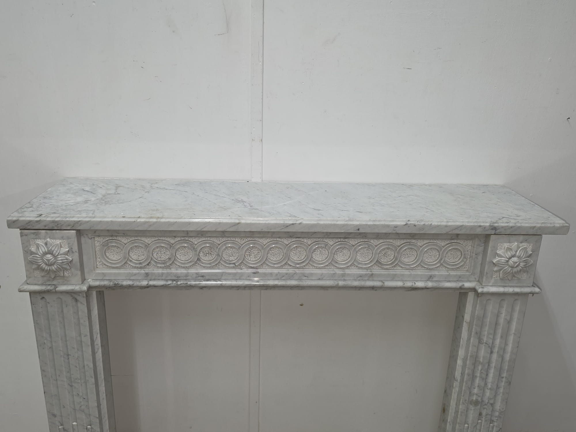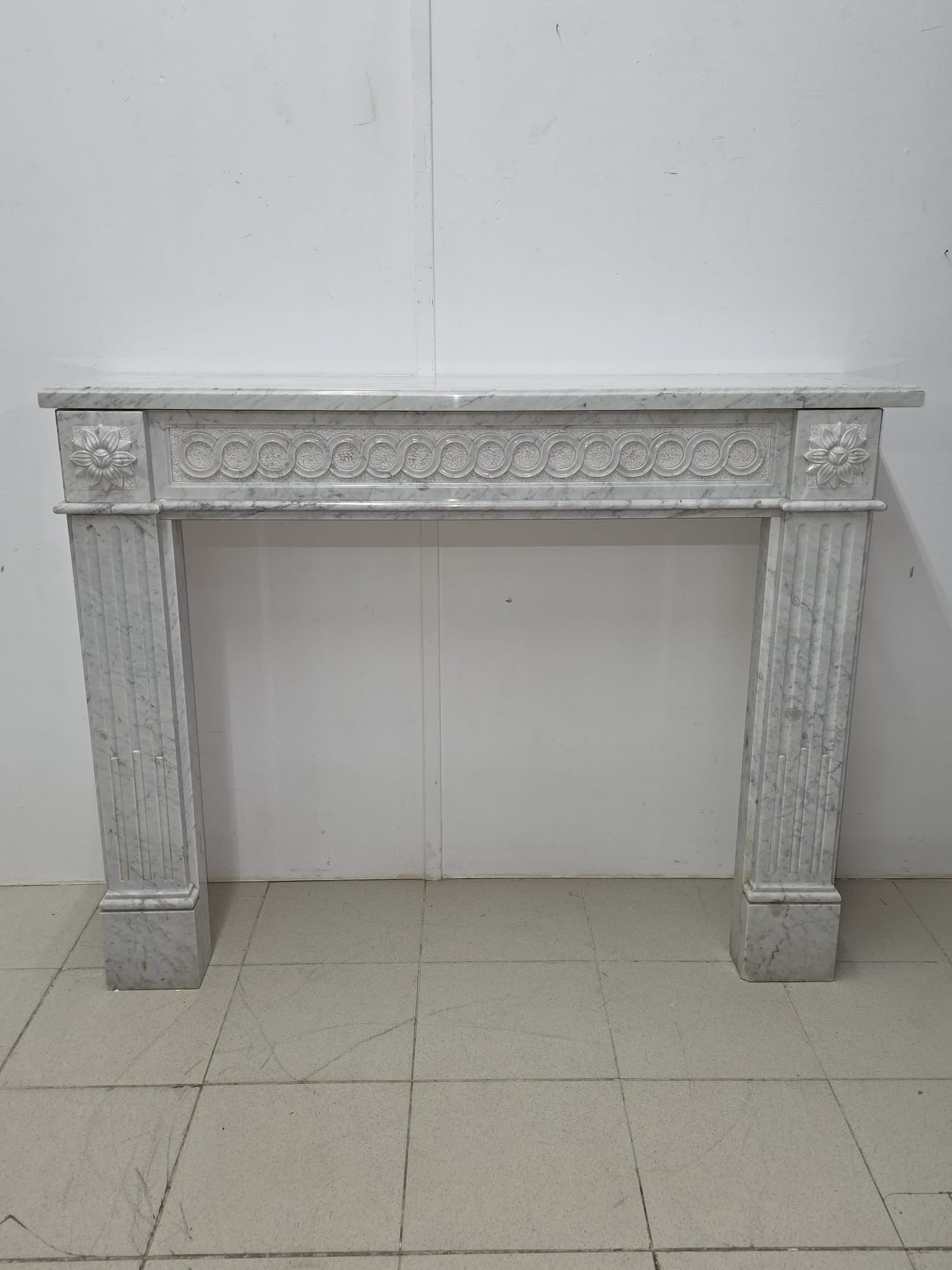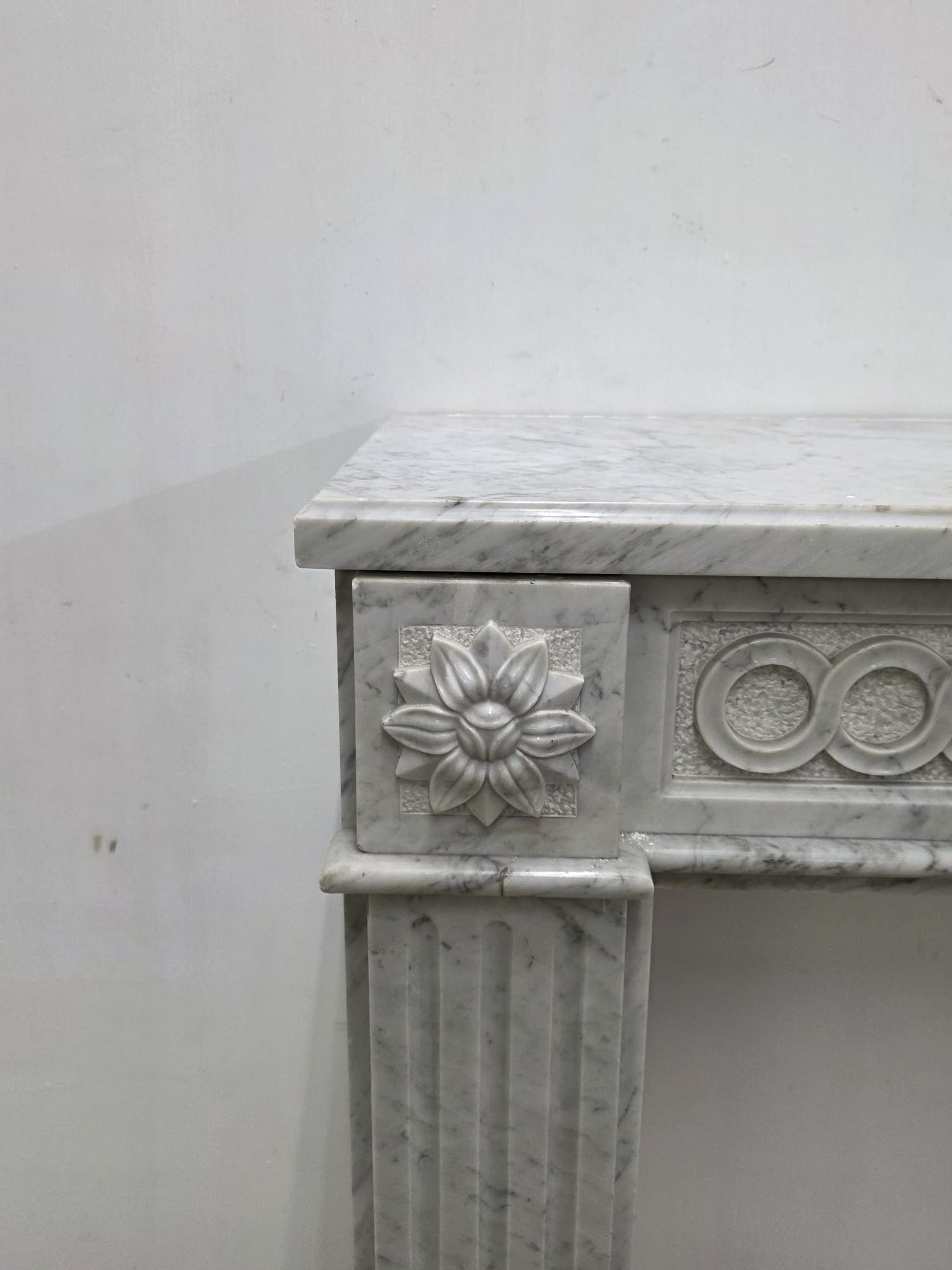 REF: 11957 – Magnífica chimenea de mármol blanco de Carrara, realizada con exquisita maestría artesanal y fiel al refinamiento del estilo Luis XVI. El frente presenta un friso central finamente tallado con una sucesión de medallones circulares entrelazados, enmarcados por molduras de exquisito relieve. A ambos extremos, destacan flores esculpidas en altorrelieve, símbolo de armonía y perfección formal, que aportan un toque decorativo sin romper la sobriedad del conjunto. Las jambas, acanaladas verticalmente, refuerzan la sensación de altura y proporción clásica.