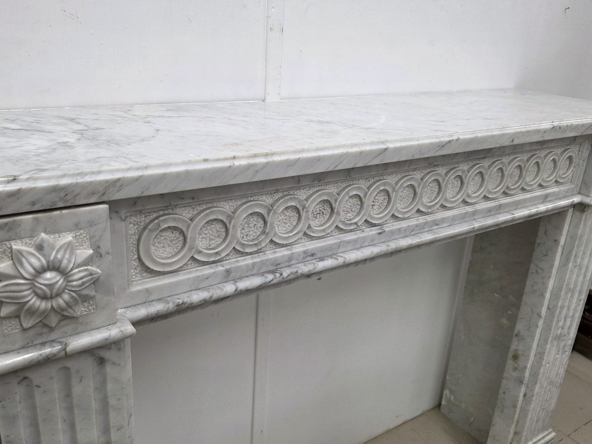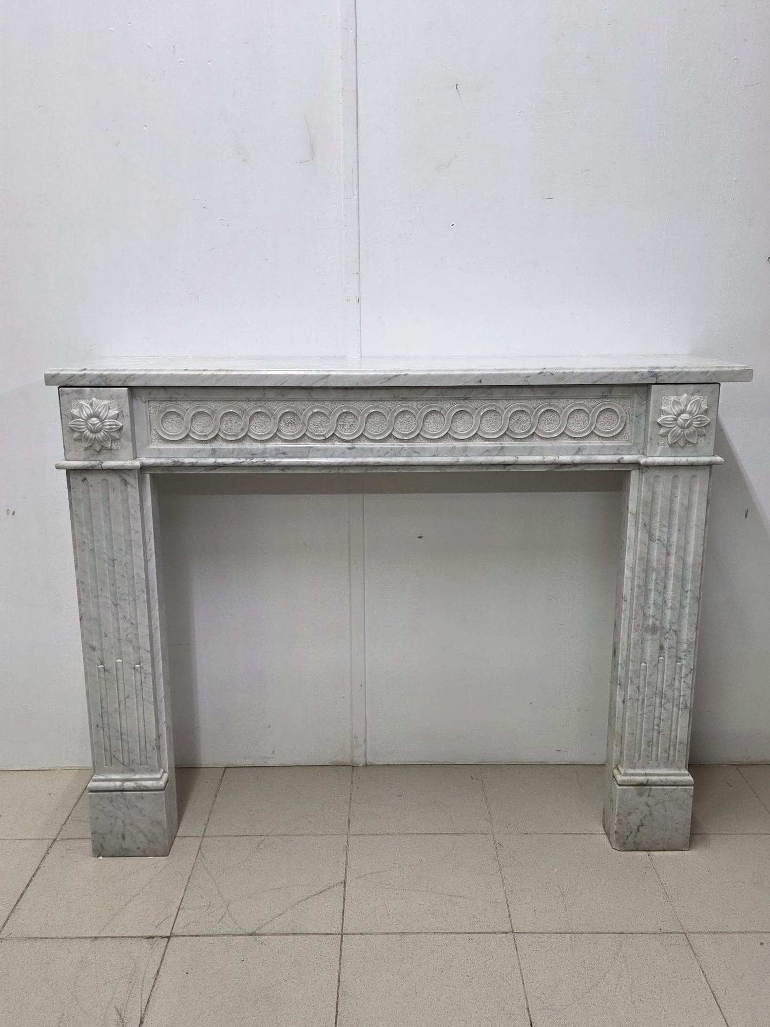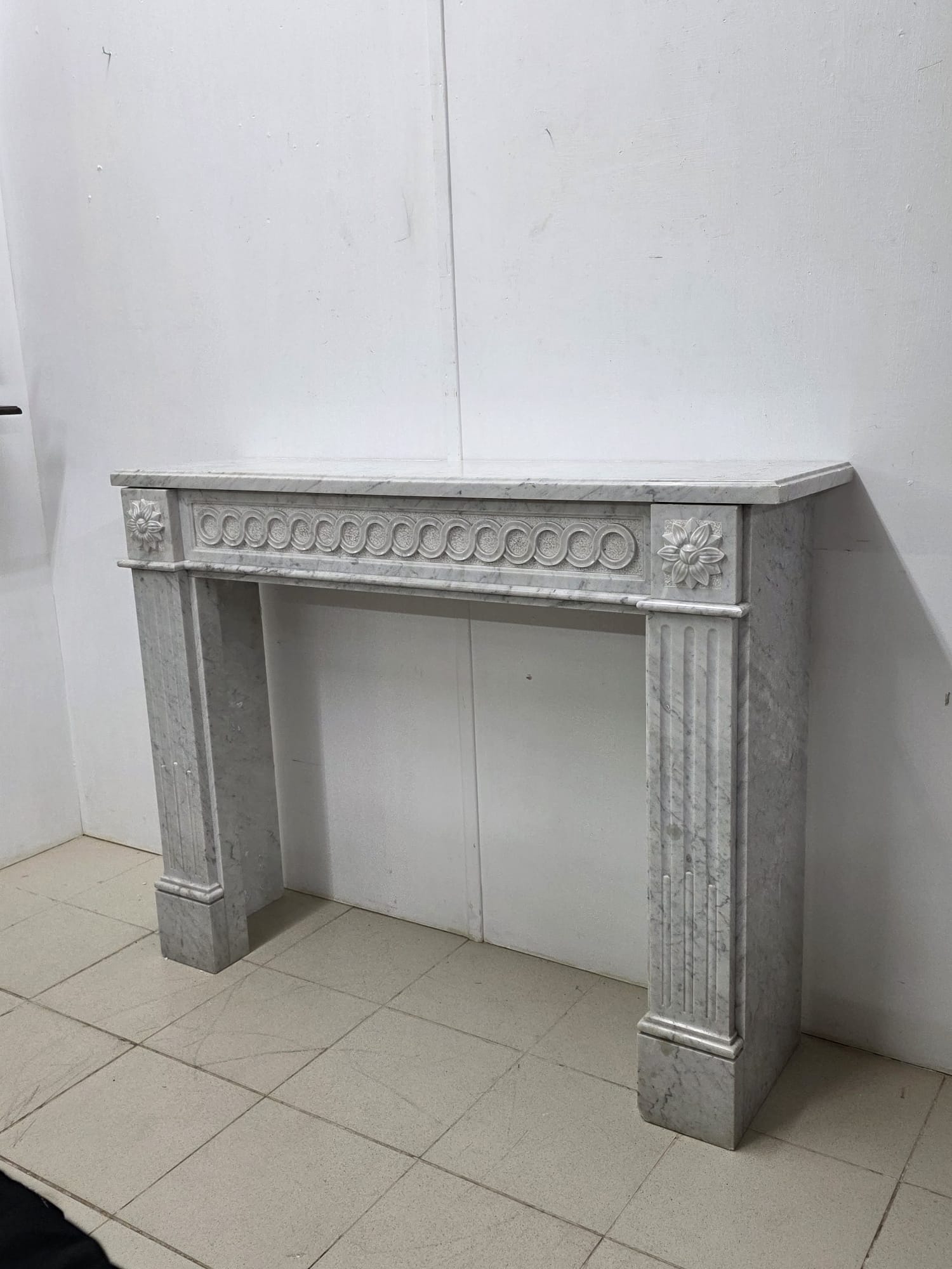 REF: 11957 – Magnífica chimenea de mármol blanco de Carrara, realizada con exquisita maestría artesanal y fiel al refinamiento del estilo Luis XVI. El frente presenta un friso central finamente tallado con una sucesión de medallones circulares entrelazados, enmarcados por molduras de exquisito relieve. A ambos extremos, destacan flores esculpidas en altorrelieve, símbolo de armonía y perfección formal, que aportan un toque decorativo sin romper la sobriedad del conjunto. Las jambas, acanaladas verticalmente, refuerzan la sensación de altura y proporción clásica.