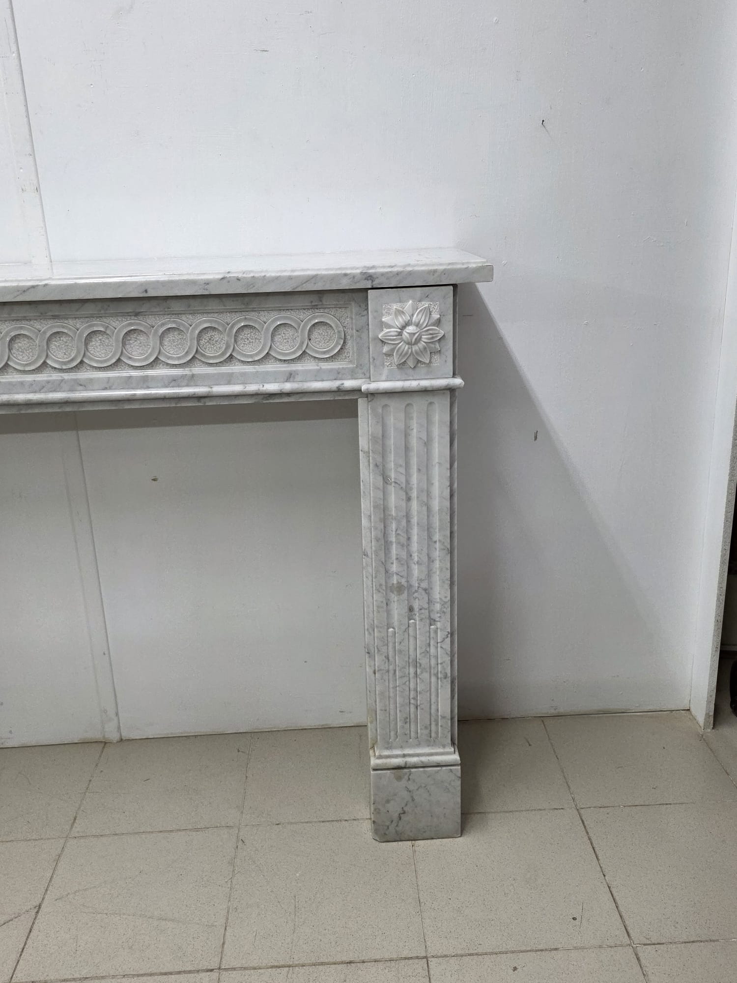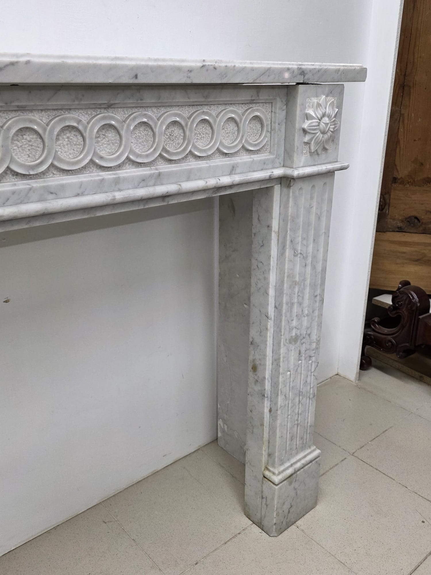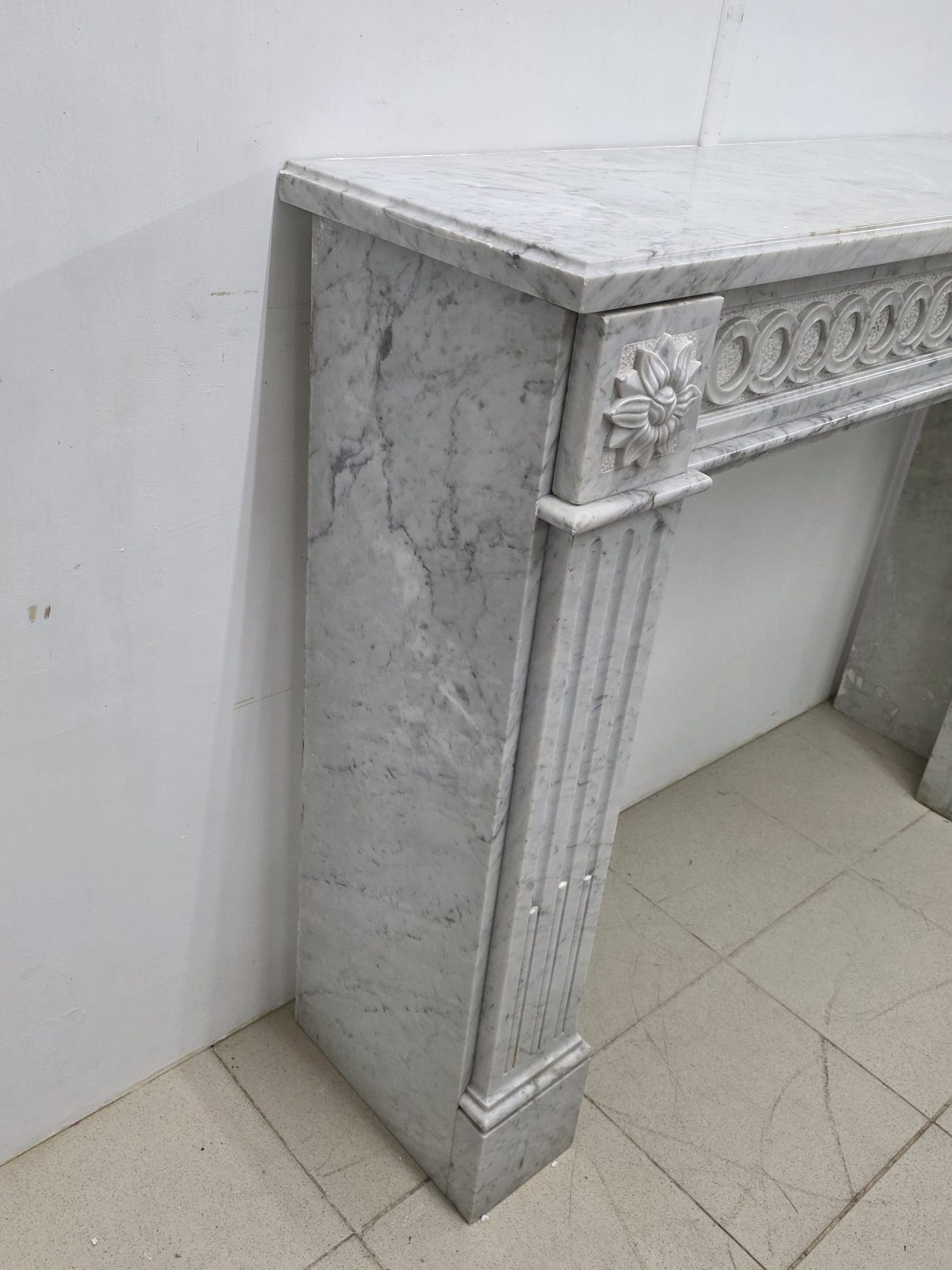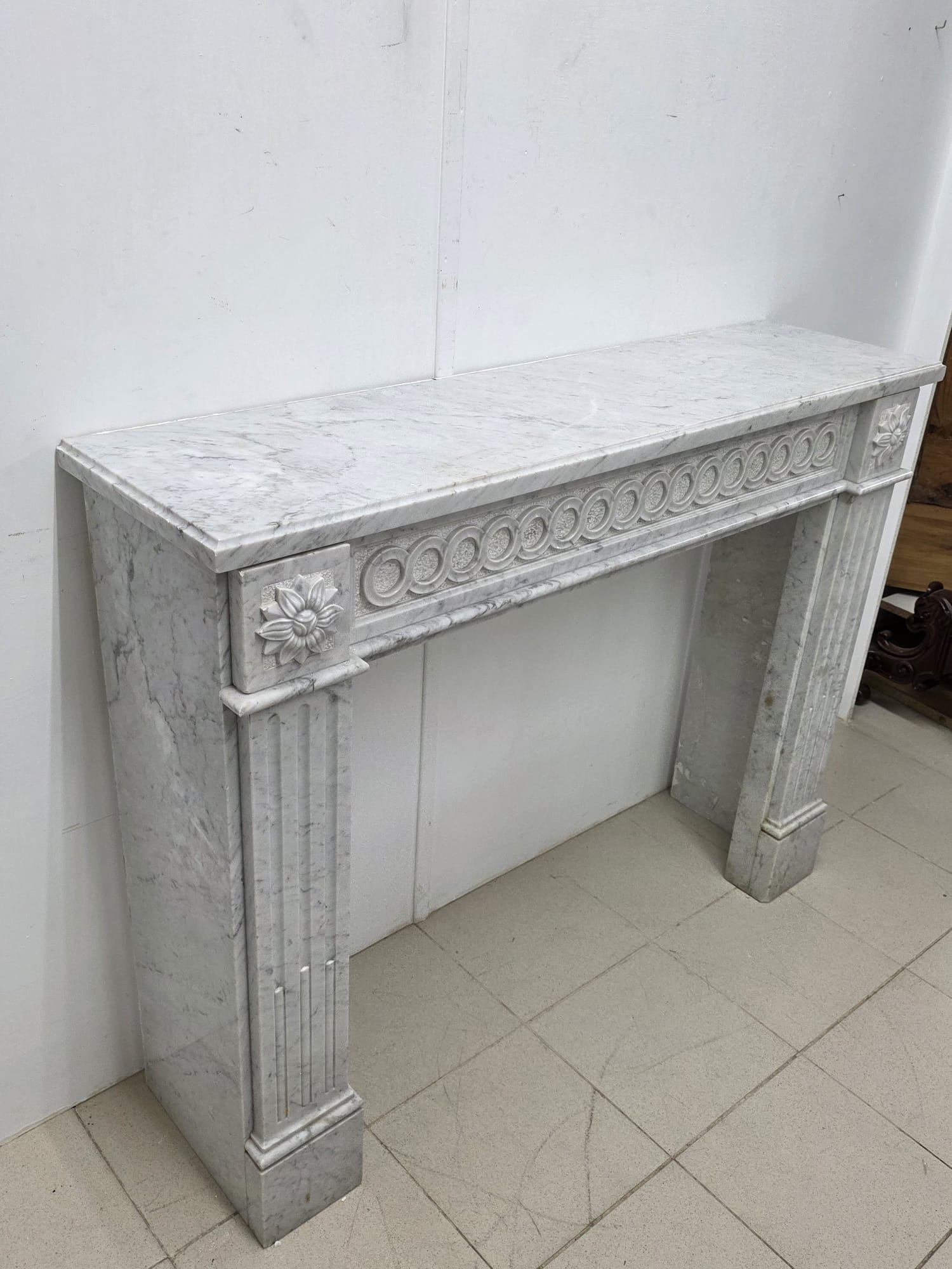 REF: 11957 – Magnífica chimenea de mármol blanco de Carrara, realizada con exquisita maestría artesanal y fiel al refinamiento del estilo Luis XVI. El frente presenta un friso central finamente tallado con una sucesión de medallones circulares entrelazados, enmarcados por molduras de exquisito relieve. A ambos extremos, destacan flores esculpidas en altorrelieve, símbolo de armonía y perfección formal, que aportan un toque decorativo sin romper la sobriedad del conjunto. Las jambas, acanaladas verticalmente, refuerzan la sensación de altura y proporción clásica.