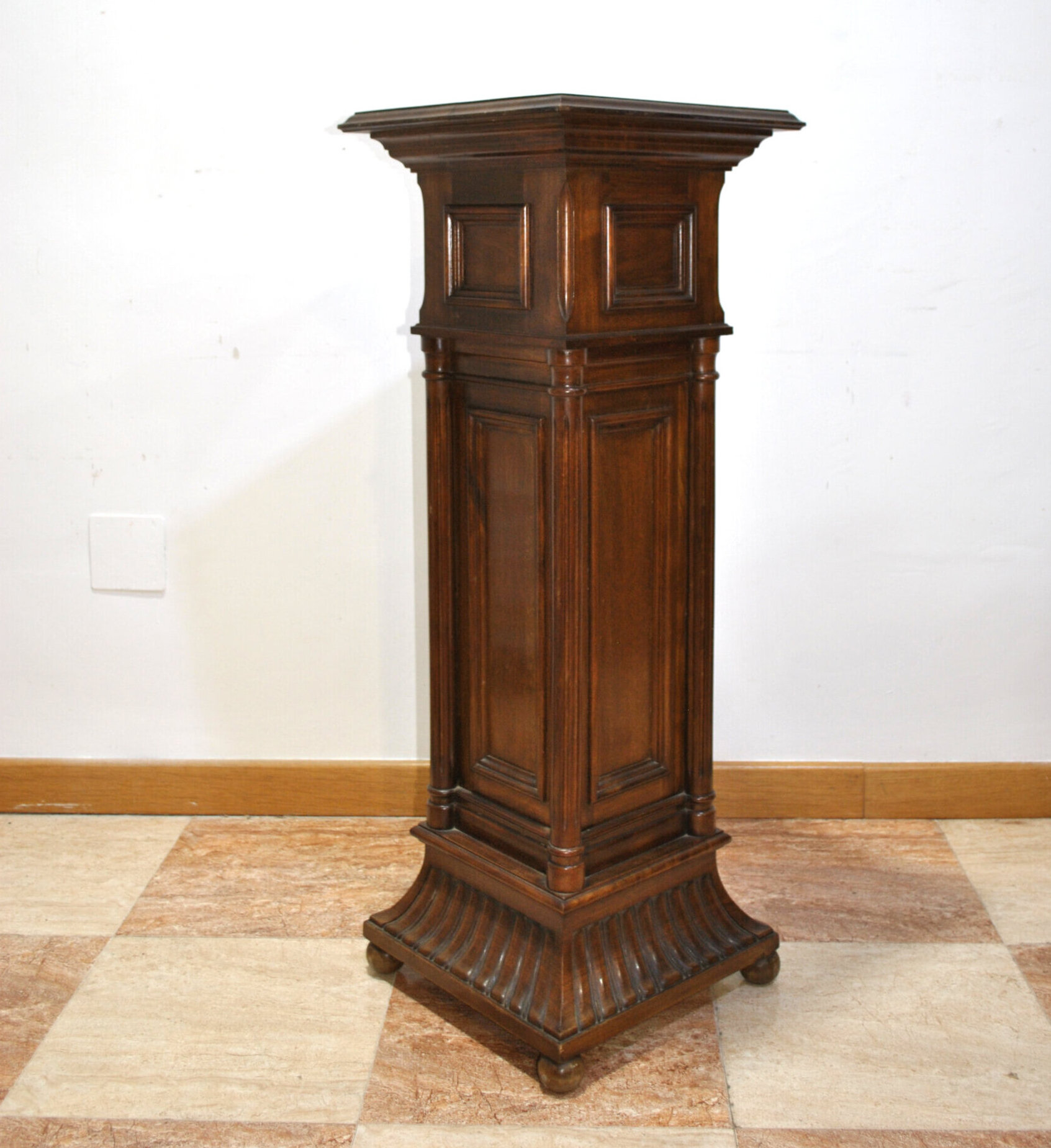 REF: 12112 – Elegante pedestal antiguo de madera maciza de nogal , ideal como peana expositora para realzar piezas decorativas como esculturas, bustos, jarrones, macetas, figuras, relojes o lámparas. Su diseño de estilo clásico, con líneas arquitectónicas y paneles moldurados, aporta un aire distinguido y atemporal a cualquier estancia.