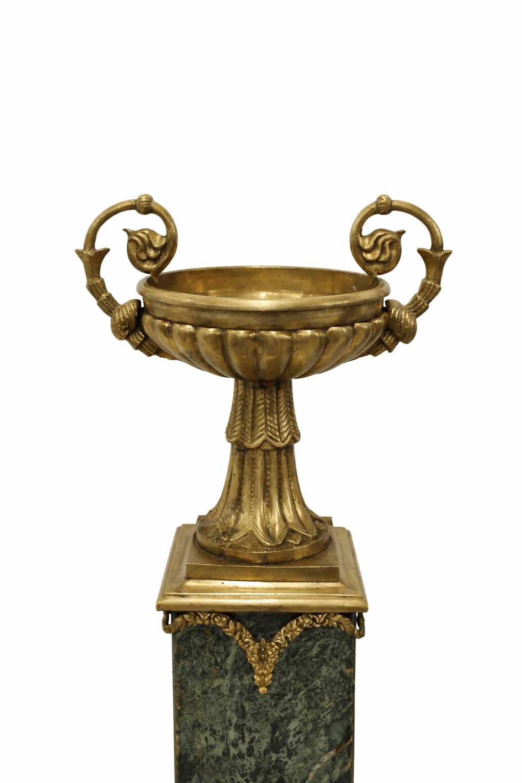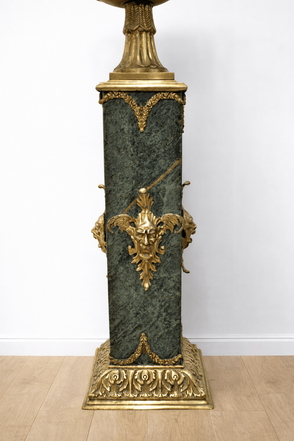De clara inspiración estilo Imperio, destacan por sus formas arquitectónicas y su rica ornamentación, con mascarones decorativos, guirnaldas y detalles clásicos que aportan un aire majestuoso y sofisticado. En la parte superior presentan copas ornamentales en bronce, con asas laterales de diseño clásico, que realzan aún más su carácter decorativo. Se trata de piezas muy vistosas y de gran presencia, ideales para entradas, salones o espacios amplios donde se quiera aportar un toque señorial y exclusivo. Perfectas también como pedestales para esculturas o elementos decorativos.