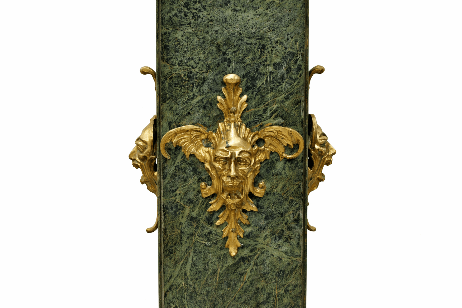 REF: AJ-146 : Espectacular pareja de pedestales antiguos de gran elegancia, realizados en mármol verde veteado y decorados con aplicaciones de bronce dorado finamente trabajadas.