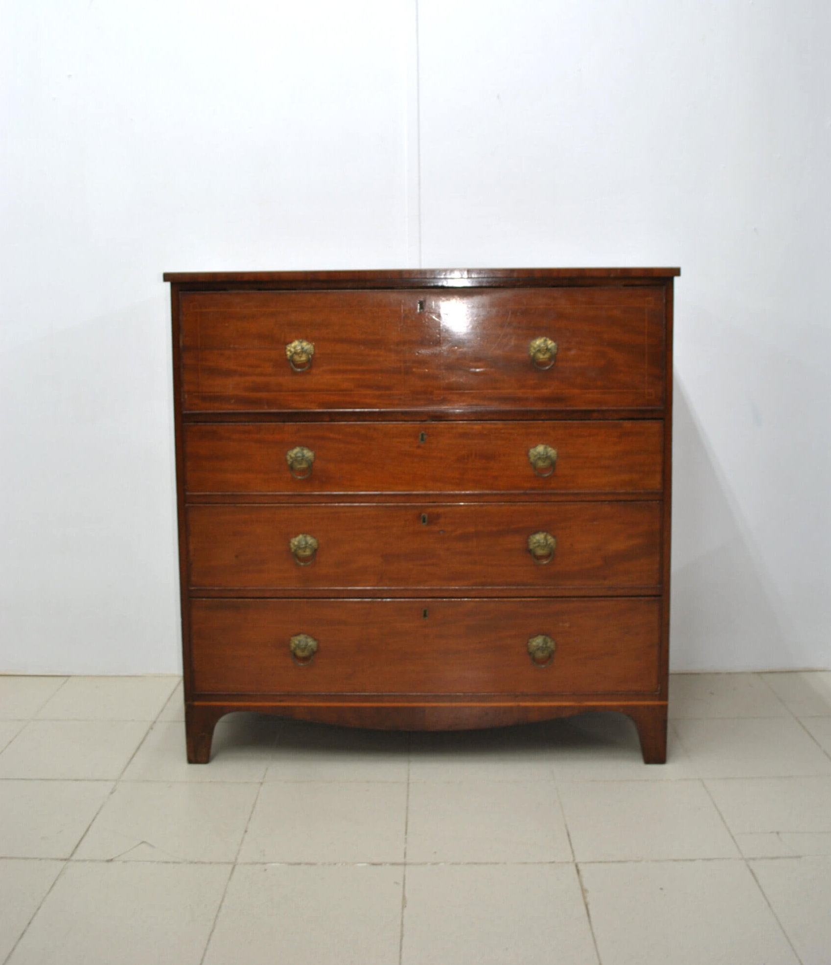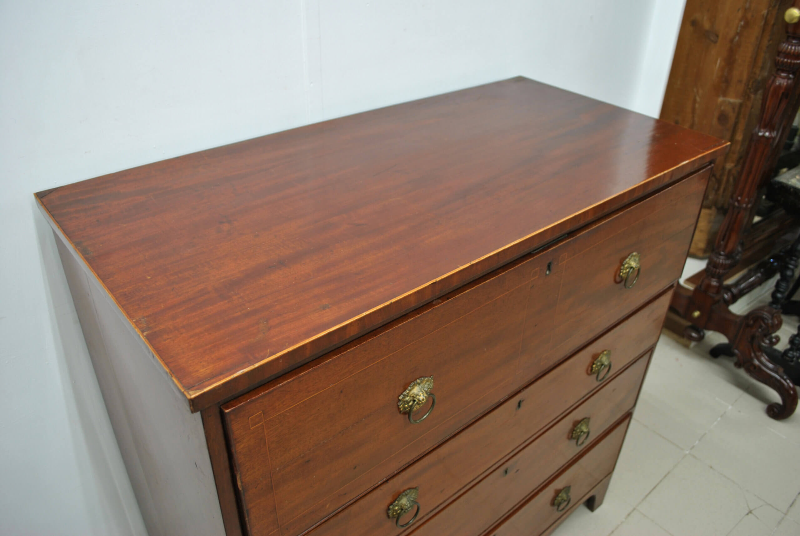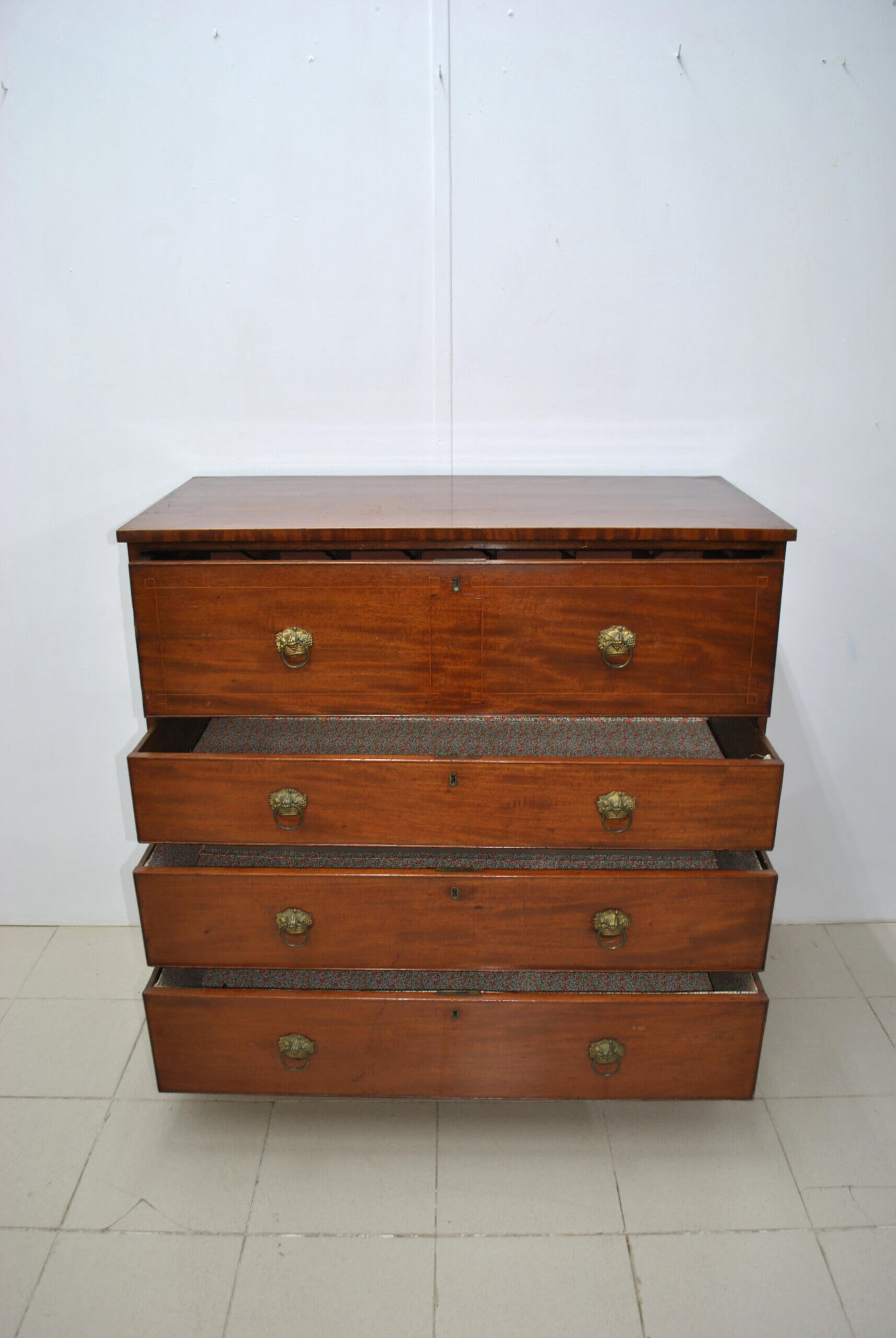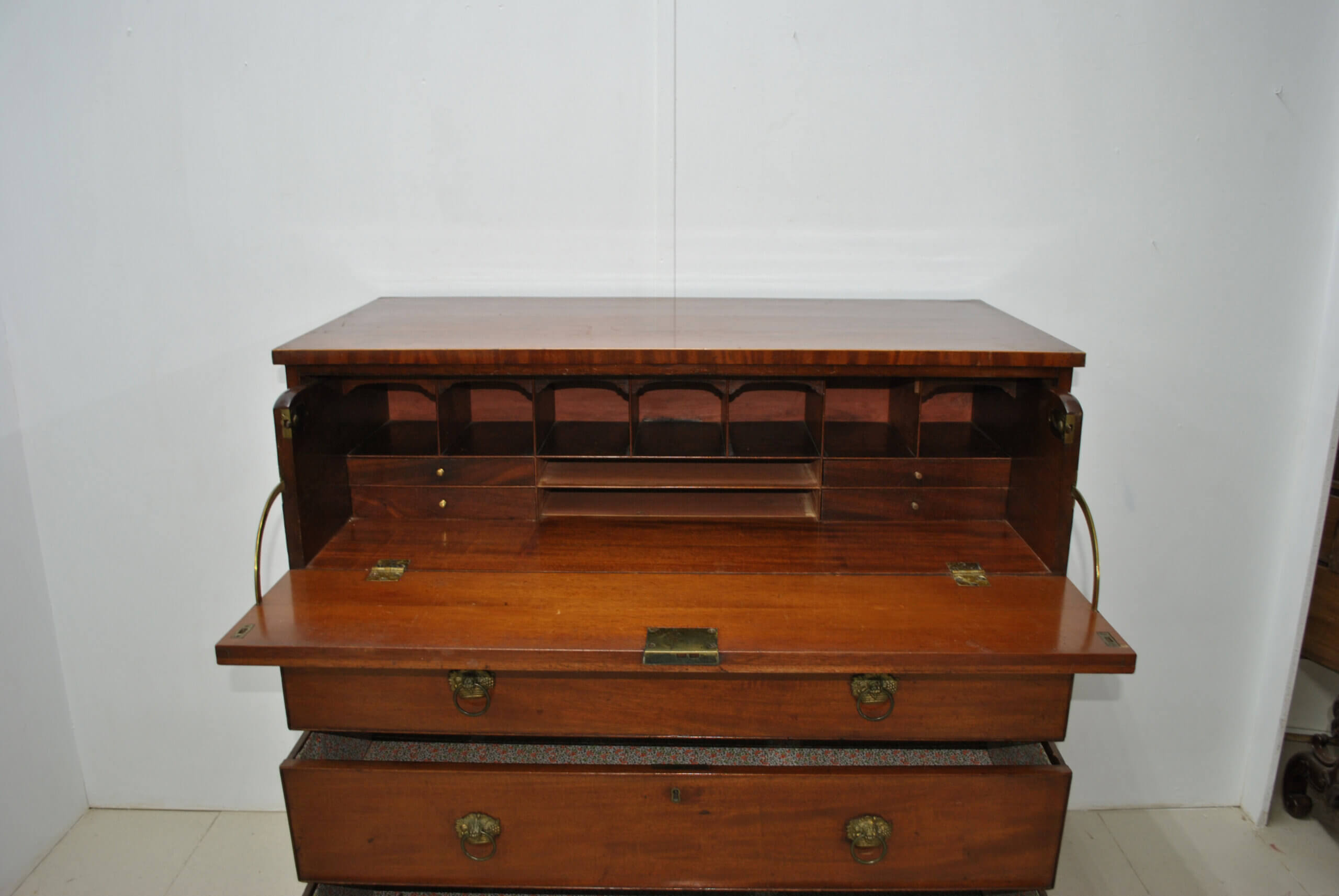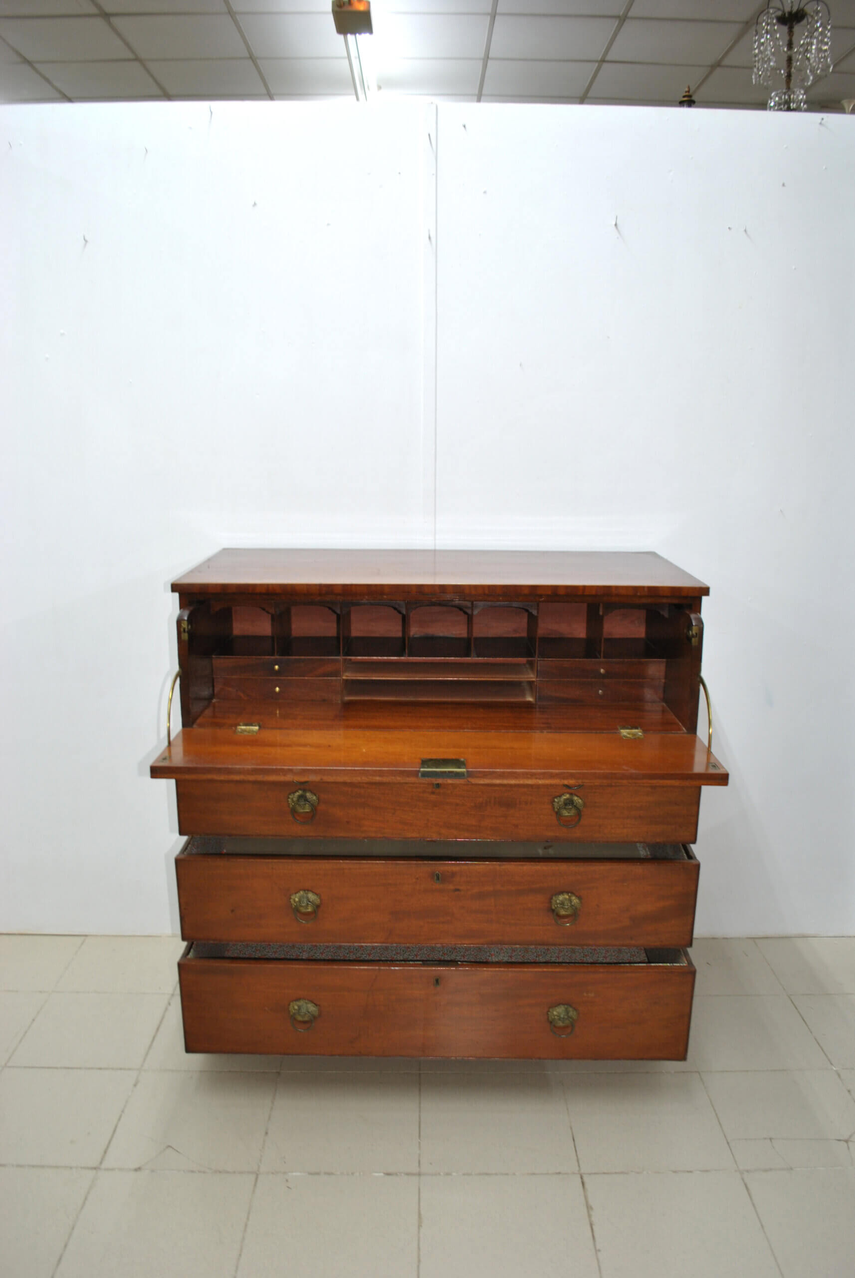 Se trata de una pieza funcional y con mucho encanto, que combina almacenaje y uso como escritorio en un solo mueble. Cuenta con tapa abatible que al abrirse forma una cómoda superficie de trabajo, dejando ver un interior con múltiples compartimentos y pequeños cajones, ideal para organizar documentos, cartas o accesorios. Dispone además de varios cajones amplios en la parte inferior, todos con tiradores metálicos originales, ofreciendo gran capacidad de almacenaje.