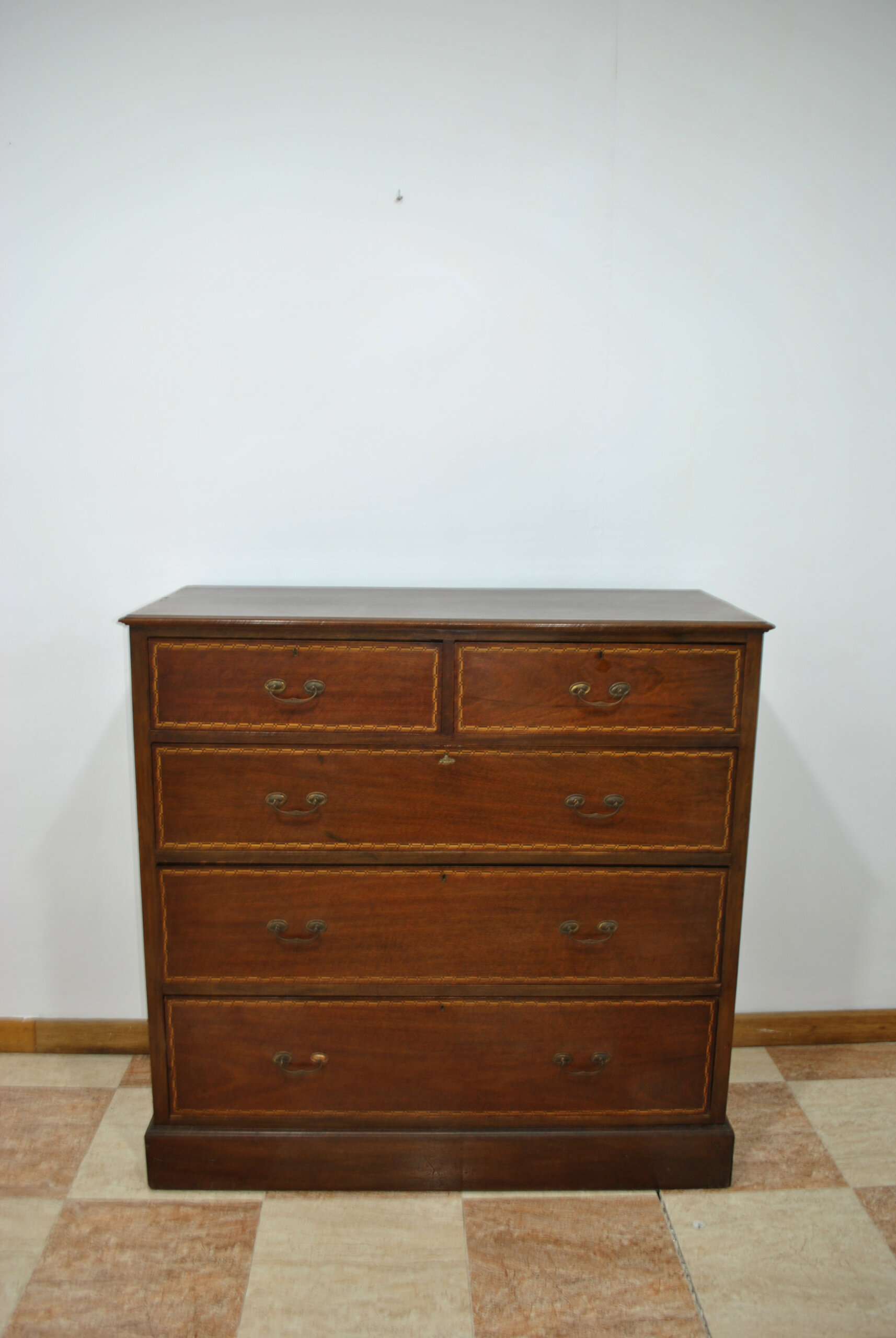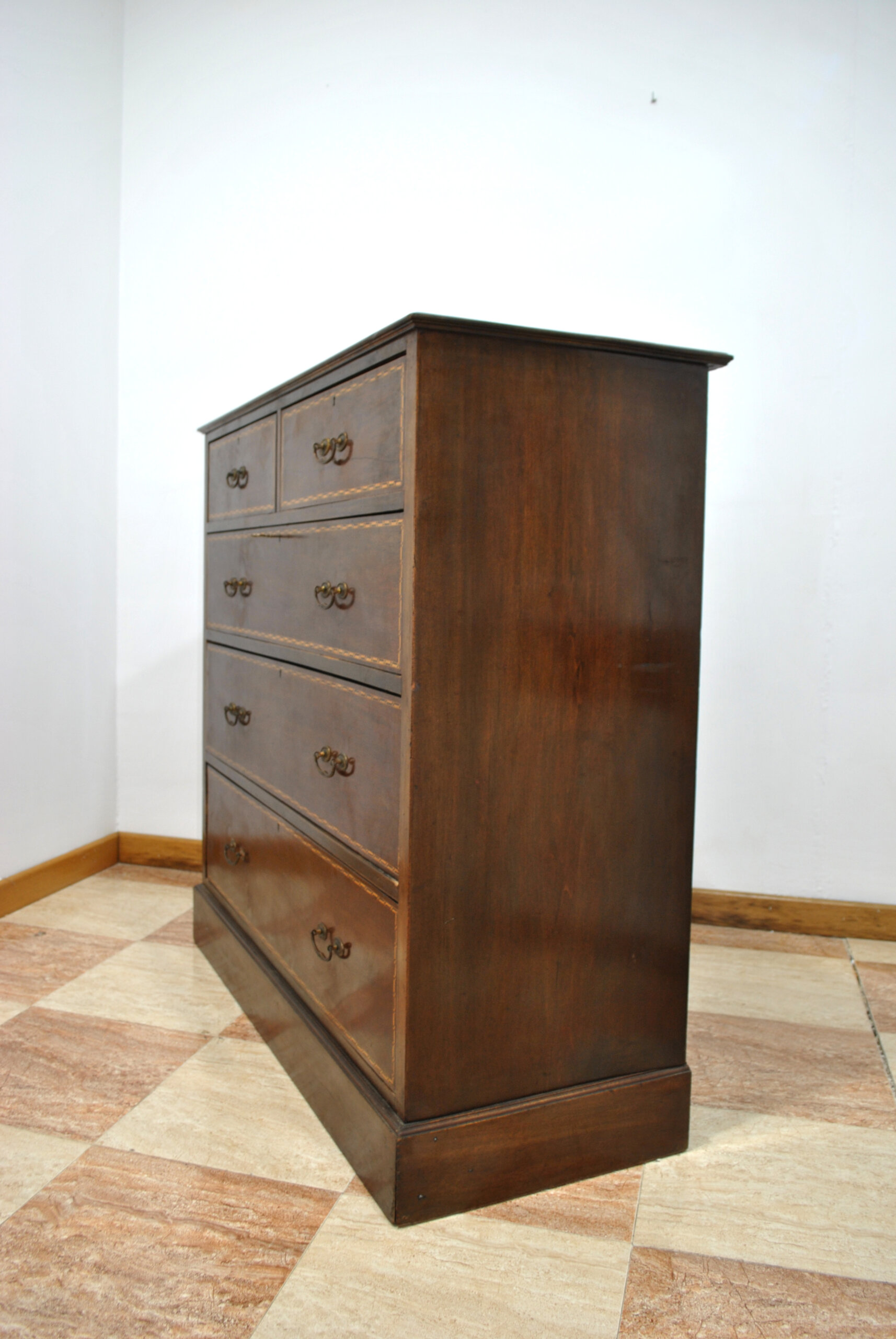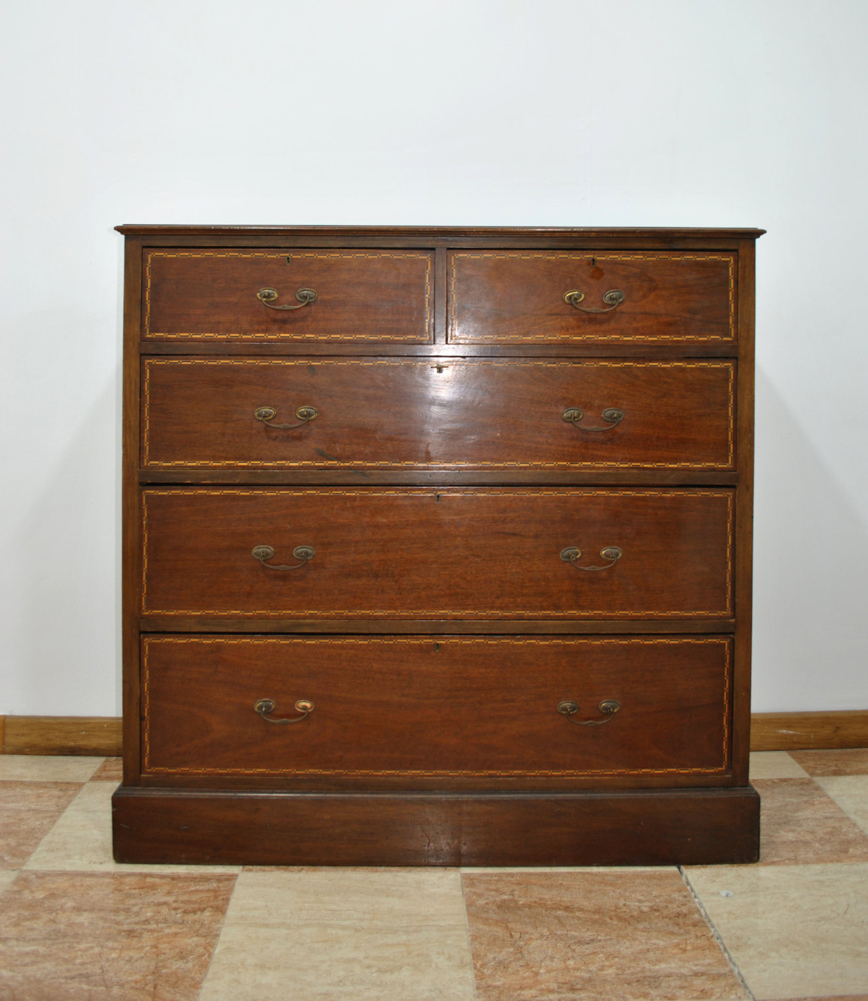 REF: 12189 – Elegante cómoda antigua de inspiración inglesa, realizada en madera de caoba con delicadas incrustaciones de marquetería que enmarcan cada uno de sus cajones. La pieza presenta un diseño sobrio y equilibrado, característico del mobiliario clásico británico, con líneas rectas y proporciones armoniosas.