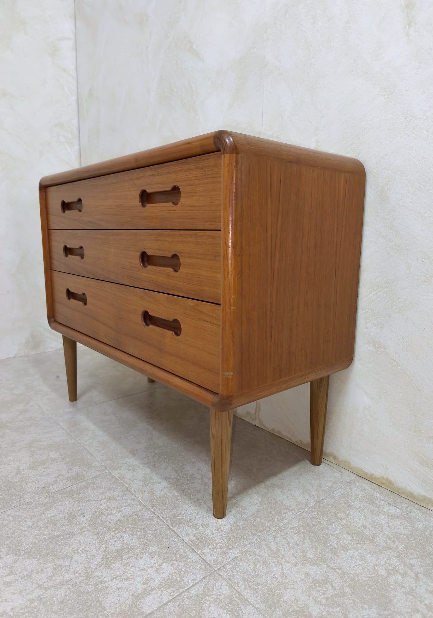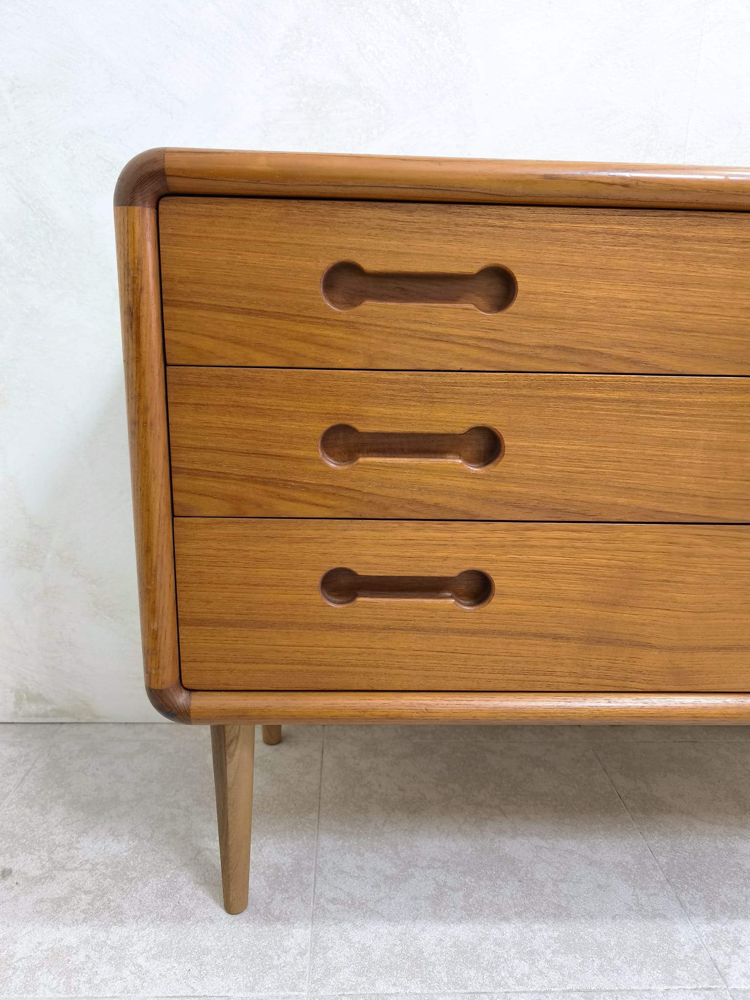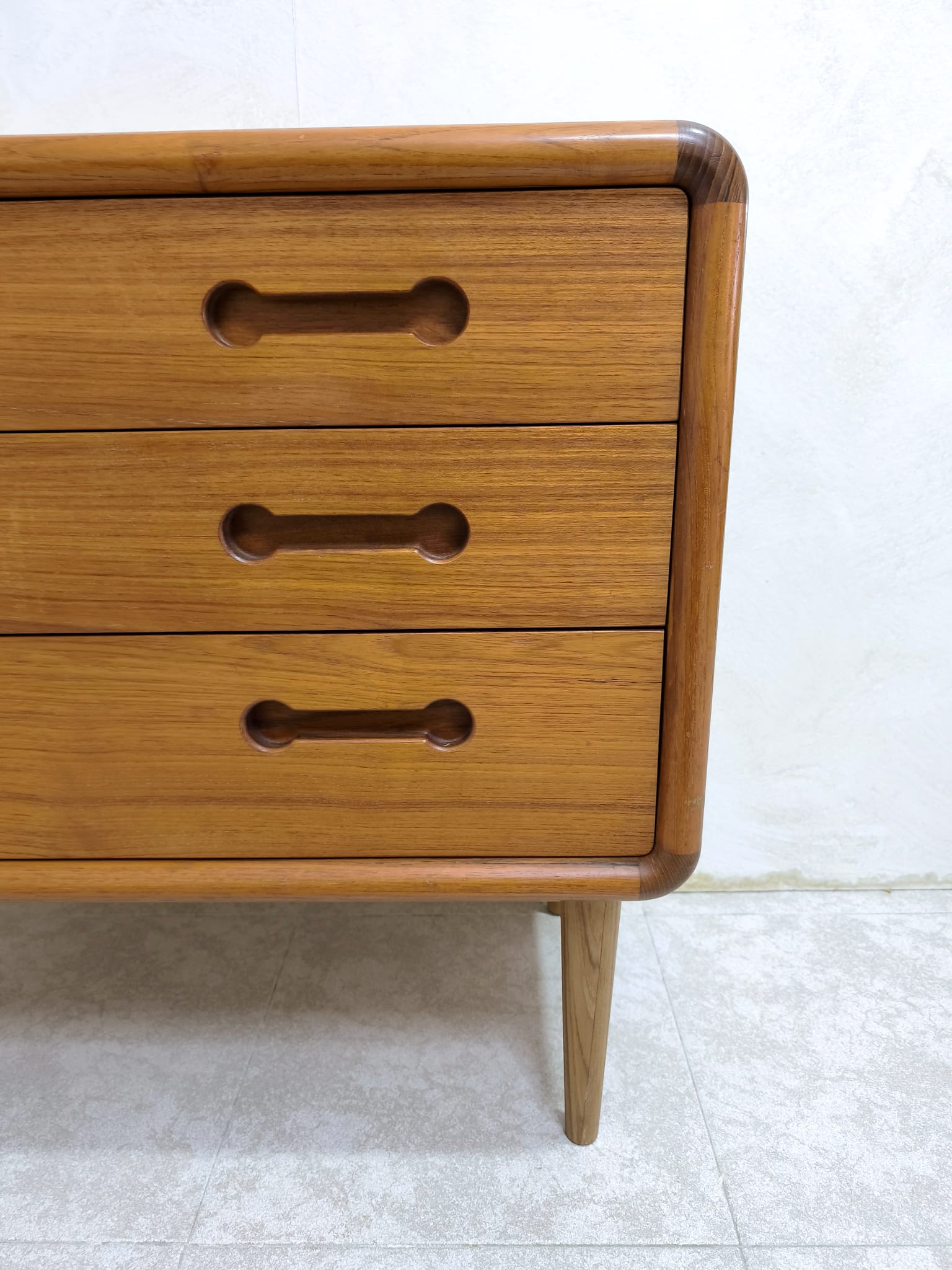 Cómoda vintage de origen Danés realizada en teka en los años 60, dicha cómoda presenta 3 amplios cajones. La esencia del minimalismo y la sencillez escandinava, las impecables habilidades de los artesanos son visibles en todo el mueble, empezando por el uso de madera de teca que habla por sí misma. Este tipo de madera es conocida por su excepcional durabilidad, su resistencia a los daños y su color y veteado cálidos y distintivos. Las partes más vulnerables, como los tiradores, se han tallado en madera maciza.