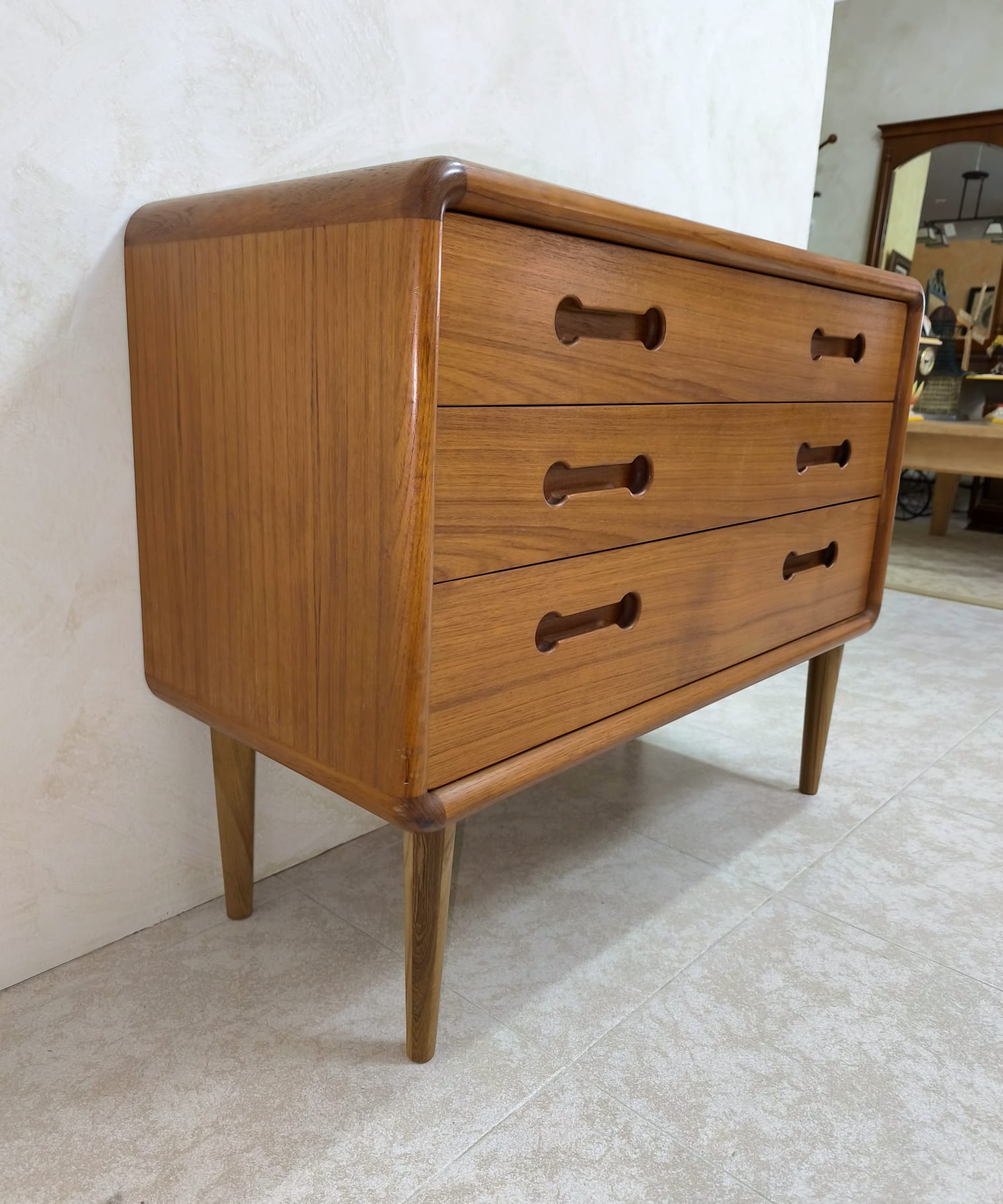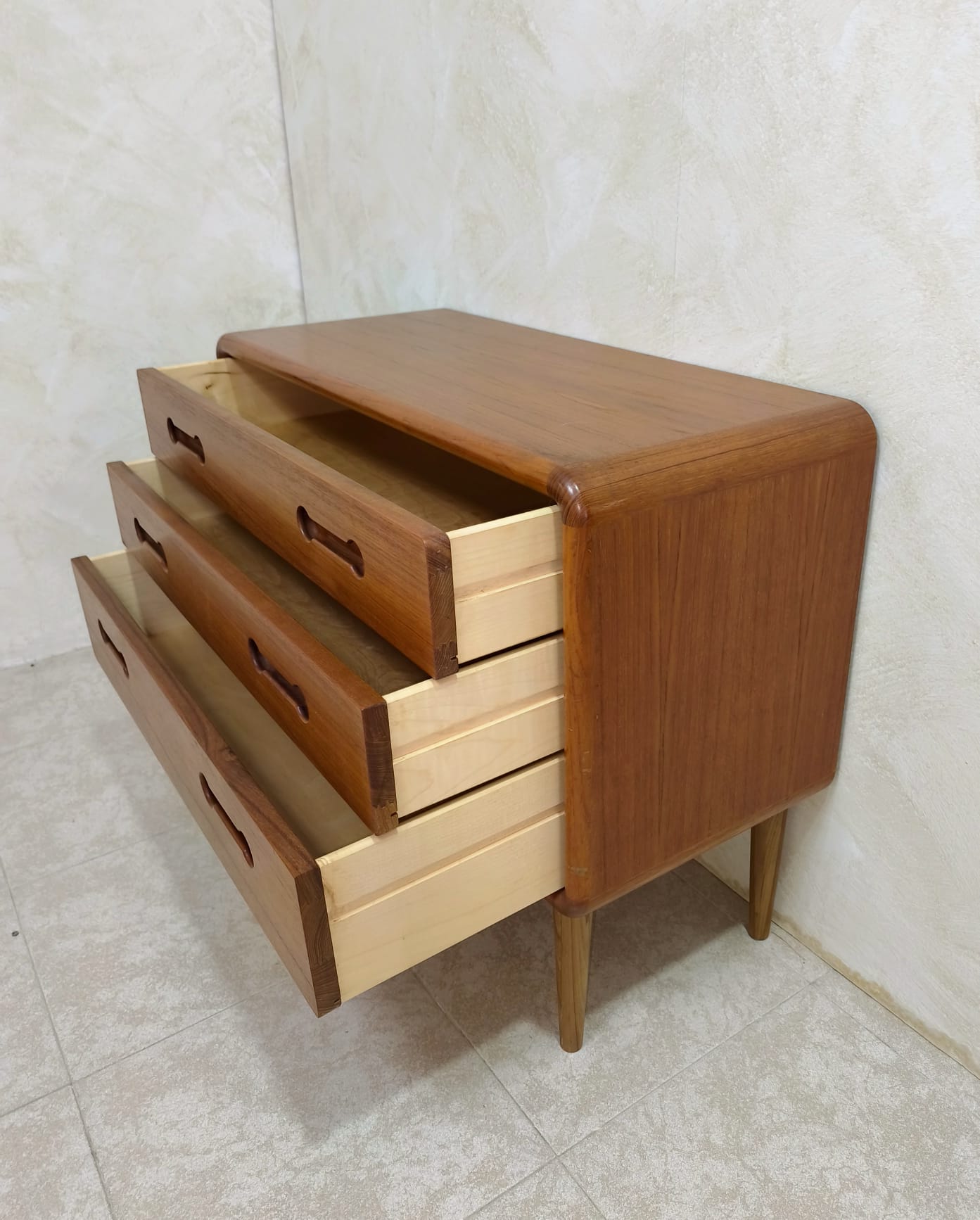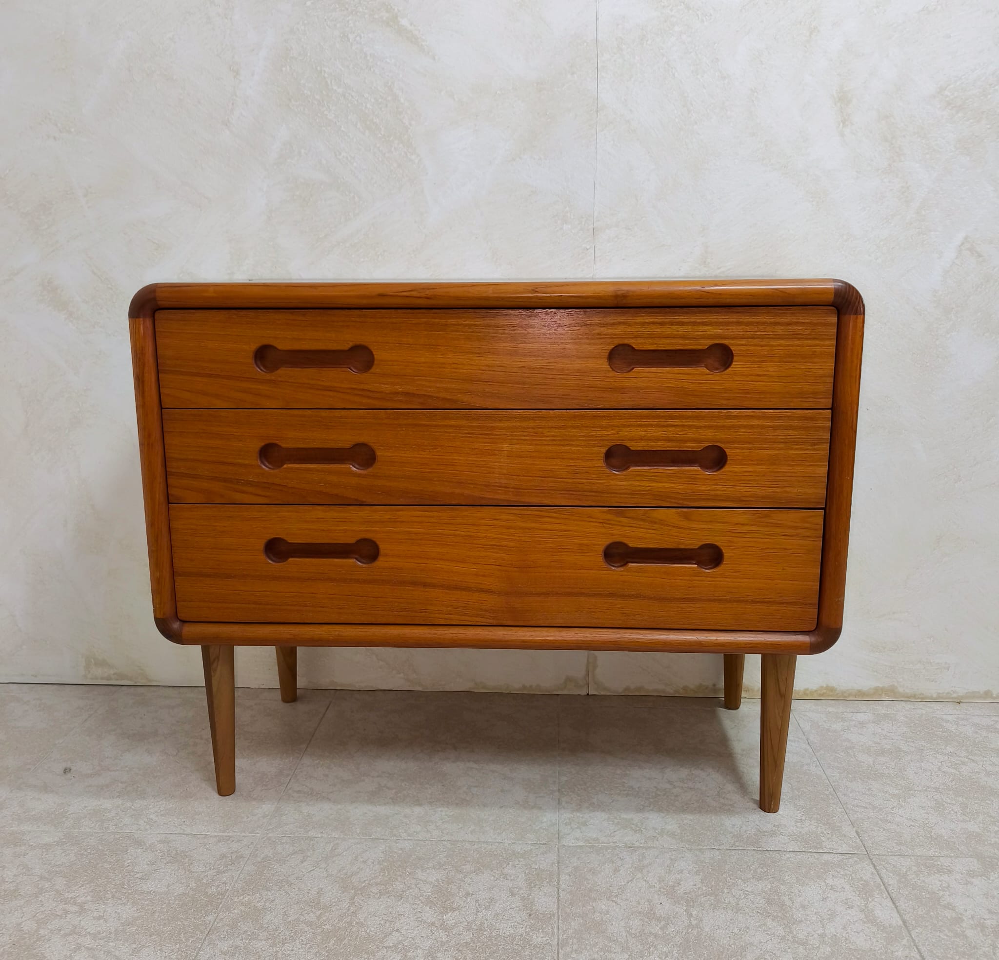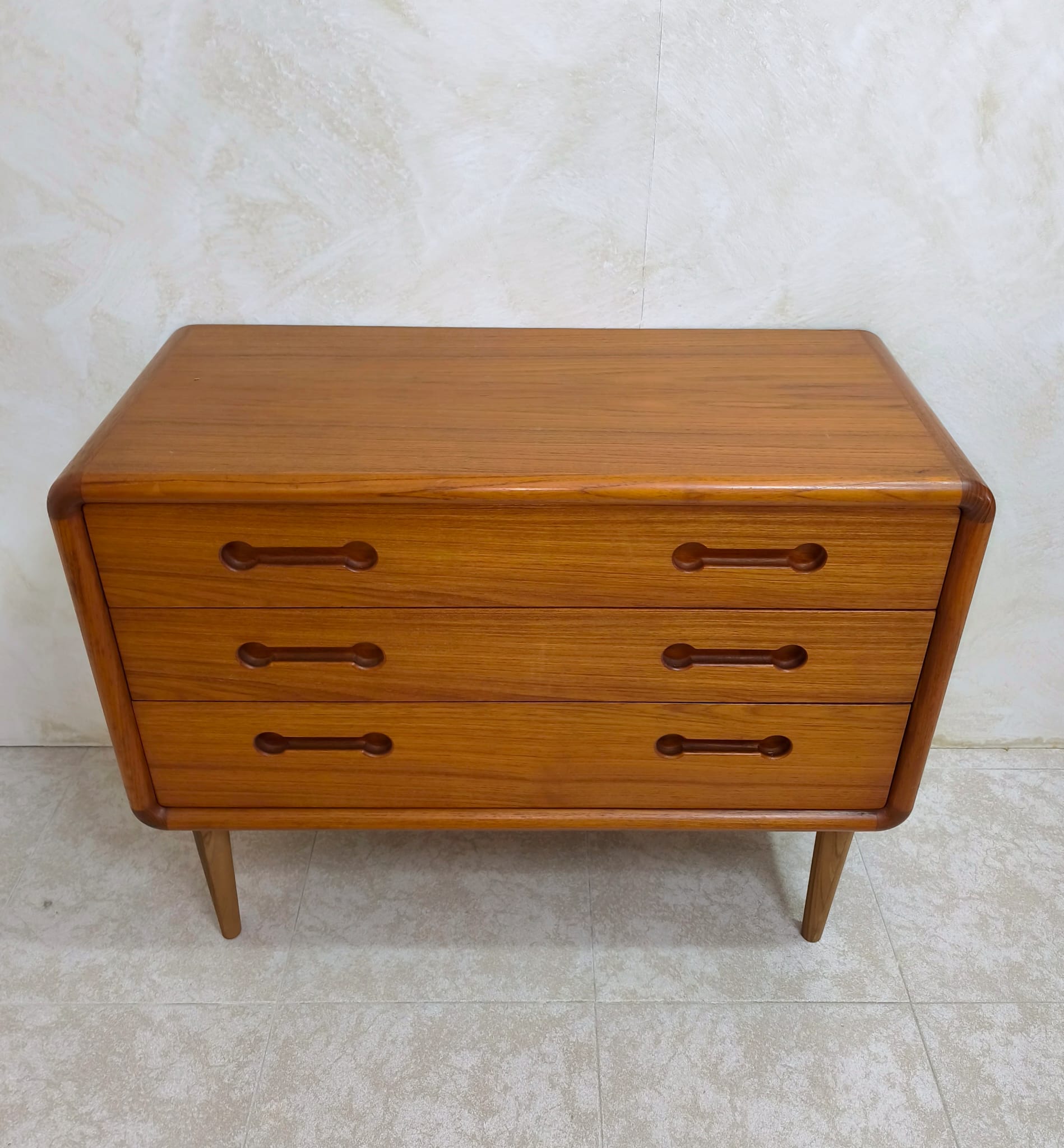 Cómoda vintage de origen Danés realizada en teka en los años 60, dicha cómoda presenta 3 amplios cajones. La esencia del minimalismo y la sencillez escandinava, las impecables habilidades de los artesanos son visibles en todo el mueble, empezando por el uso de madera de teca que habla por sí misma. Este tipo de madera es conocida por su excepcional durabilidad, su resistencia a los daños y su color y veteado cálidos y distintivos. Las partes más vulnerables, como los tiradores, se han tallado en madera maciza.