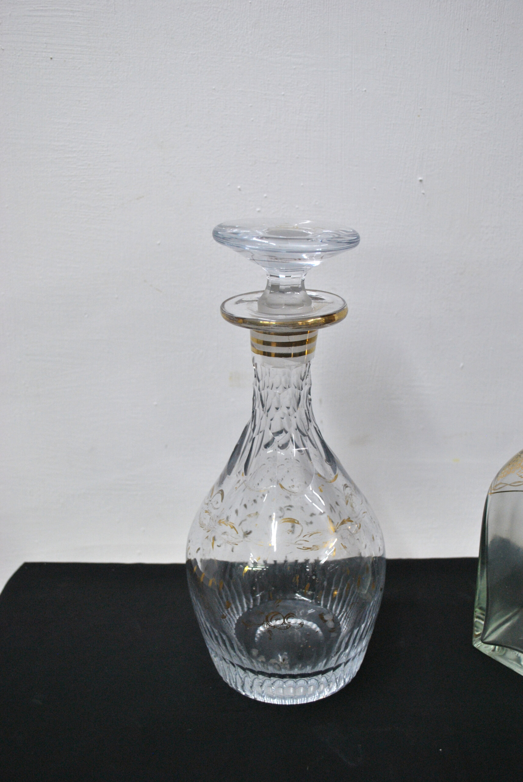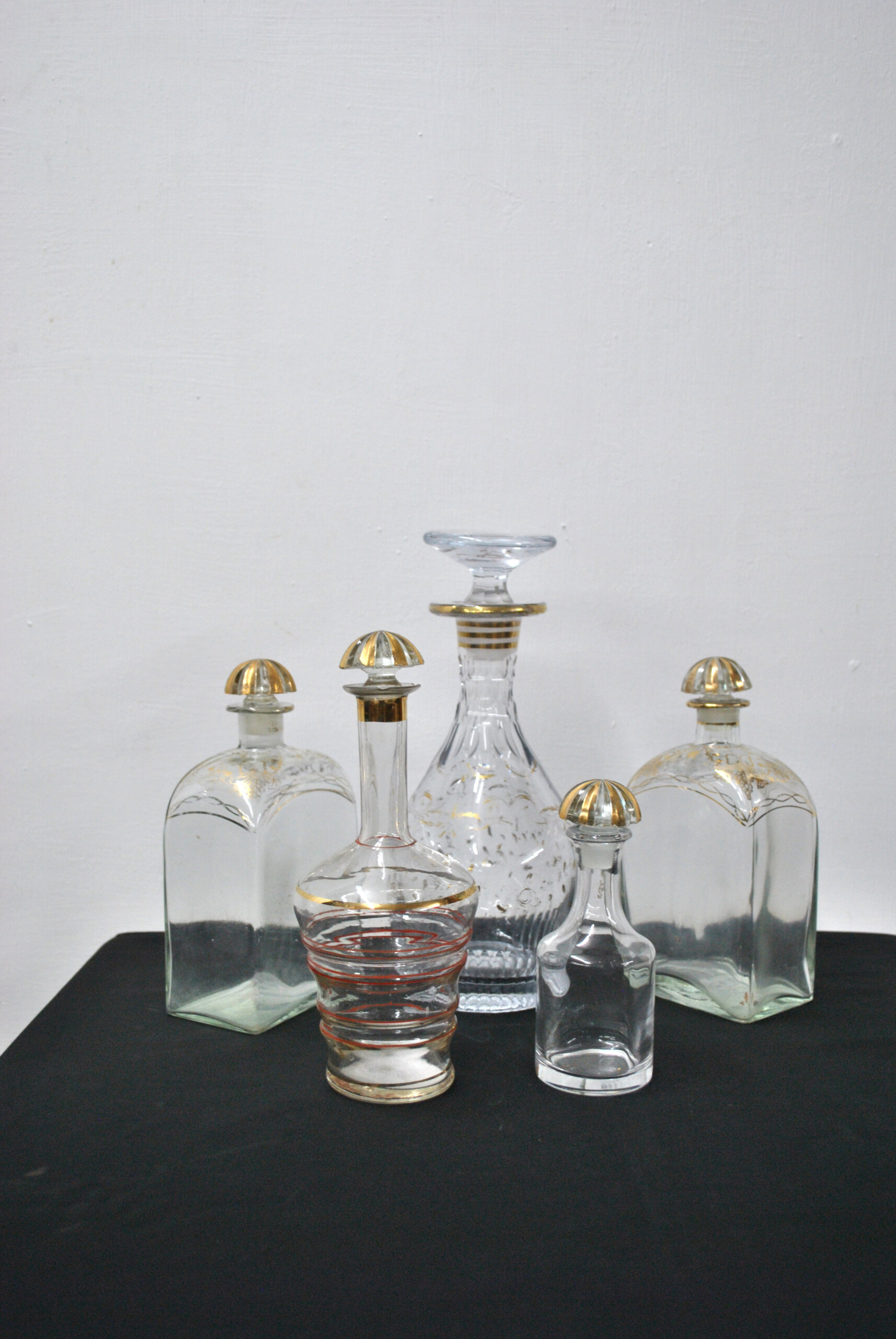 Destacan por sus tapones originales con detalle dorado y sus delicadas decoraciones: algunas con grabados y otras con finas líneas en dorado y rojo, que aportan un toque elegante y vintage. El conjunto incluye una licorera central más alta con talla decorativa, acompañada de otras botellas de líneas más sencillas pero muy armoniosas en conjunto.