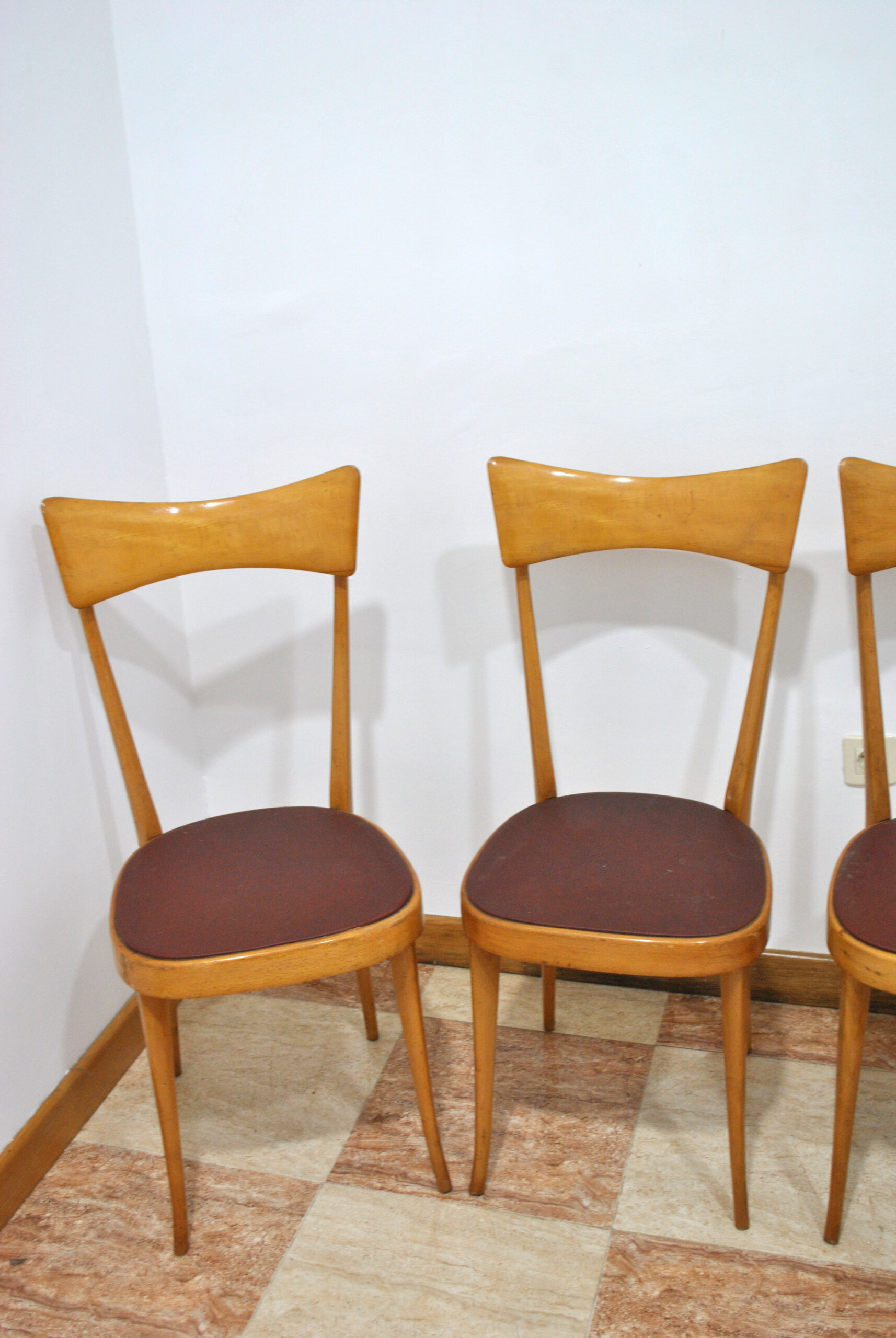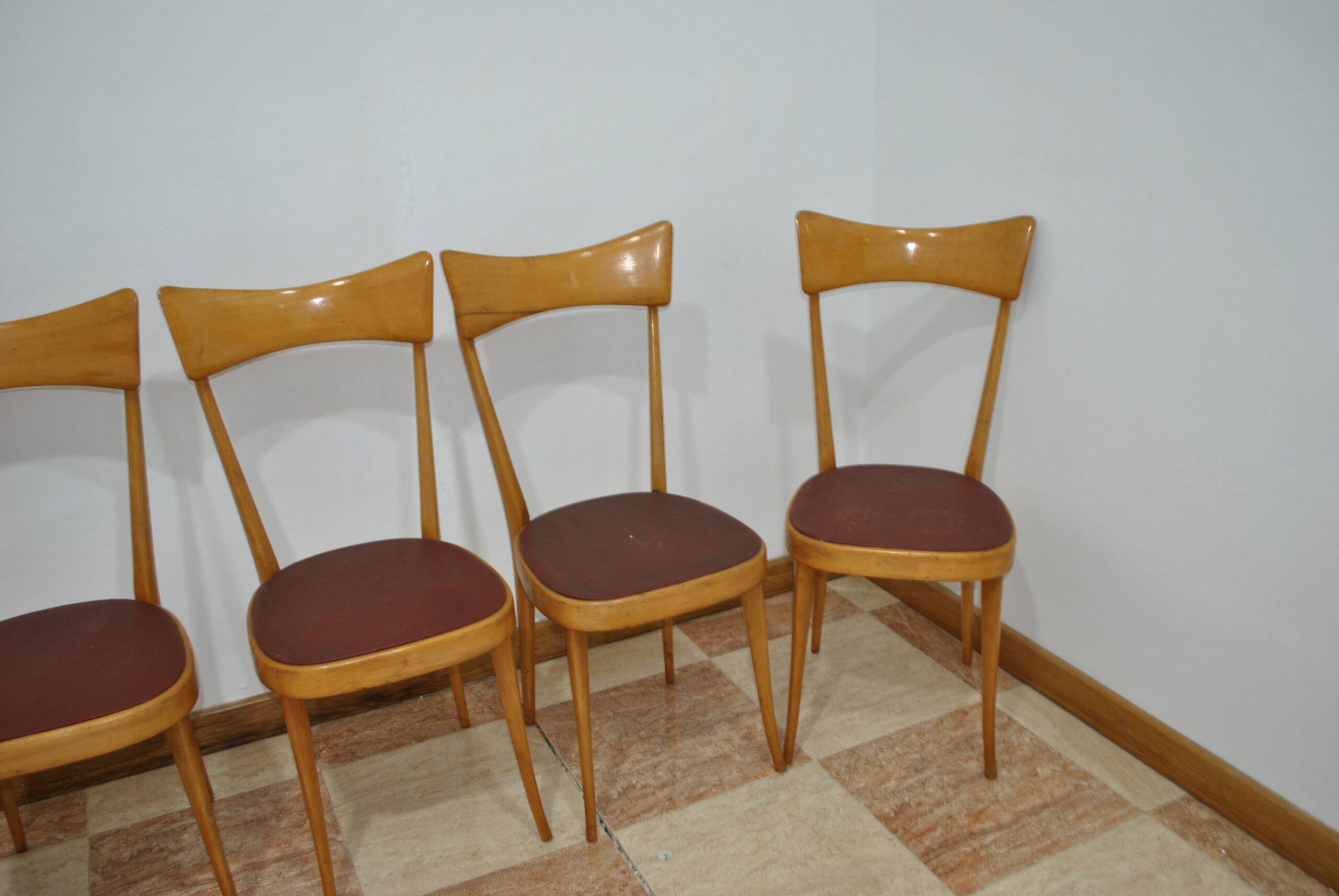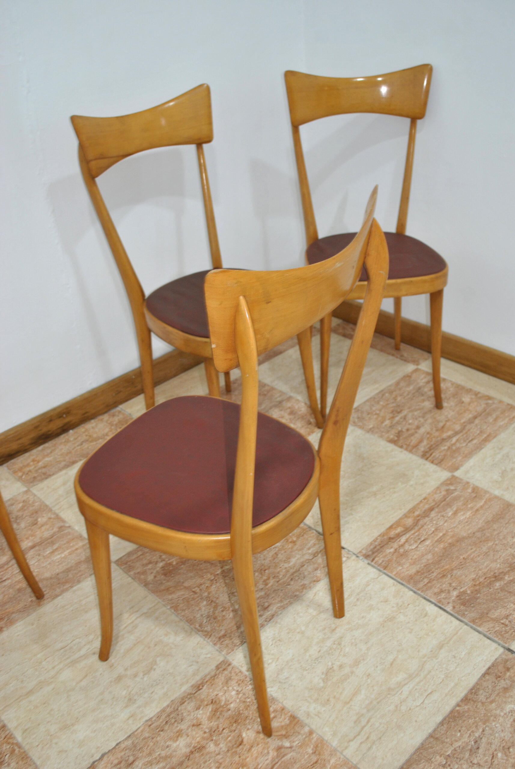Destacan por su respaldo curvado de una sola pieza, ligeramente cóncavo, que aporta comodidad y un diseño estilizado muy característico del mobiliario mid-century. Las patas son finas, ligeramente inclinadas y estilizadas, reforzando su estética ligera y elegante.