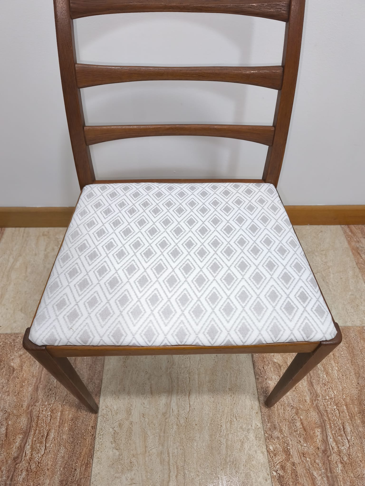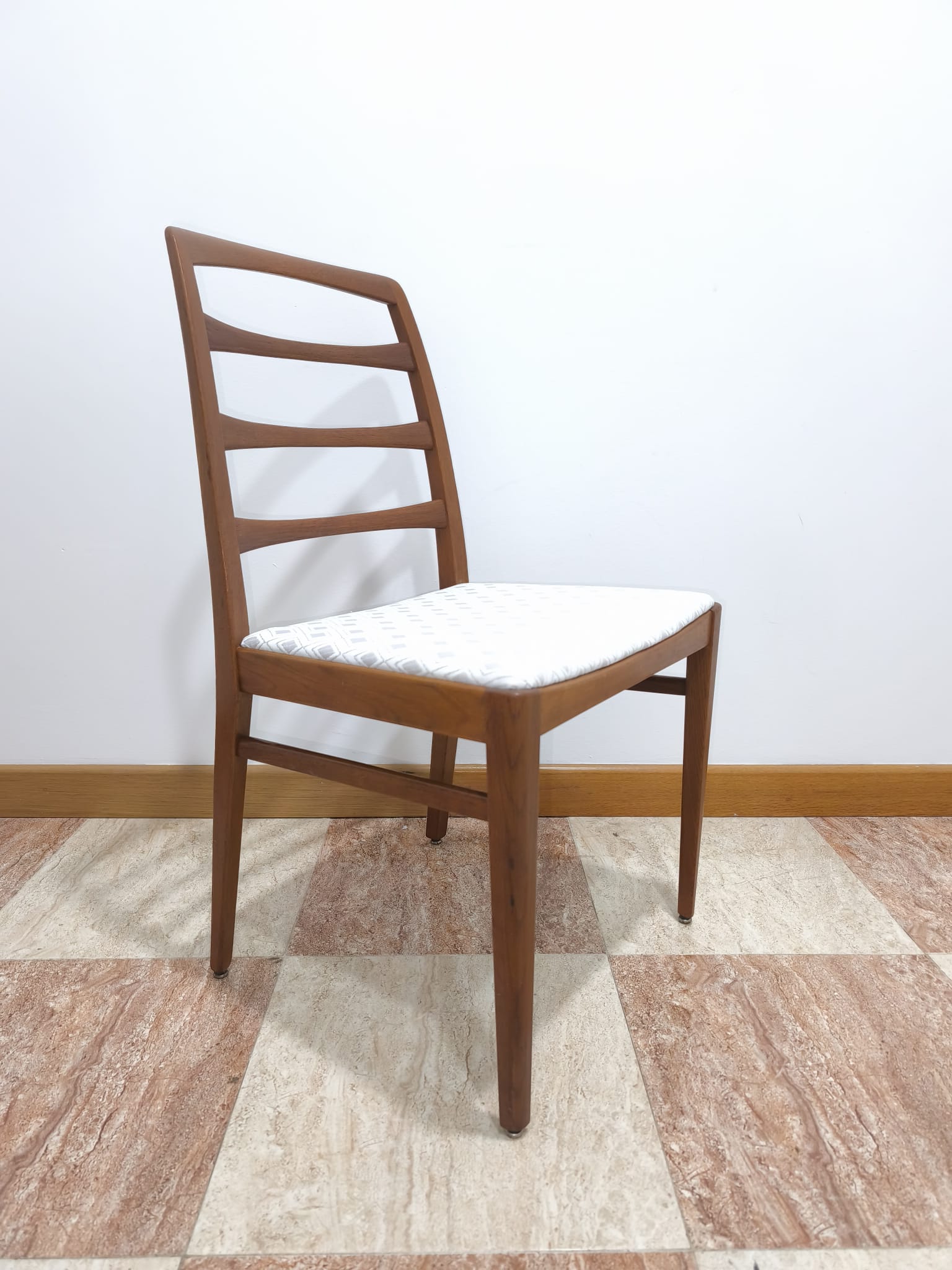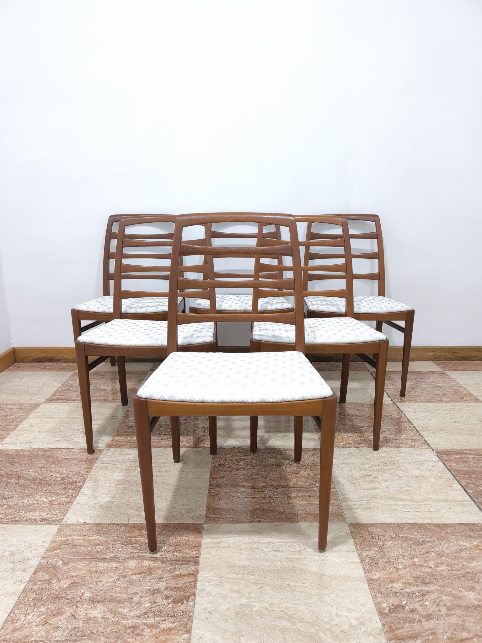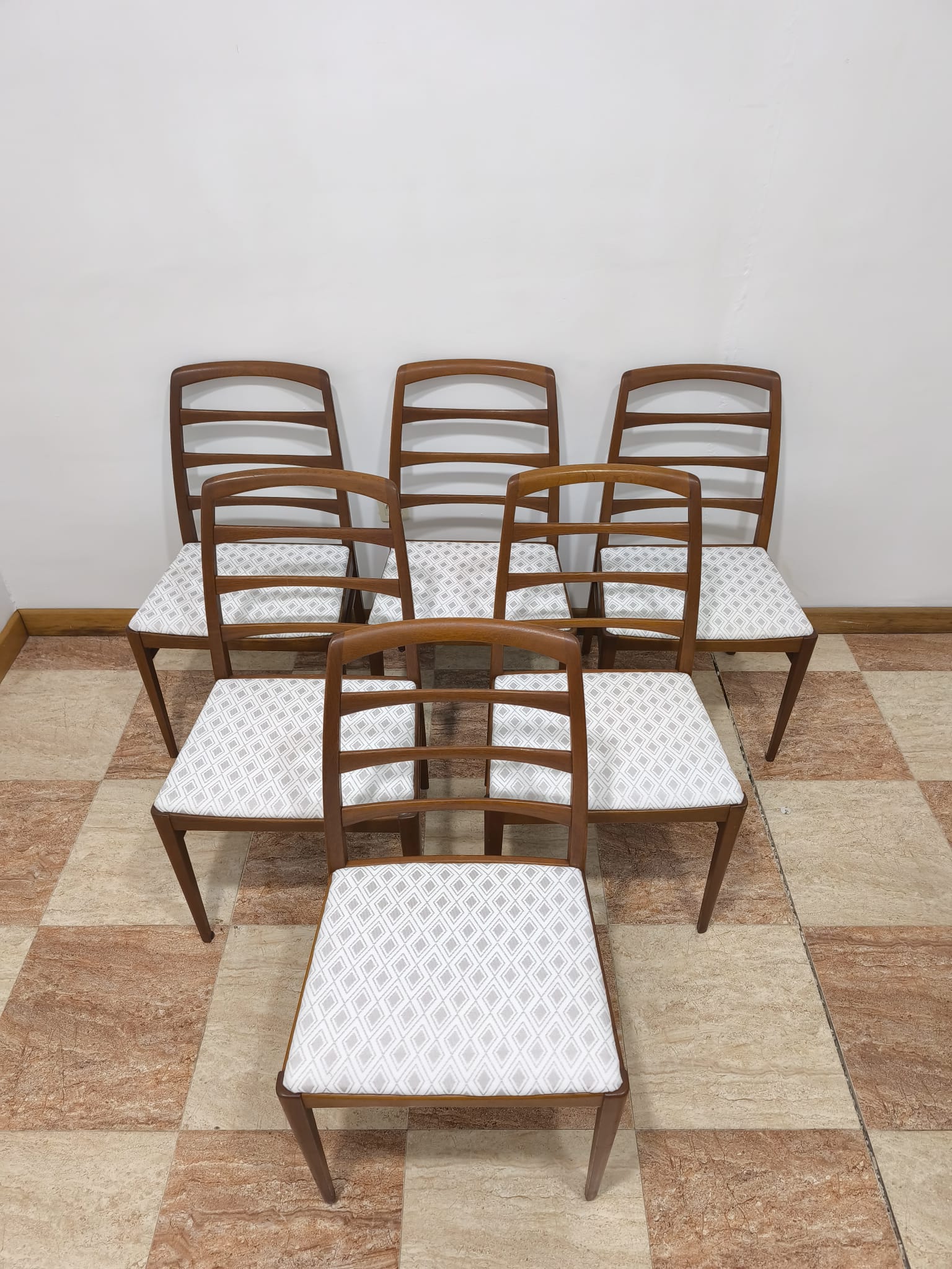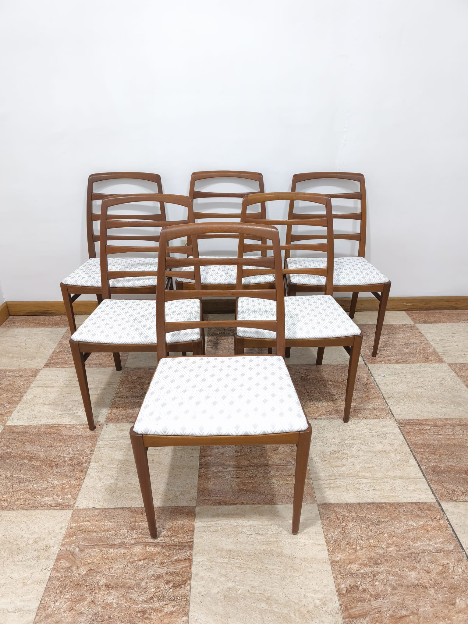 AJ0944 – Original conjunto de 6 sillas de comedor Suecas de 1959 realizadas en madera de roble maciza, diseñadas por Bertil Fridhagen para Bodafors, con tapicería nueva.