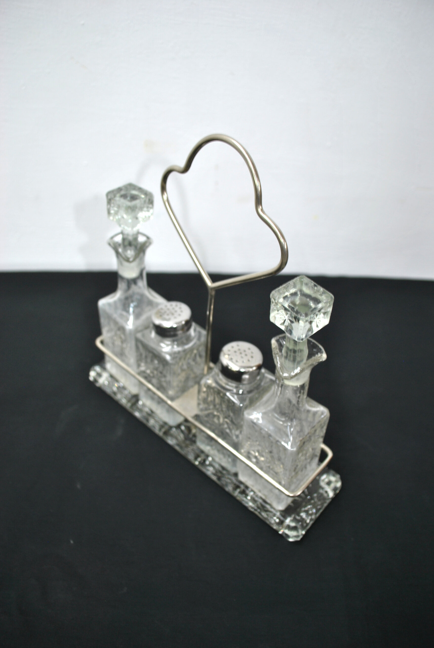 REF: 12371 – Elegante conjunto antiguo de vinagreras compuesto por piezas de cristal tallado, presentado sobre un soporte metálico con asa central en forma decorativa.