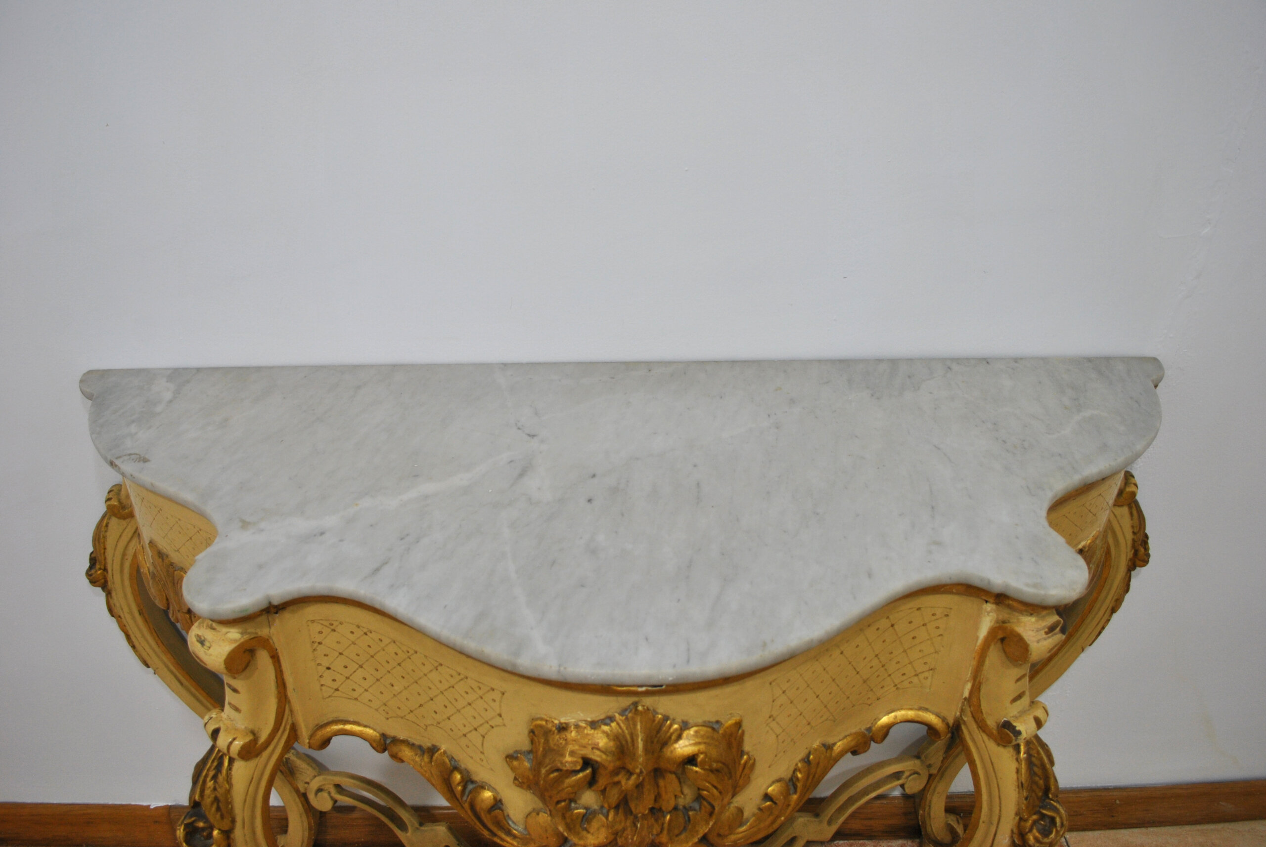El frente destaca por su medallón central con hojas de acanto en relieve, acompañado de delicados roleos y detalles grabados en la cintura. La pieza conserva su tapa original de mármol blanco veteado, de contorno moldurado y perfil ondulado, que realza su carácter noble y aporta un contraste refinado con la madera dorada.
