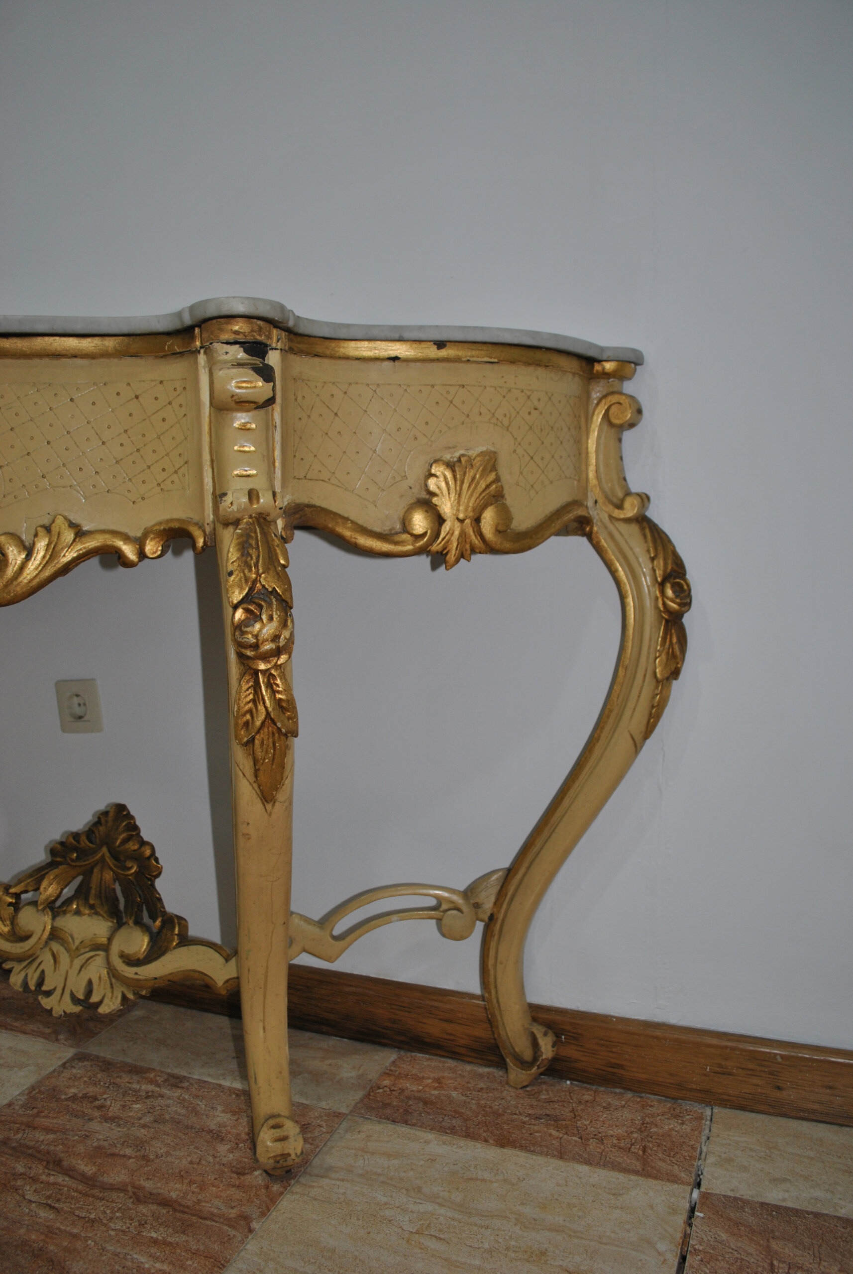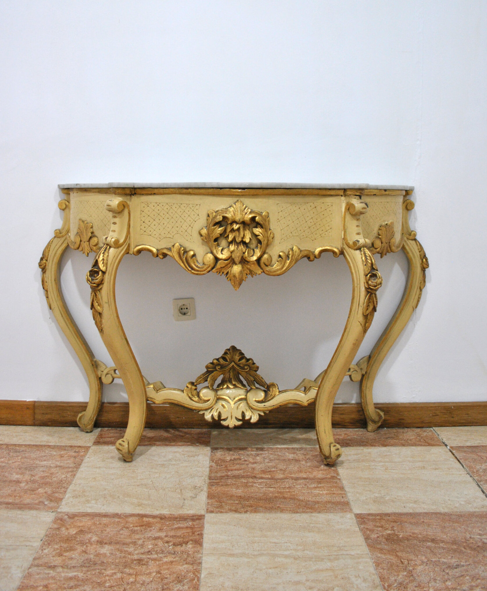 La consola cuenta con travesaño inferior decorado, aportando estabilidad y equilibrio visual al conjunto. Su tonalidad crema patinada combinada con dorados envejecidos le confiere un encanto especial, propio de piezas con historia.