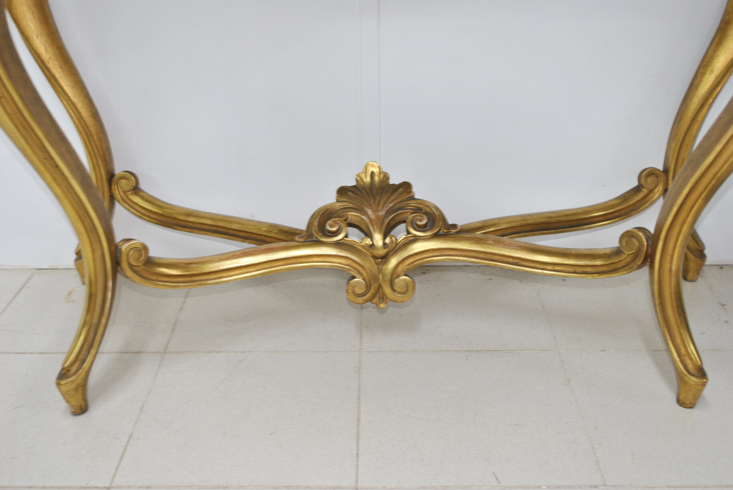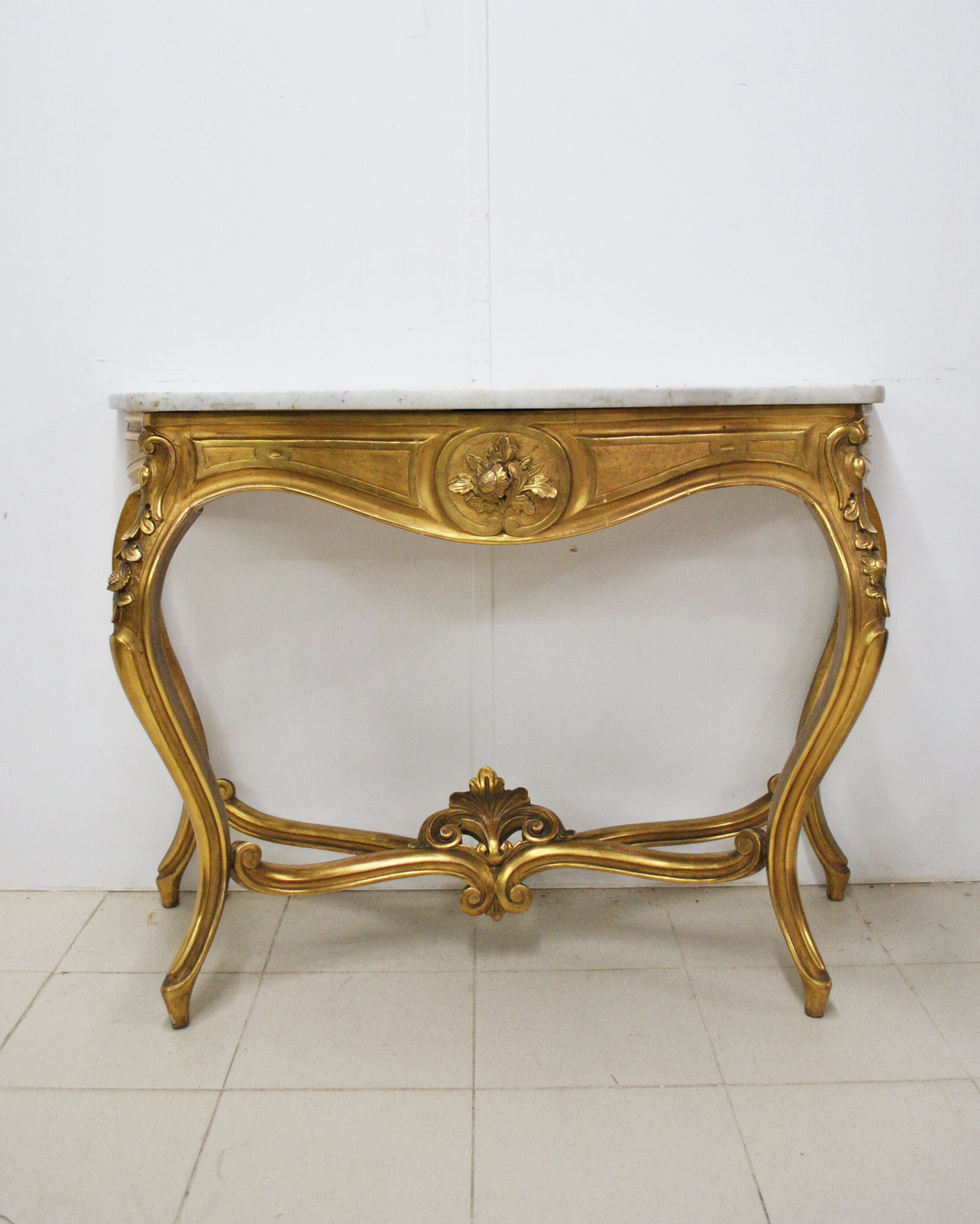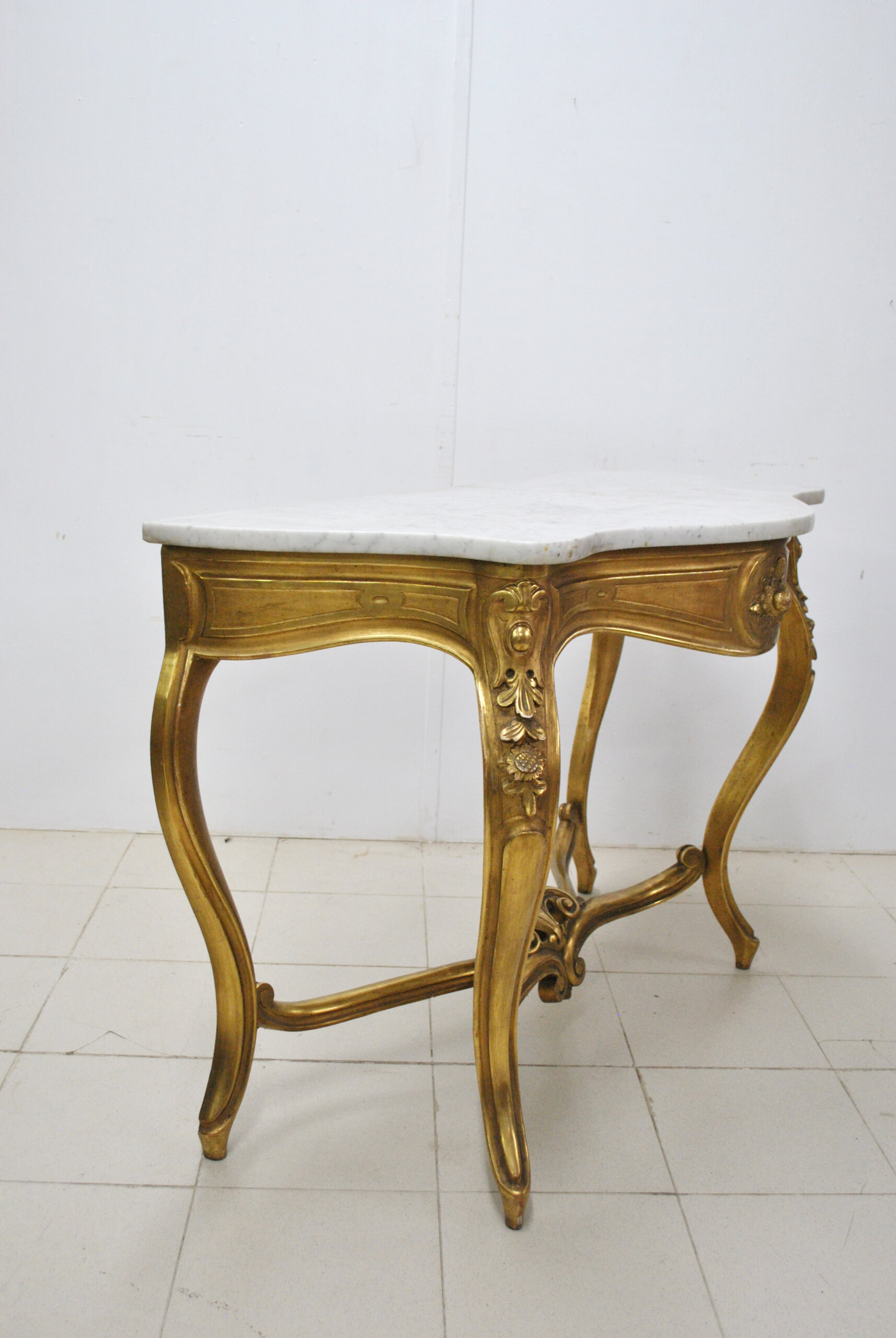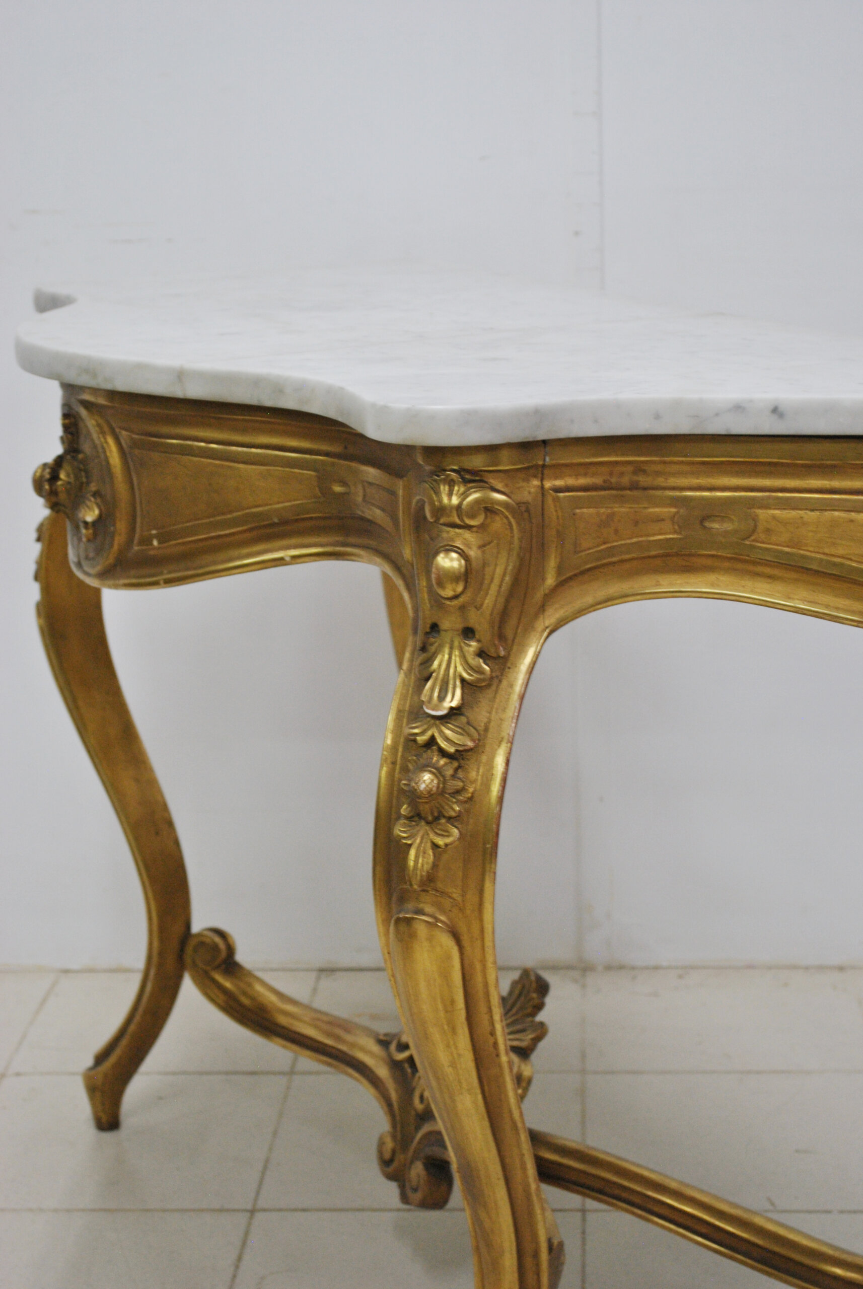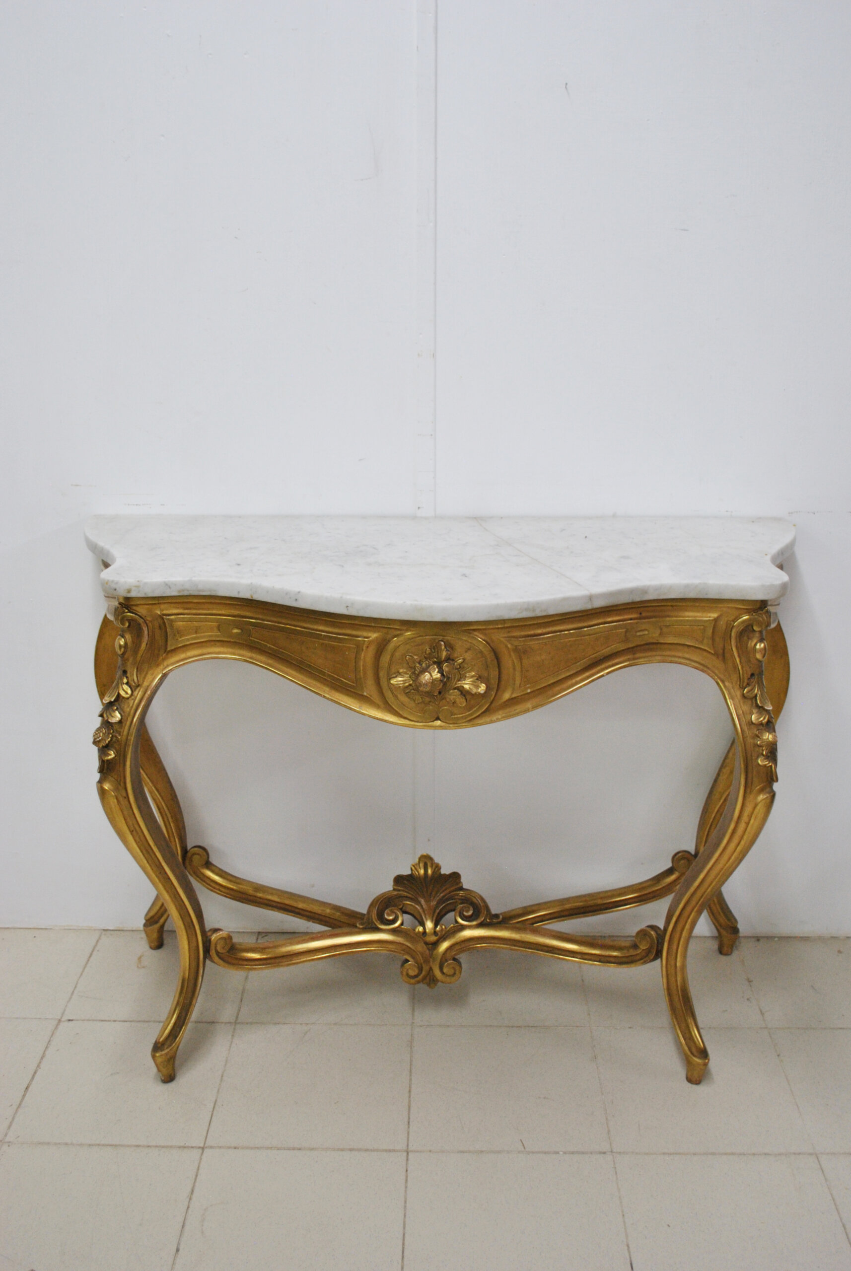 REF: 11892 – Elegante consola estilo Luis XV elaborada en madera tallada y dorada al pan de oro, con una cubierta de mármol blanco veteado de forma sinuosa. Su diseño curvilíneo y equilibrado resalta por los finos detalles ornamentales en relieve, como las guirnaldas florales y hojas de acanto que adornan las patas y el frente. Las patas cabriolé se unen mediante un travesaño decorativo central, aportando estabilidad. La pieza se encuentra en buen estado general, conserva su dorado original con ligera pátina que realza su autenticidad.