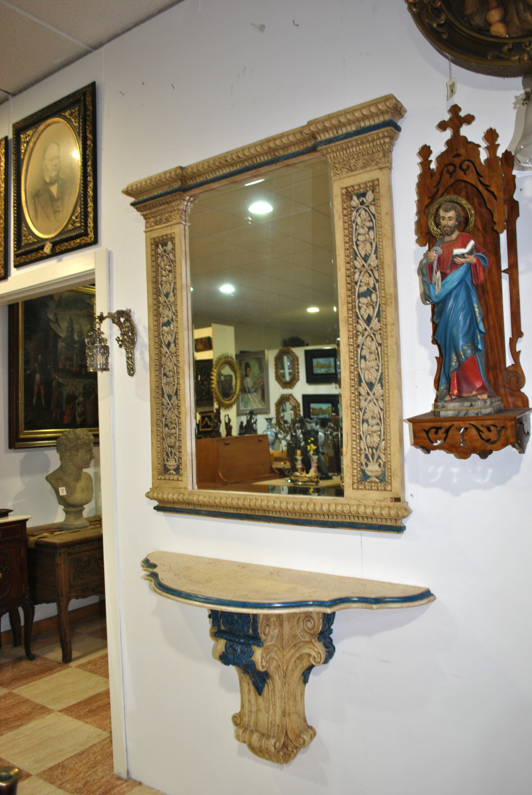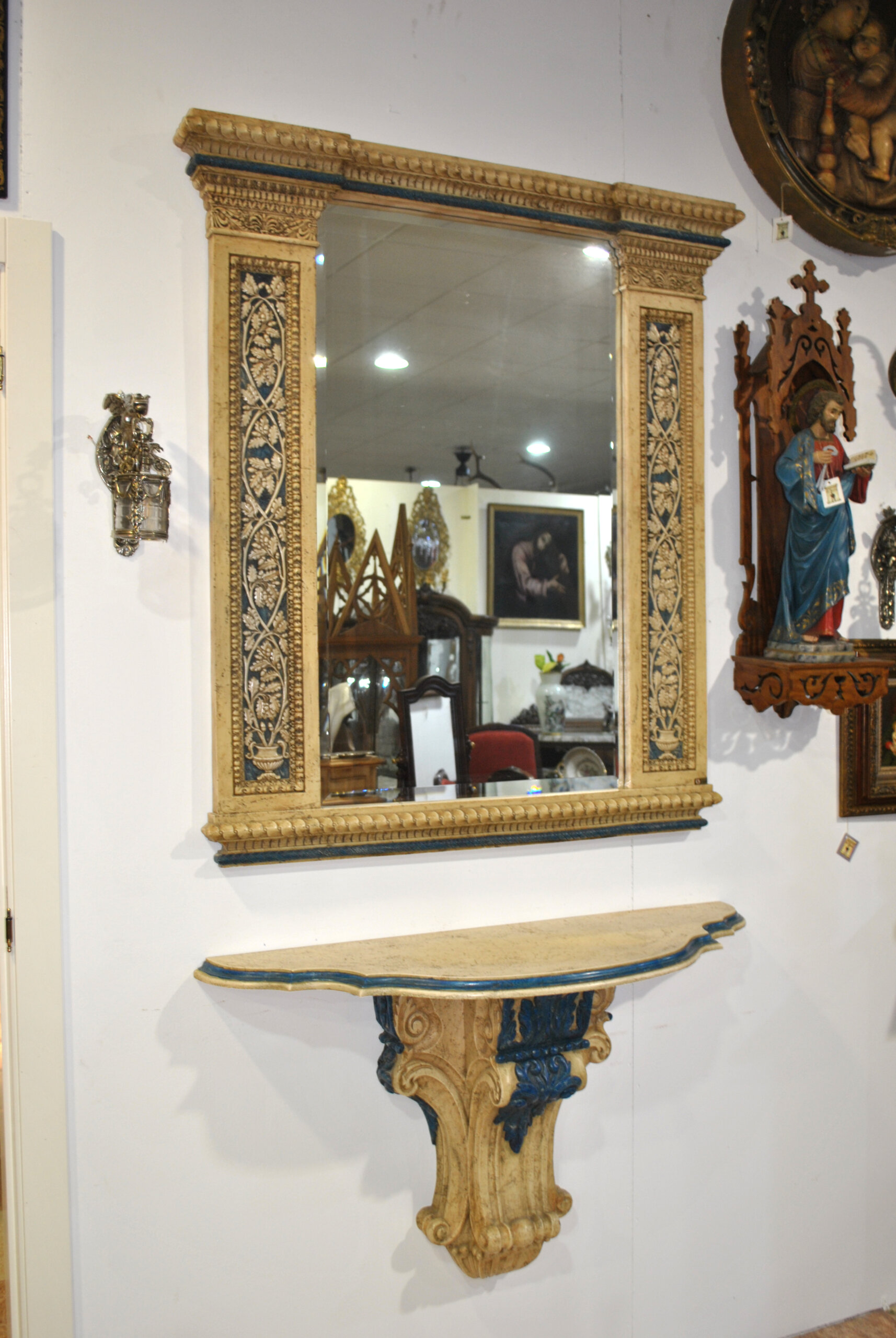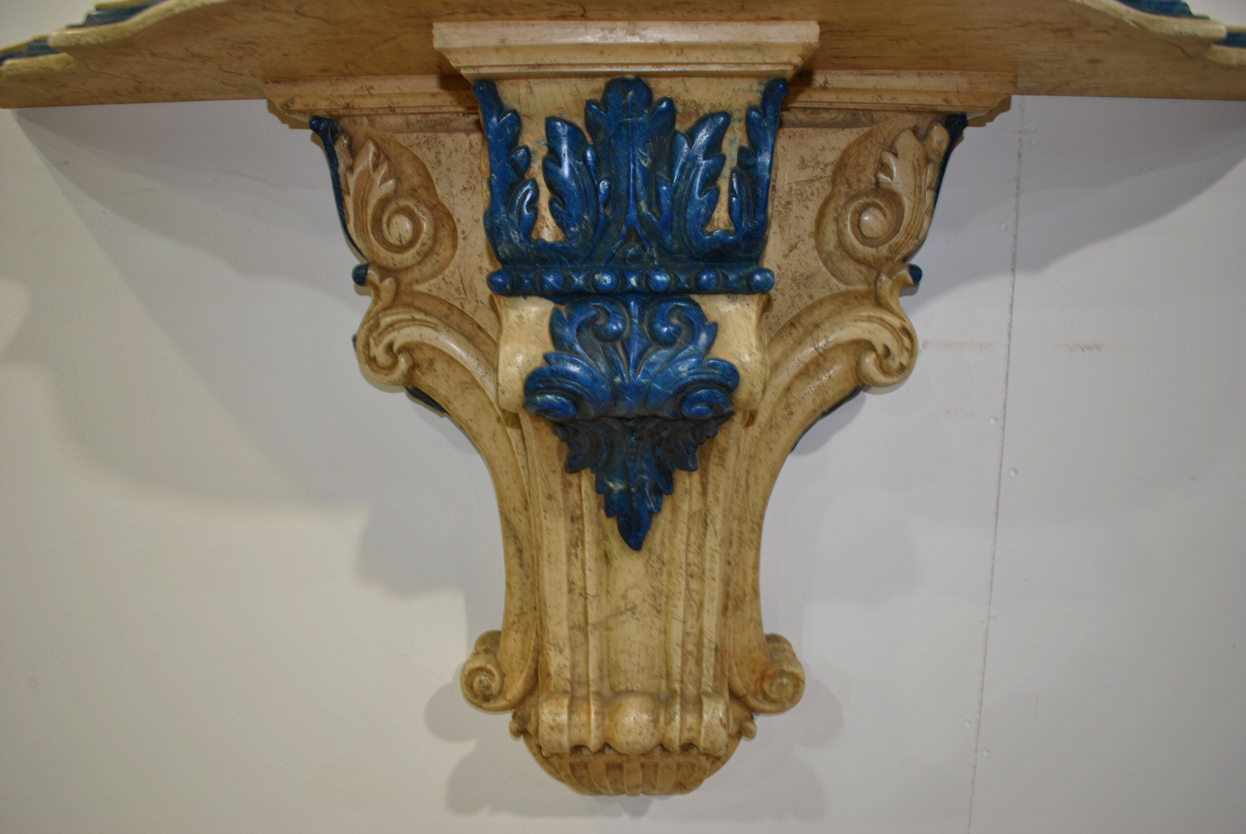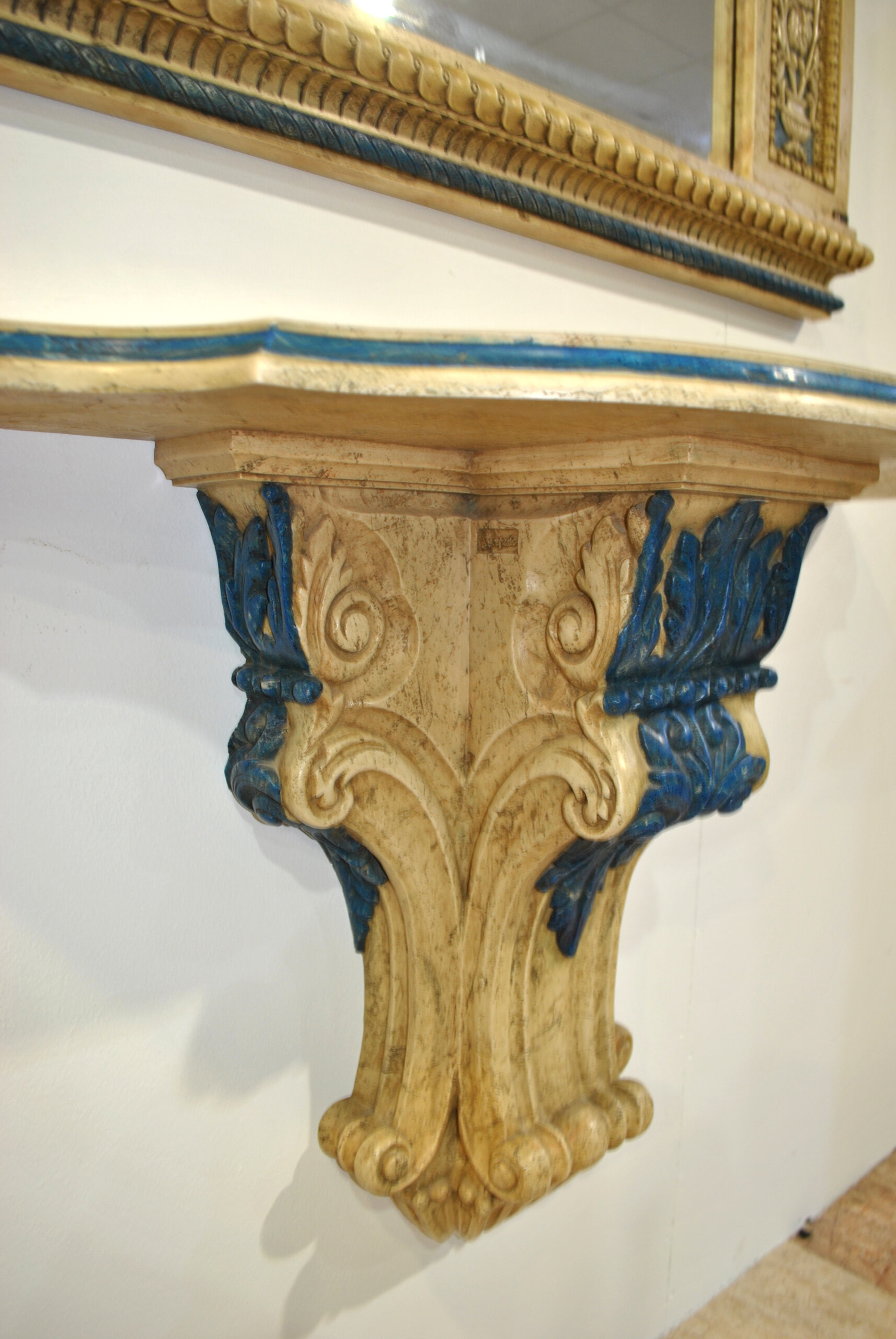 La consola mural, concebida como complemento perfecto, muestra un diseño de perfil sinuoso con molduración en azul y soporte central decorado con hojas de acanto en relieve. La armonía cromática entre ambas piezas crea un conjunto elegante, equilibrado y de gran impacto visual.