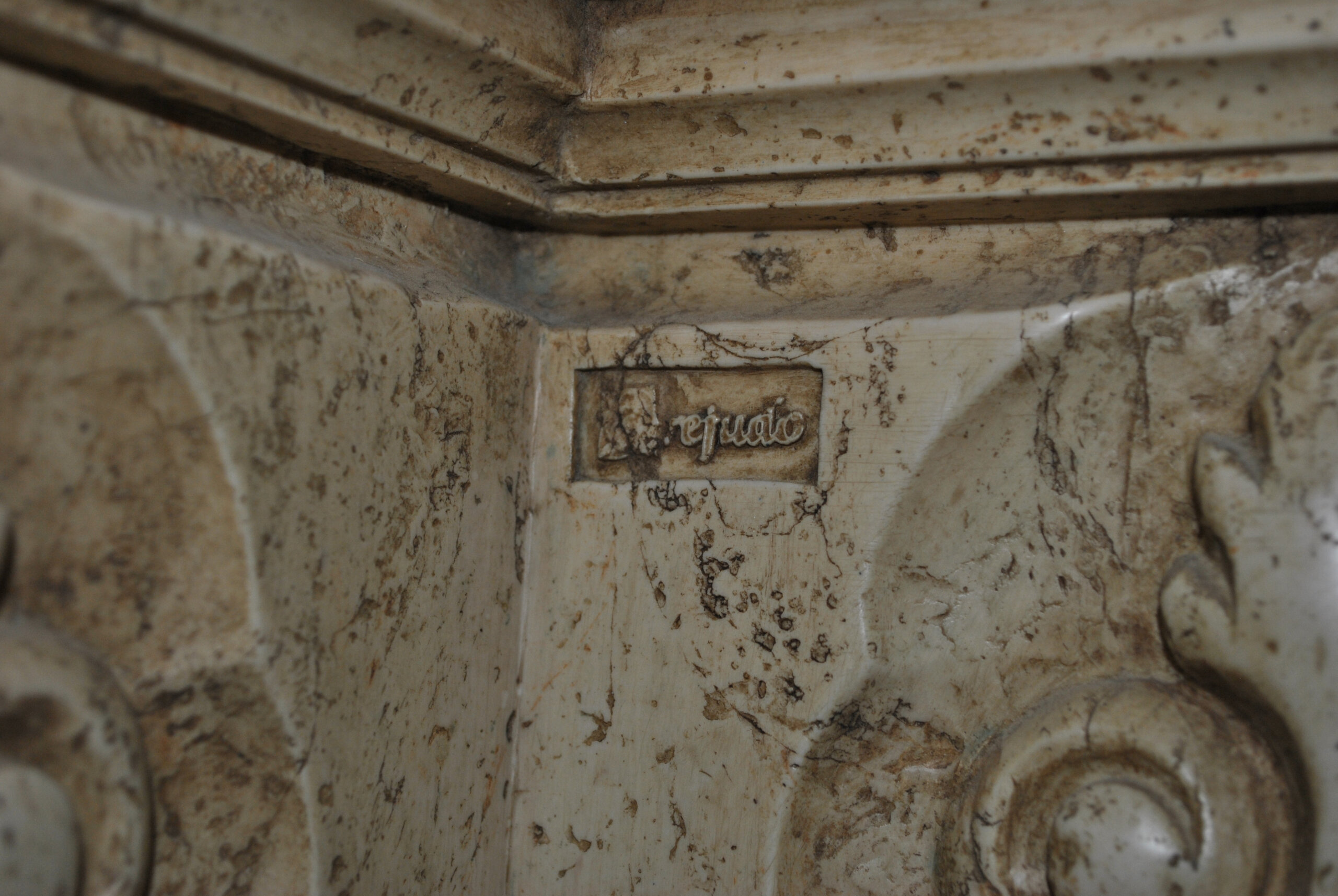 La firma “Orejudo” visible en la estructura certifica su autoría, tratándose de un escultor reconocido por sus trabajos de carácter historicista y decorativo, muy apreciados en interiores clásicos y eclécticos.