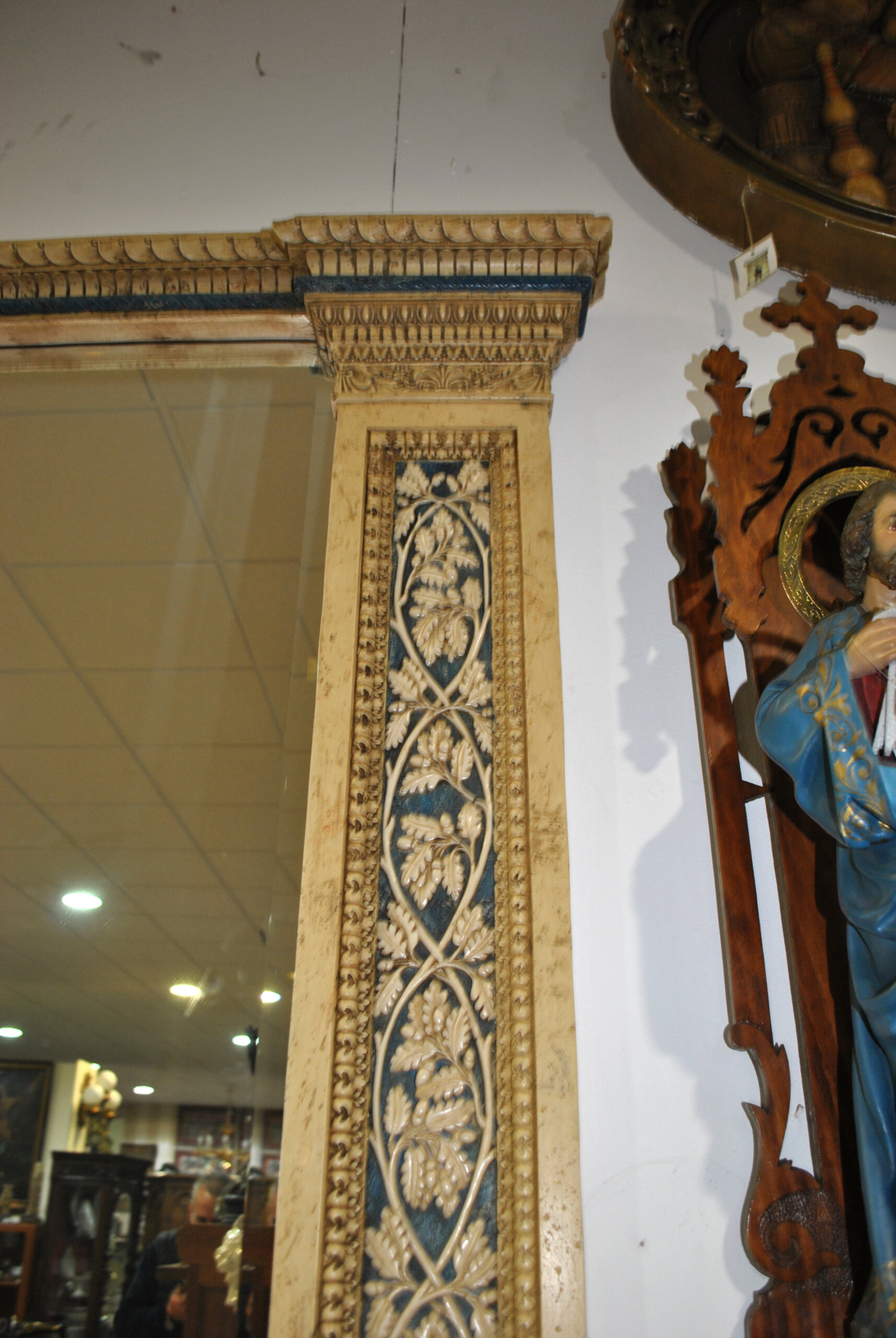 El espejo presenta una estructura arquitectónica de inspiración clásica, con laterales decorados mediante paneles verticales en relieve con guirnaldas vegetales entrelazadas, hojas de acanto y cráteras clásicas sobre fondo azul. La parte superior se remata con potente cornisa moldurada y rica ornamentación en relieve, aportando presencia y monumentalidad al conjunto.