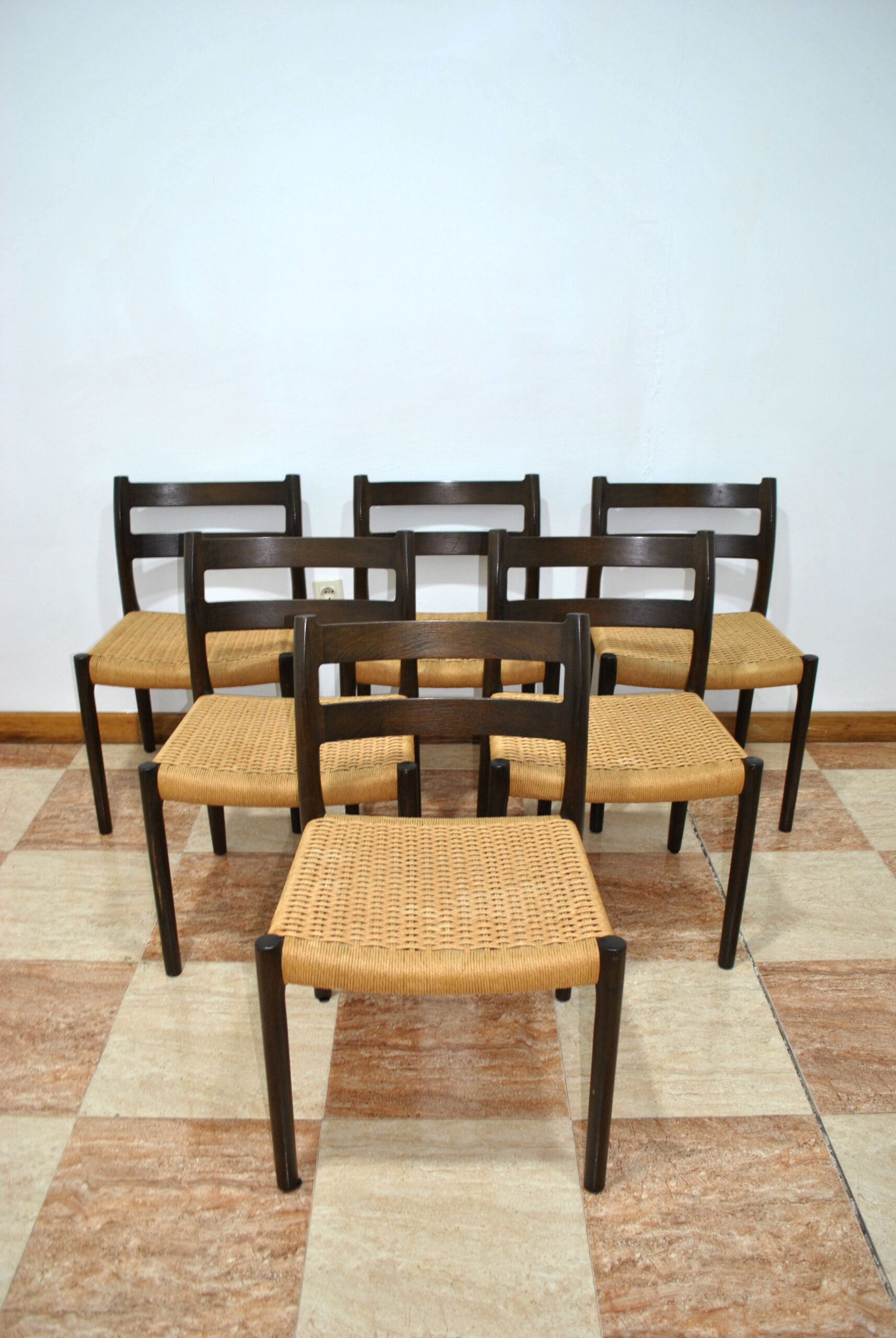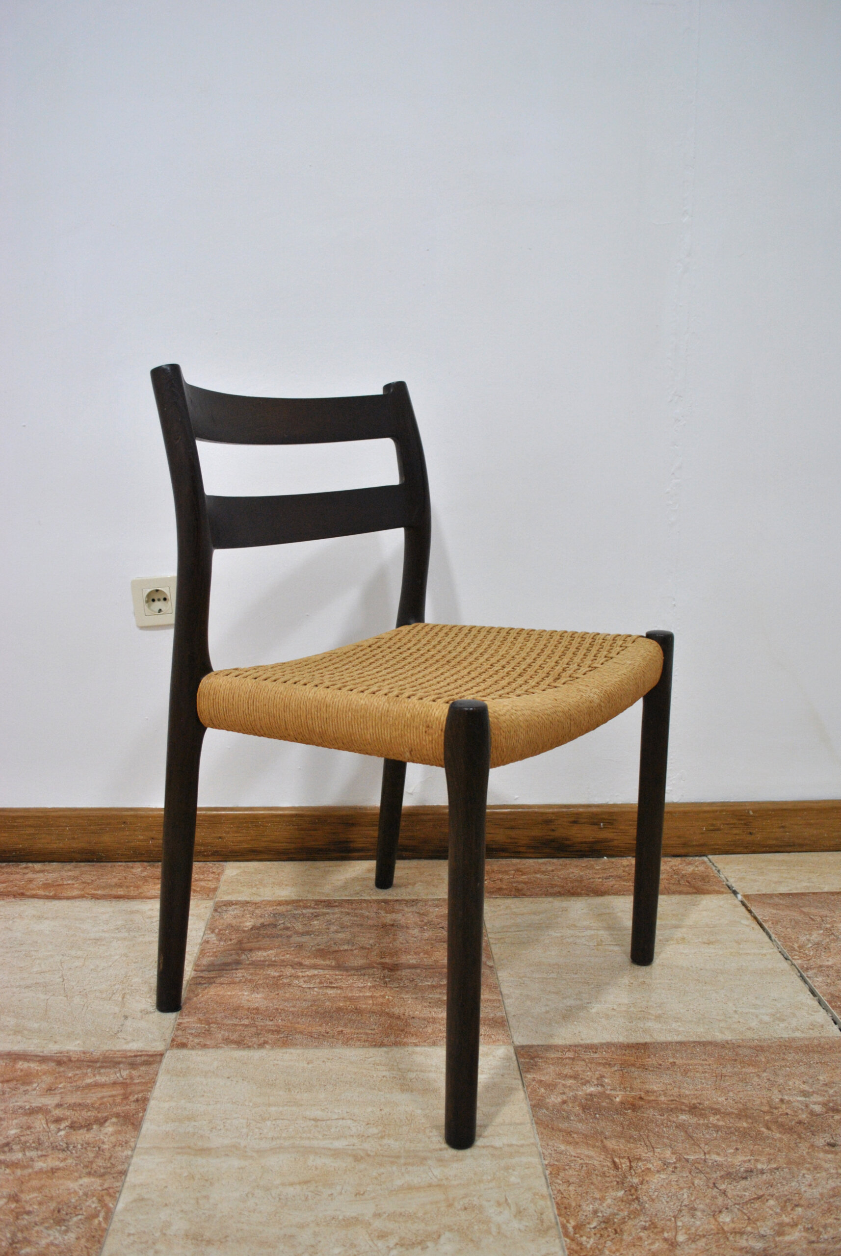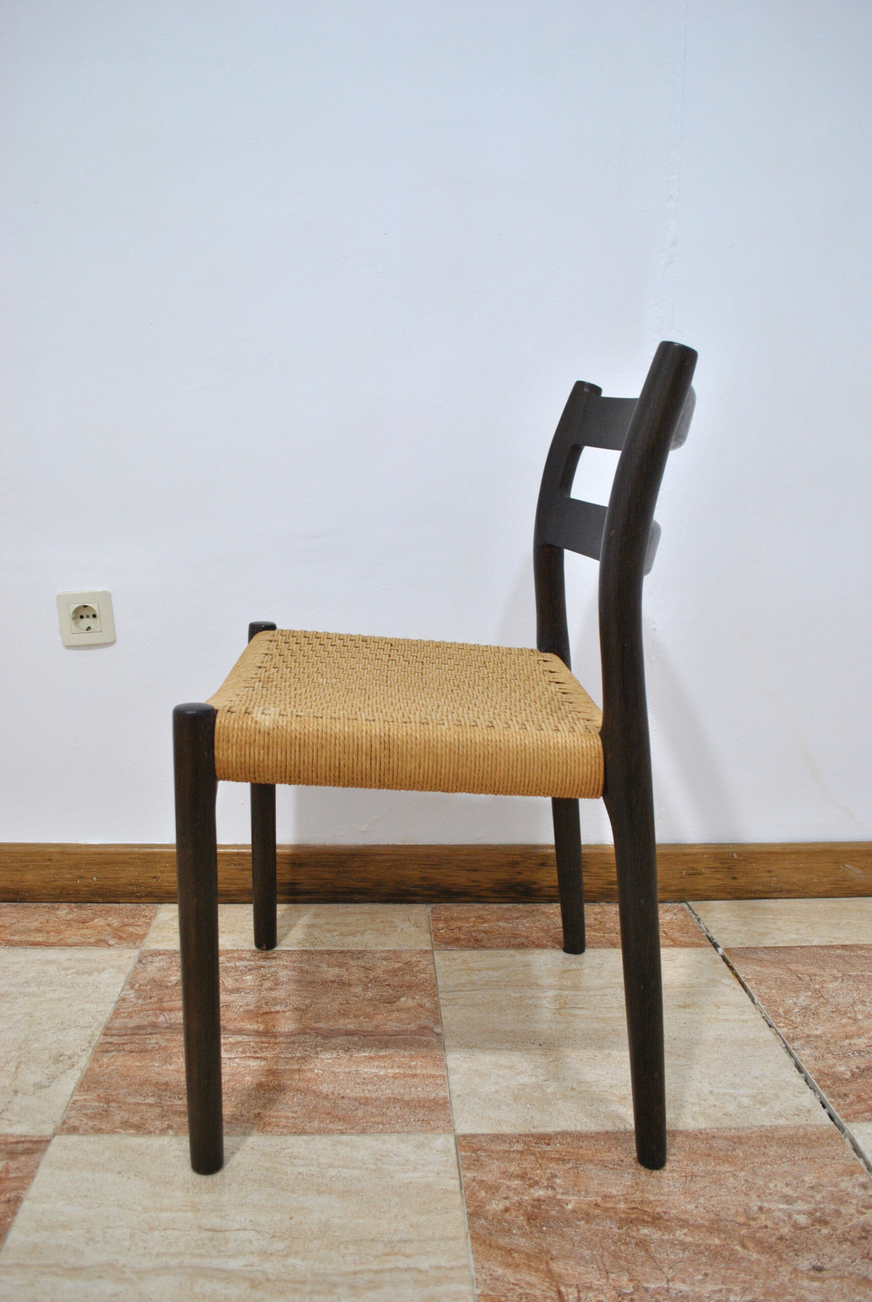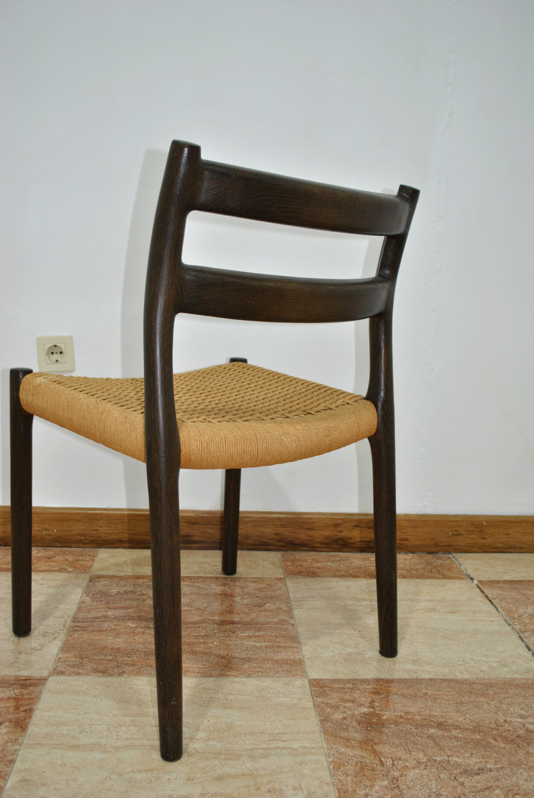 Realizadas en madera maciza teñida en tono oscuro, presentan respaldo curvado con doble travesaño horizontal y patas cilíndricas estilizadas, características del lenguaje formal de Møller. El asiento está tejido en enea natural (papel trenzado), técnica tradicional danesa que aporta comodidad, resistencia y una estética cálida y refinada.