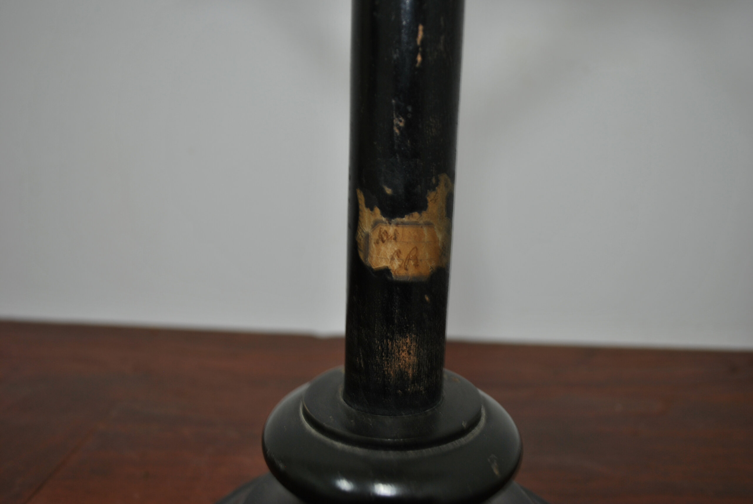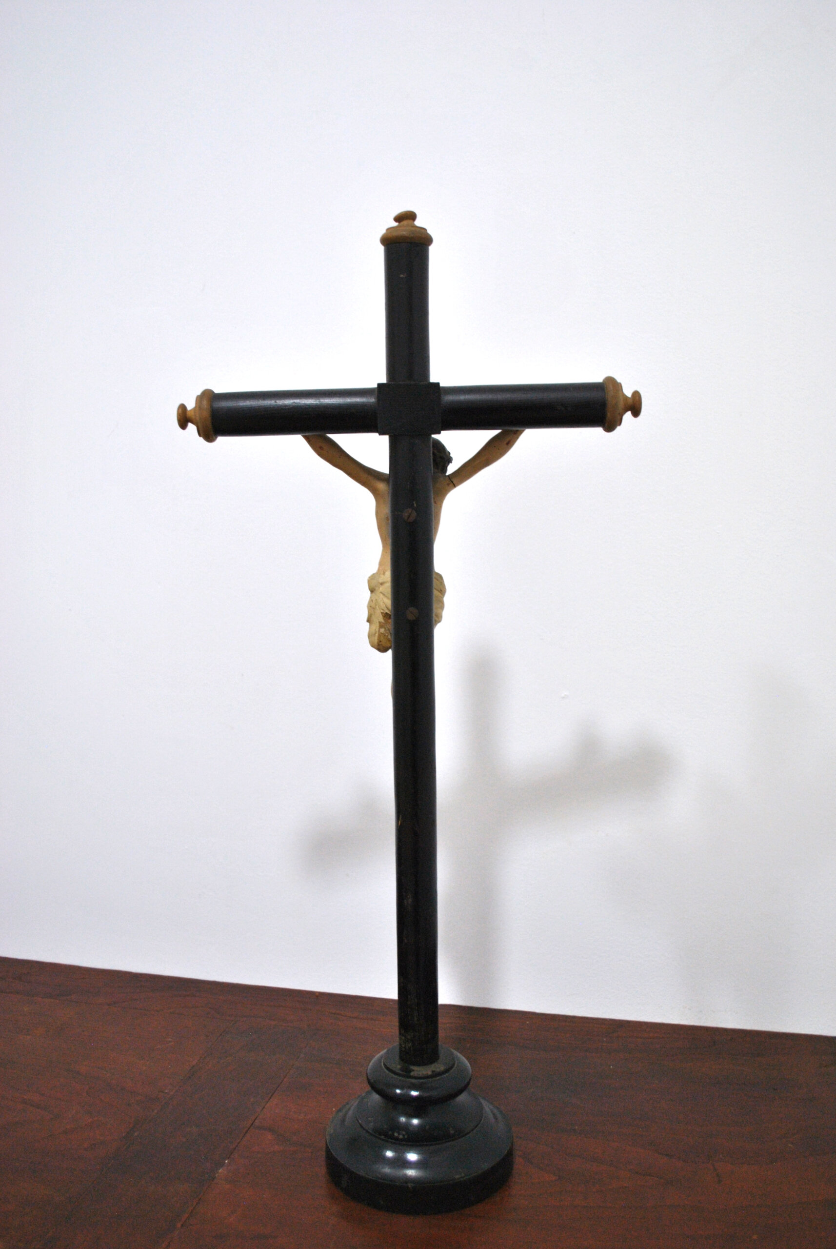 La cruz, de líneas sobrias y remates cilíndricos en los extremos, descansa sobre base torneada circular escalonada, lo que permite su colocación como pieza de sobremesa o altar doméstico.