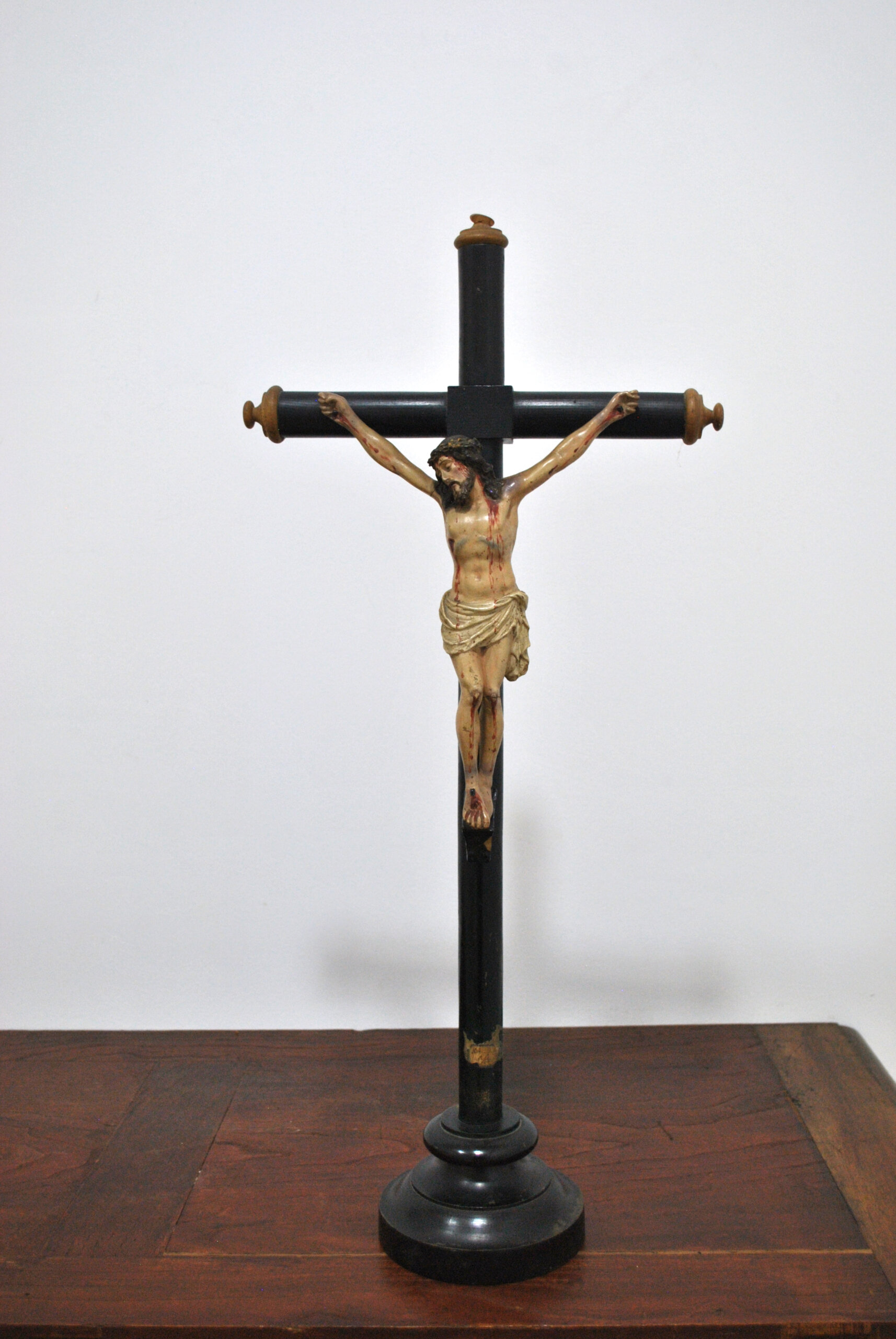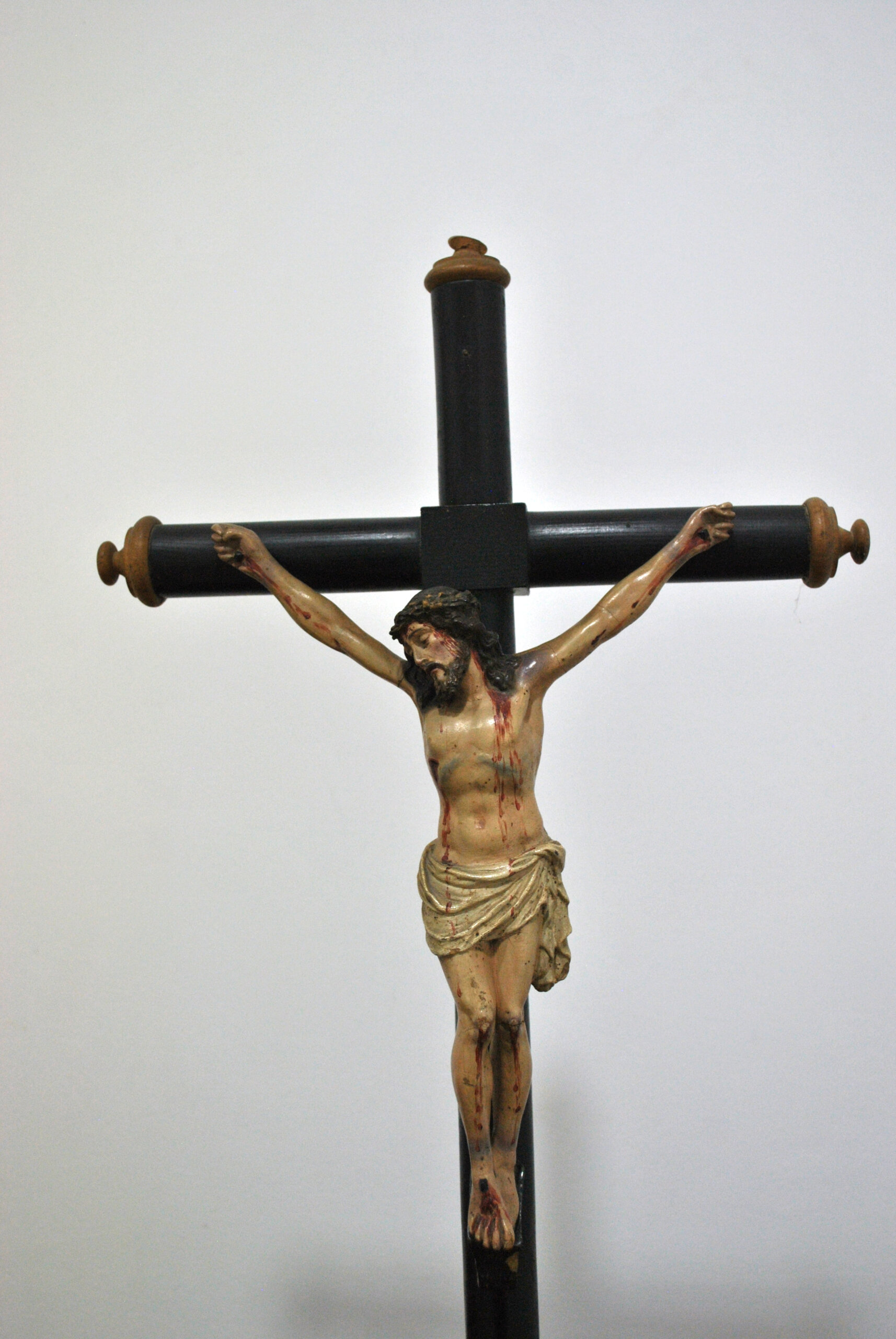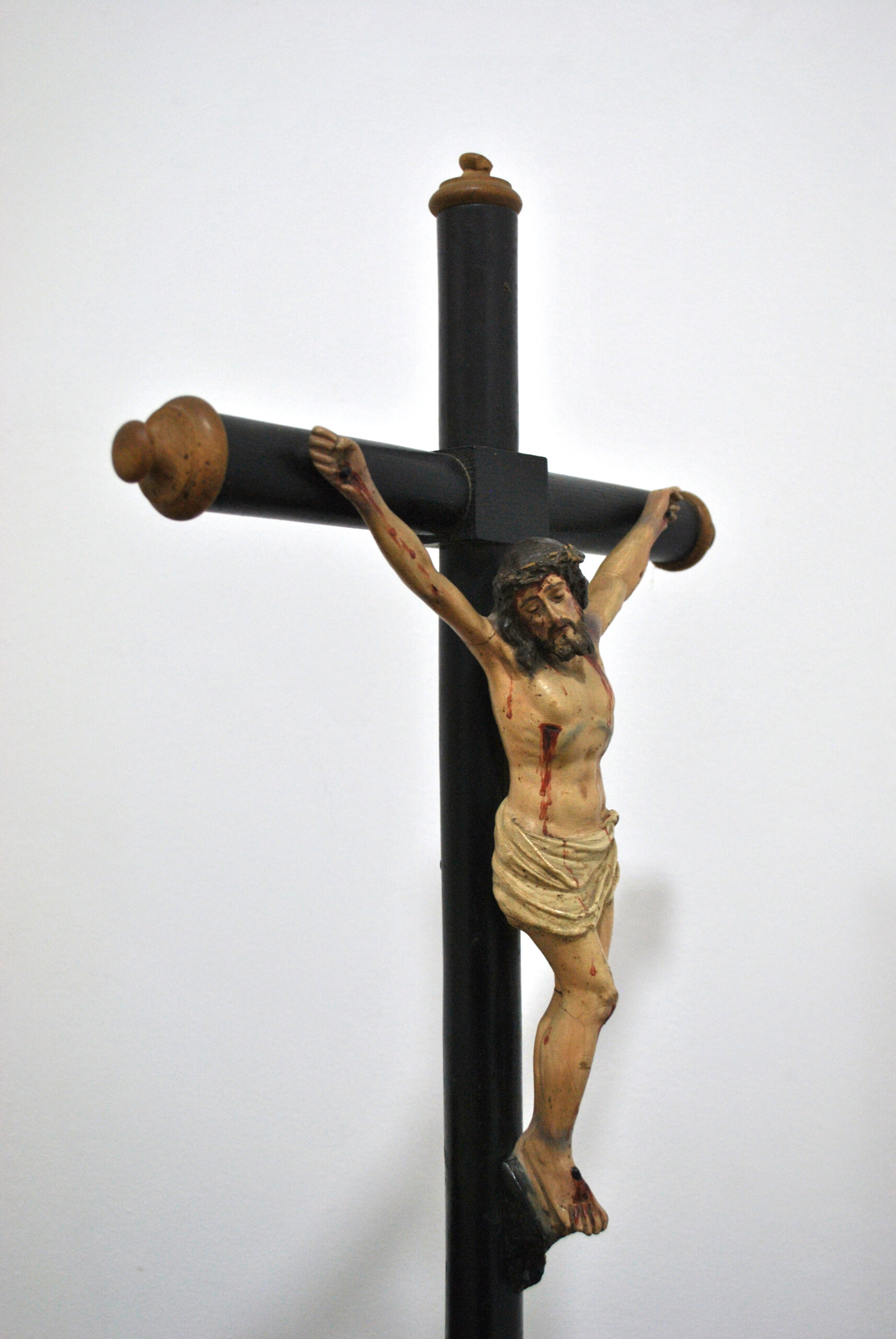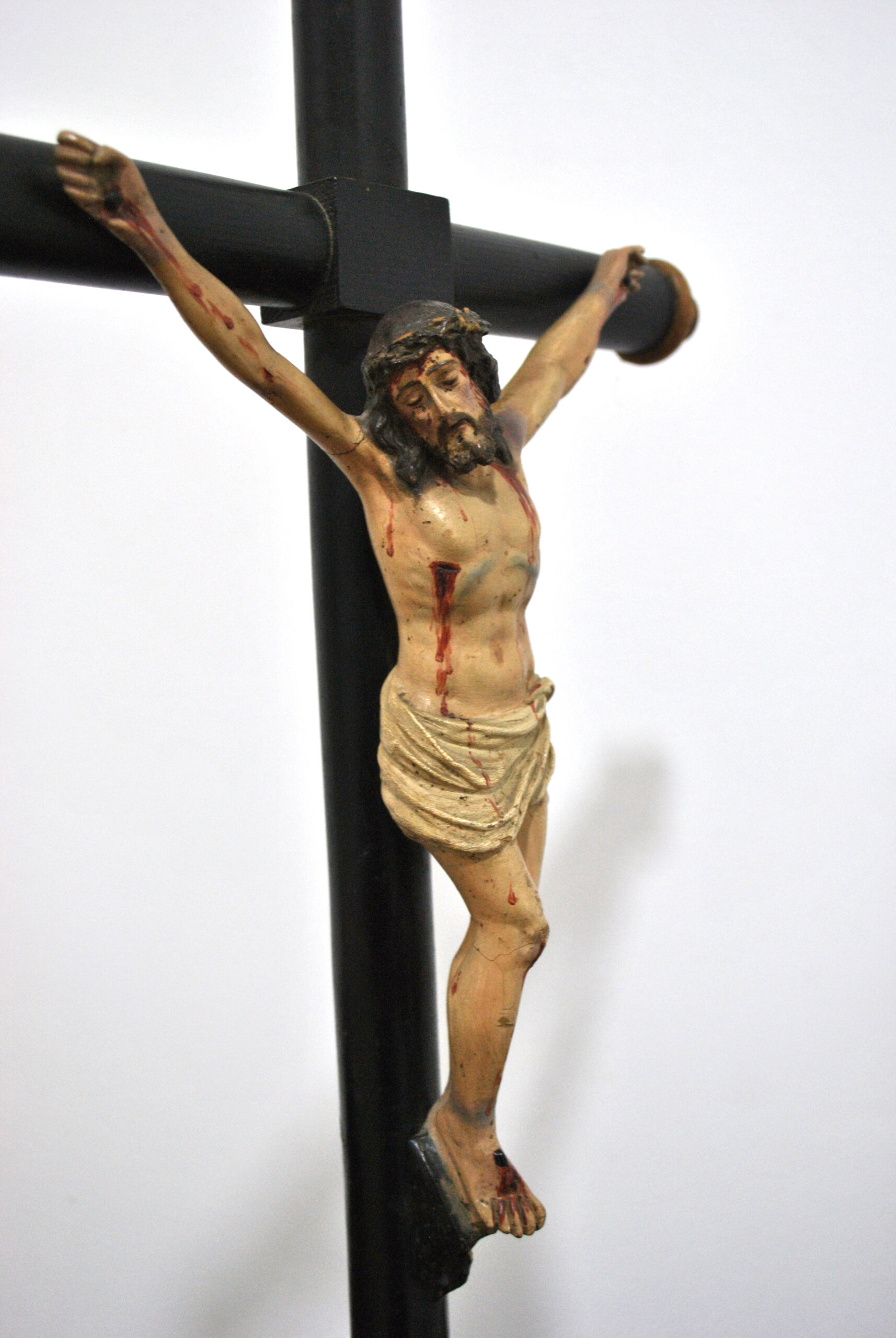 REF: 12182 – Crucifijo antiguo compuesto por una imagen de Cristo tallada y policromada, fijada sobre cruz de madera torneada en acabado oscuro. La figura presenta un modelado expresivo y naturalista, con cuidada anatomía y detallada policromía que resalta las heridas y la representación del sacrificio, siguiendo la tradición iconográfica cristiana.